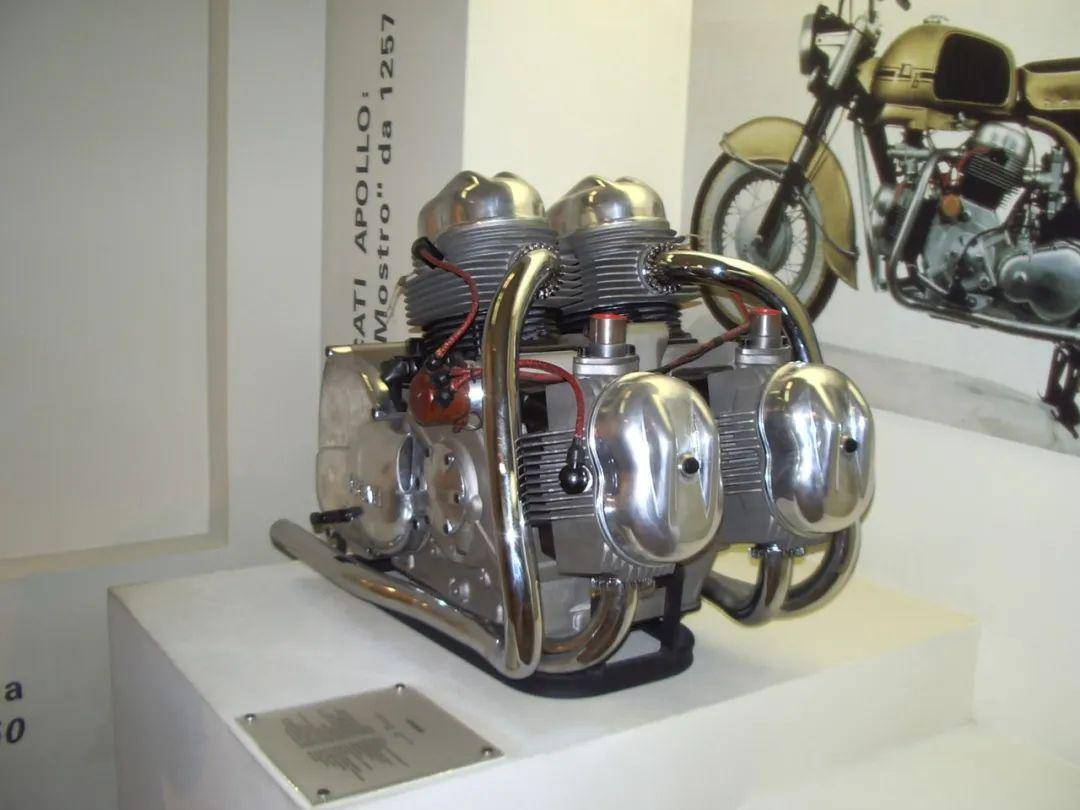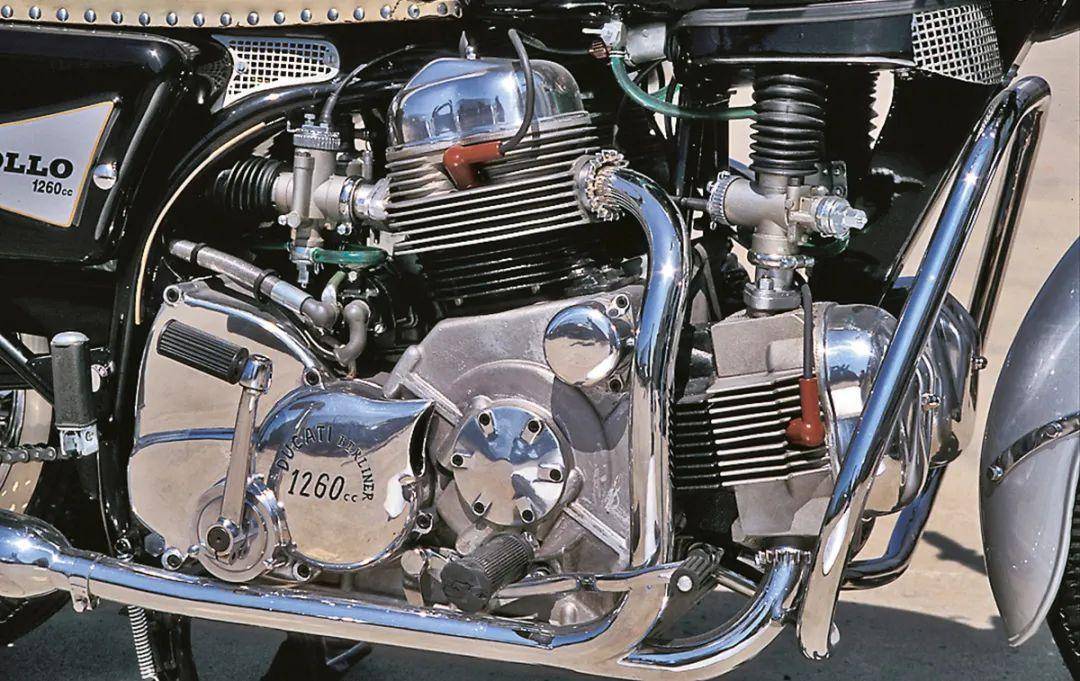 “阿波羅”搭載了空氣冷卻的V型四缸發(fā)動(dòng)機(jī),造型很有個(gè)性,幾乎就是一個(gè)傾斜的正方形。為有效抑制震動(dòng)、增強(qiáng)騎乘舒適度,V型四缸設(shè)計(jì)成90°夾角,采用了180°點(diǎn)火間隔,4只活塞成雙地上下運(yùn)動(dòng)。為了滿(mǎn)足美國(guó)警方要求,這臺(tái)V4發(fā)動(dòng)機(jī)采用了84.5mm× 56mm的缸徑和沖程,缸徑?jīng)_程比達(dá)到1.51,這是此前泰戈里奧尼從來(lái)沒(méi)用過(guò)的設(shè)計(jì);相應(yīng)地,獲得了1256mL的汽缸排量,而當(dāng)時(shí)最大哈雷摩托車(chē)Duo Glide汽缸排量也只有1215mL。由于發(fā)動(dòng)機(jī)采用了鋁合金材料,幫助控制整車(chē)重量,271kg的車(chē)重比同級(jí)別的哈雷摩托車(chē)足足少了20kg。