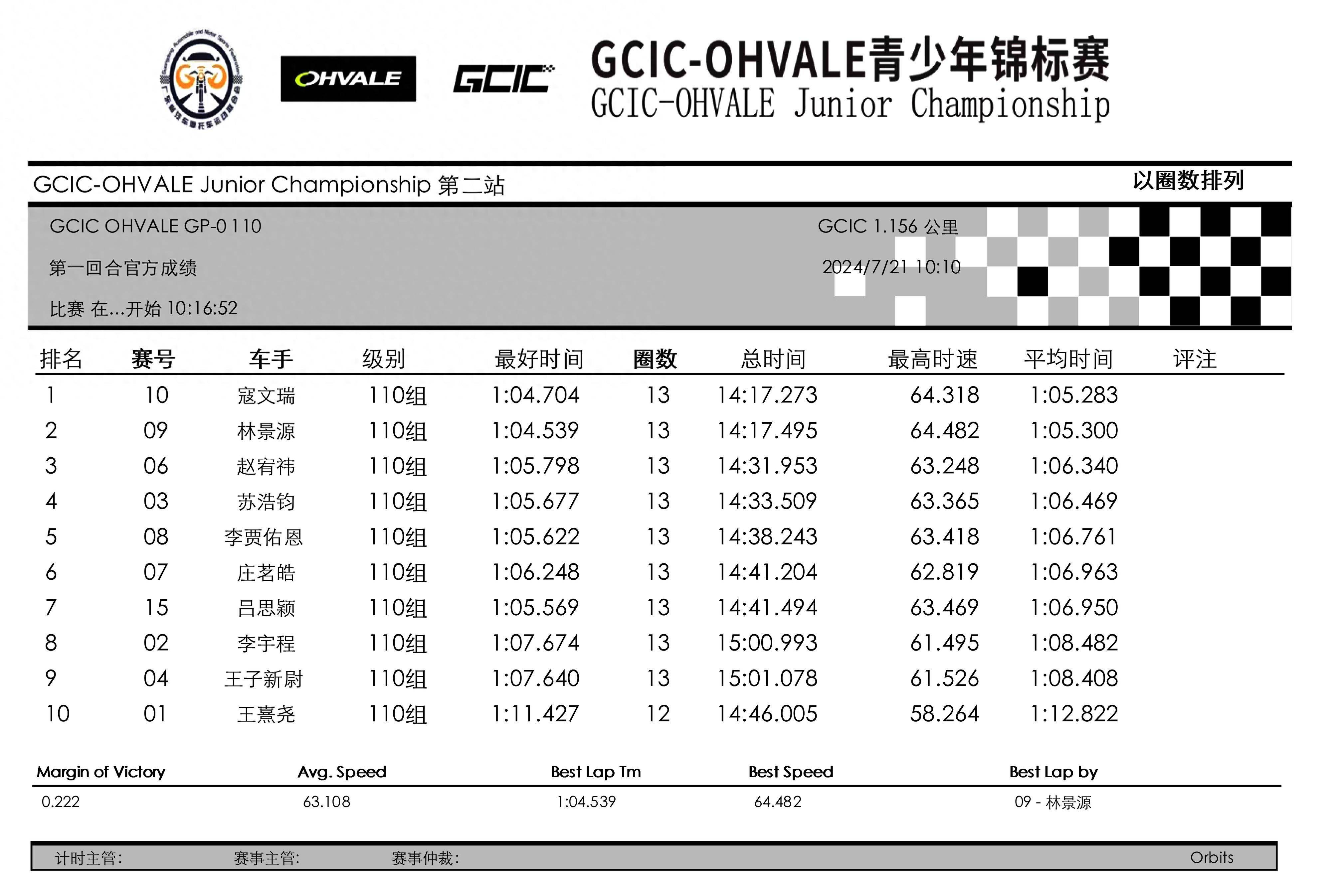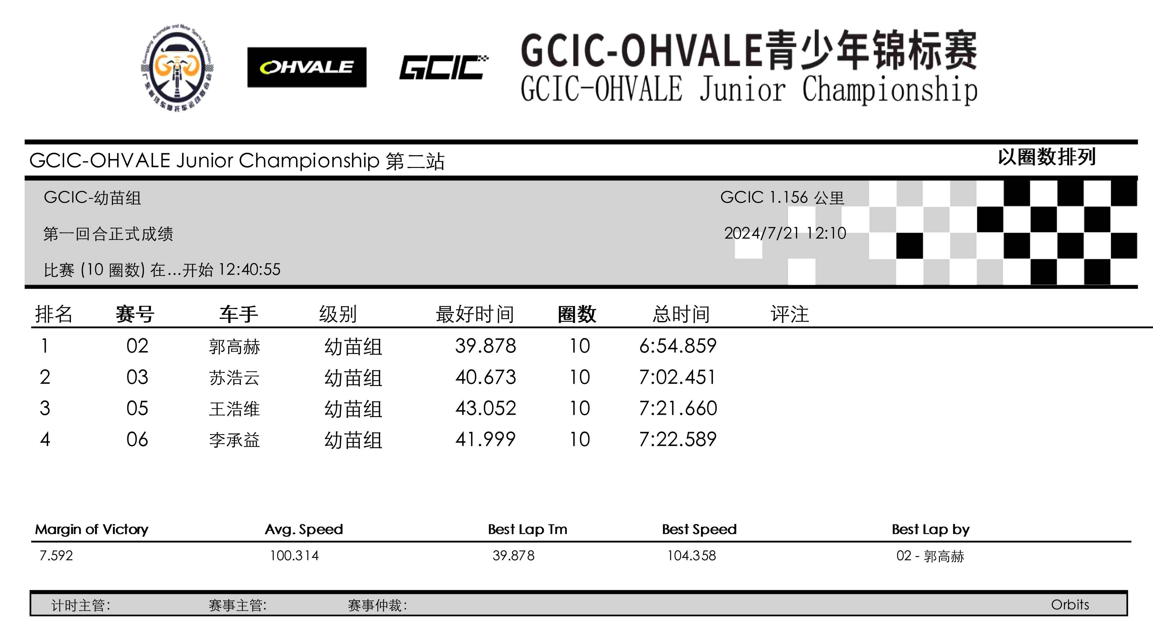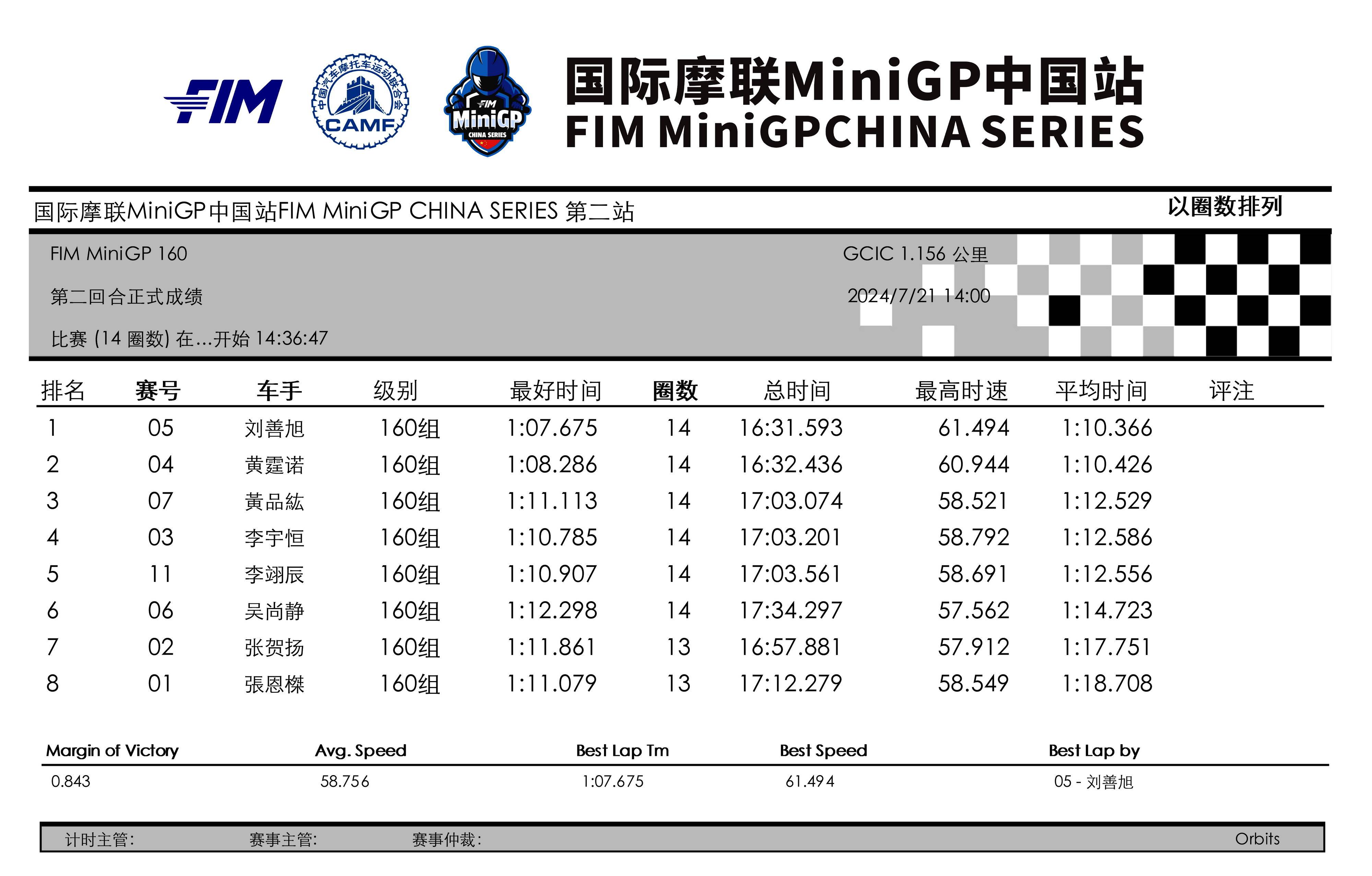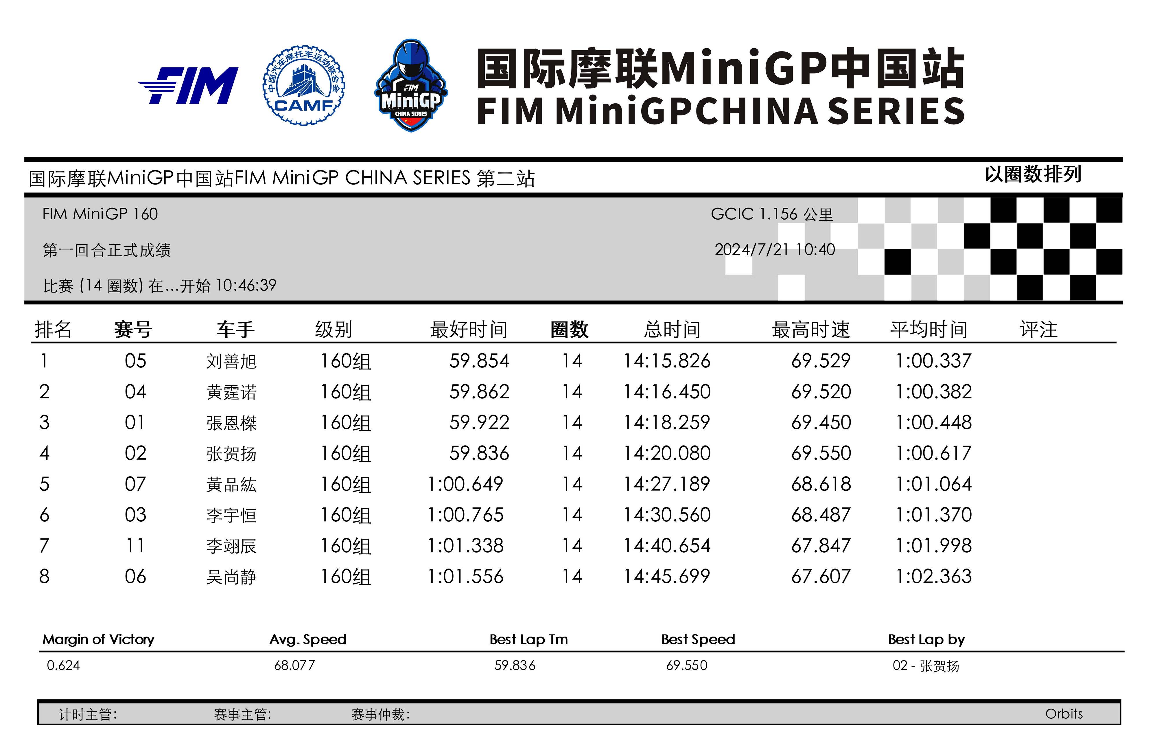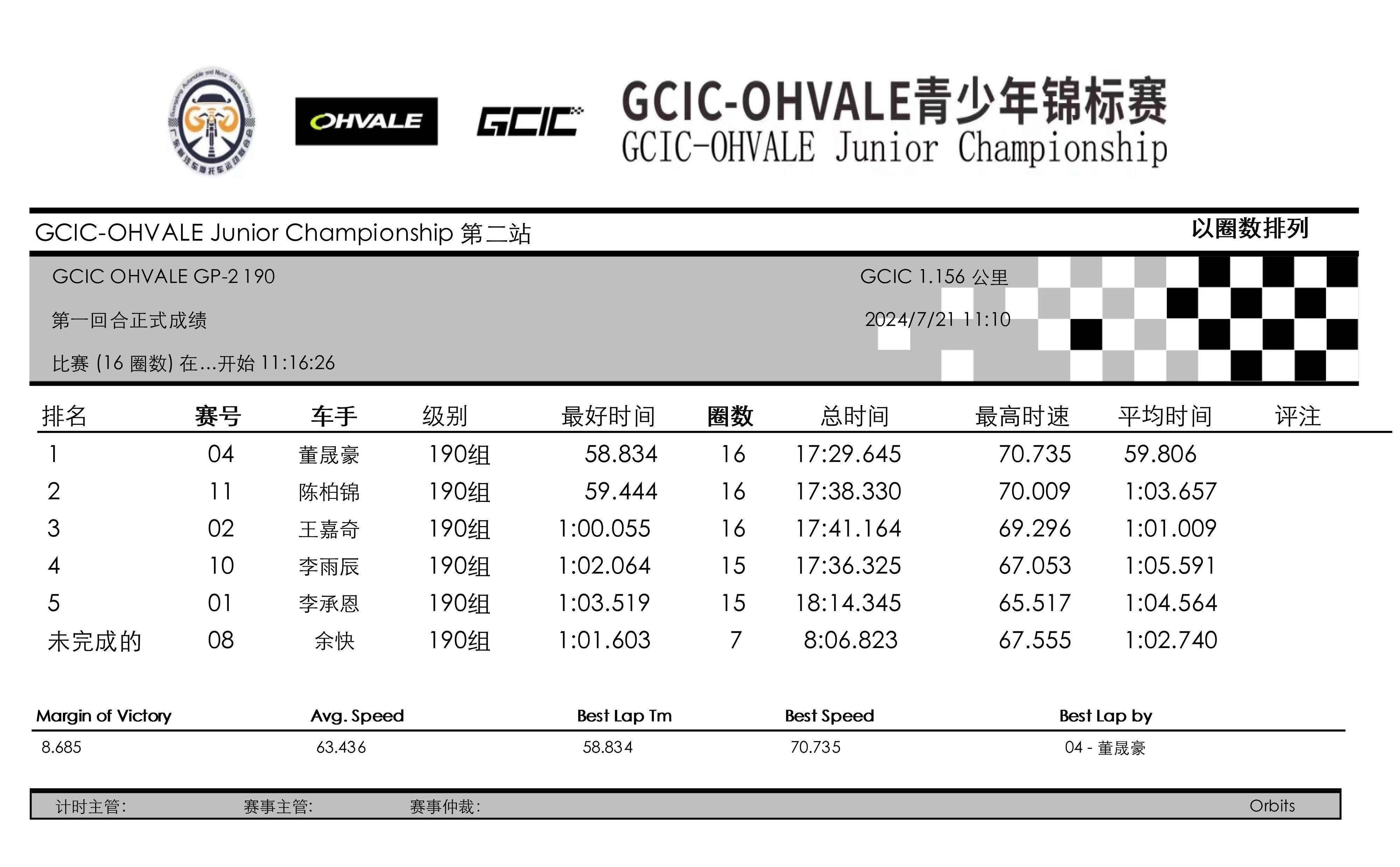3、Ohvale GP-0 160 組:58.706 秒,伊凡(Qabil Irfan Bin Azlan),馬來西亞;中國車手 59.619 秒,黃霆諾;