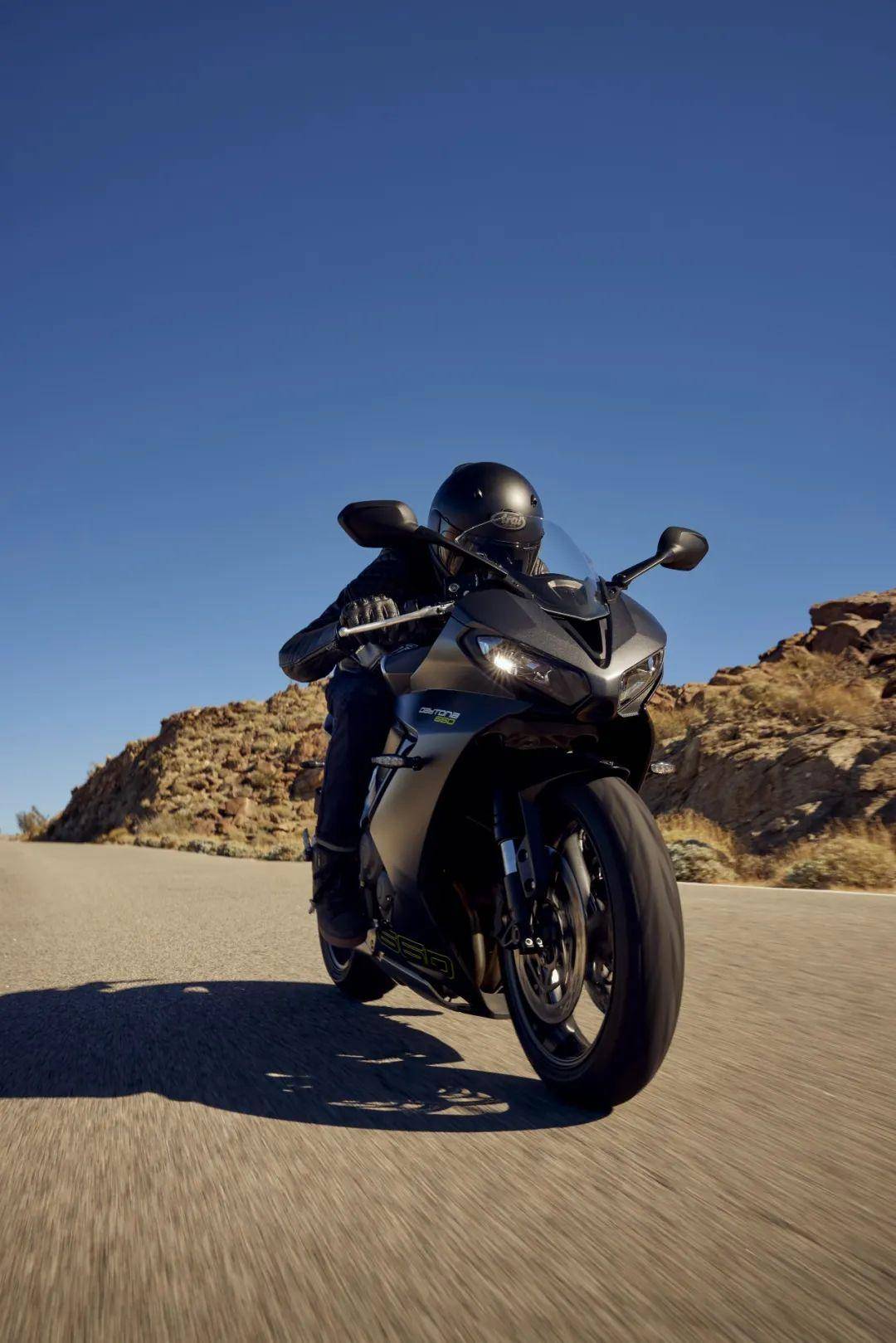 Daytona 660為騎手創(chuàng)造輕盈靈活的騎乘體驗(yàn)。這首先得益于全新設(shè)計(jì)的鋼管邊框車架,剛?cè)嵯酀?jì)的特性為騎手提供自然舒適的掌控。其次,Daytona 660采用了1425.6mm軸距,雖然比“三叉戟”略長(zhǎng),但是后傾角和拖曳距都向運(yùn)動(dòng)屬性作了調(diào)整,分別設(shè)置為23.8°和82.3mm,提供比較快速的轉(zhuǎn)向響應(yīng)。再次,Daytona 660武裝了高性能的懸掛系統(tǒng),前端安裝的是Showa 41mm大活塞前叉,后部是Showa的單筒減震器。騎手跨上坐墊后,握住跑車式鎖夾車把,構(gòu)成的駕駛姿勢(shì)比本田CBR650R略微運(yùn)動(dòng)些,介于雅馬哈YZF-R7和川崎Ninja 650之間,舒適的坐姿讓騎手長(zhǎng)時(shí)間奔跑也不容易疲累。