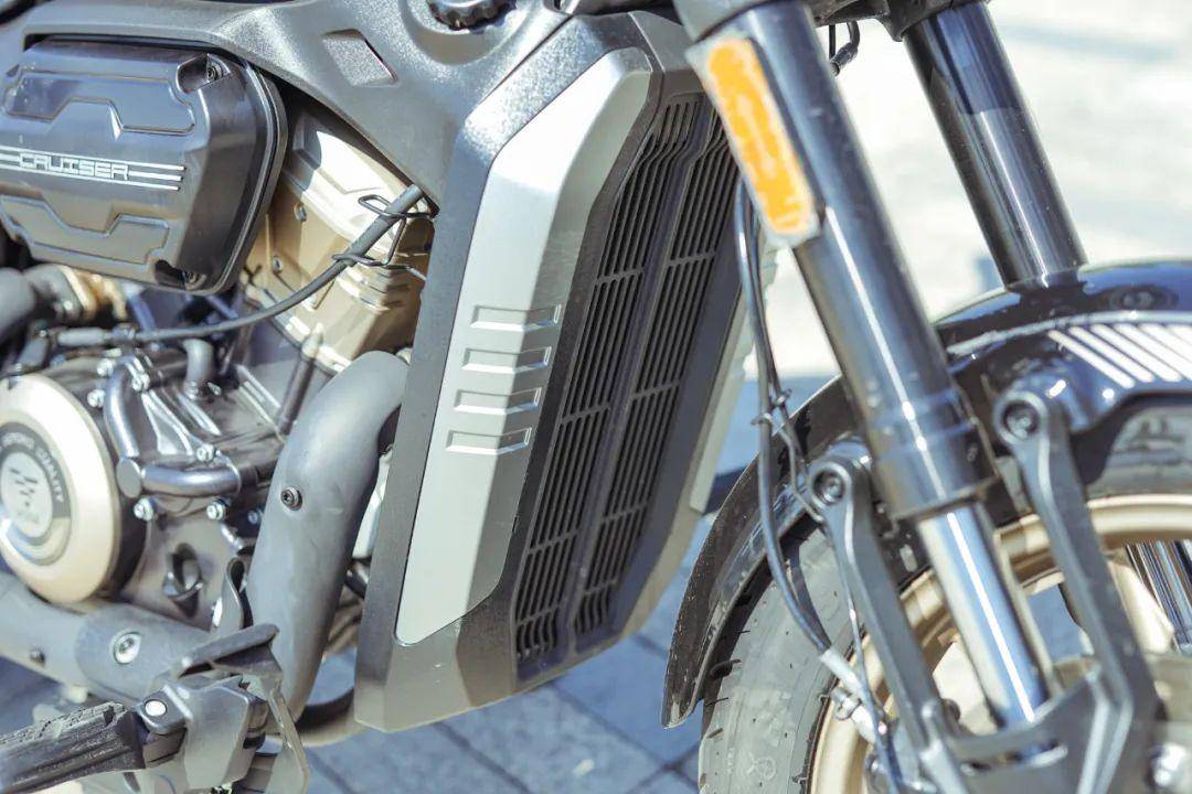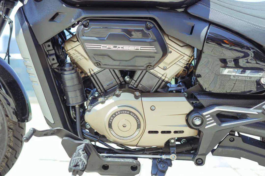 外形感受上,第一感覺就是CU250很敦實,不像有些小排量巡航車型那樣殼大瓤小。能有這樣的效果一個是因為CU250的軸距只有1460mm,比同級別車的軸距要短近100mm,骨架短了,再往里填肉的時候就可以營造出比較飽滿的效果了。另一方面是CU250在發(fā)動機附近位置的布局,大家可以觀察一下,除了留有一部分散熱的空隙,基本都被外觀件給蓋住了,最終呈現(xiàn)的效果就是肉量堆滿的感覺。