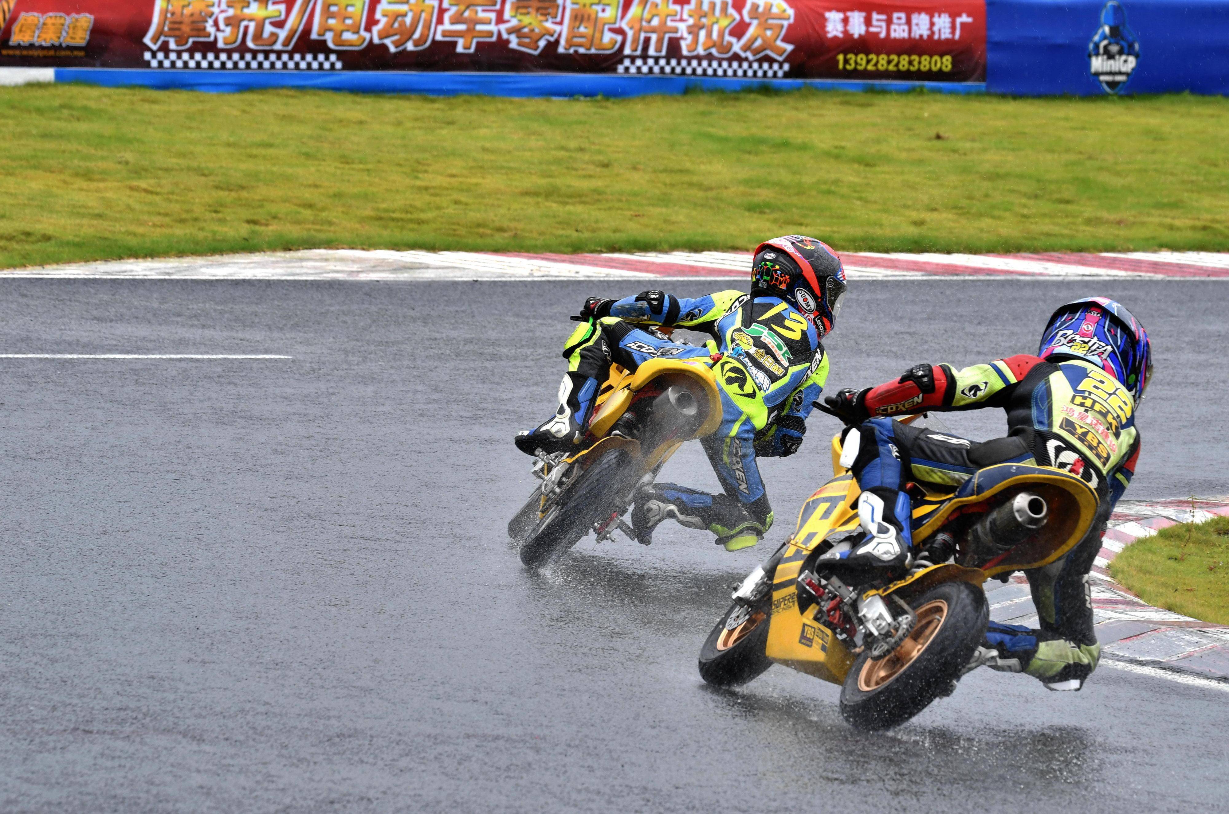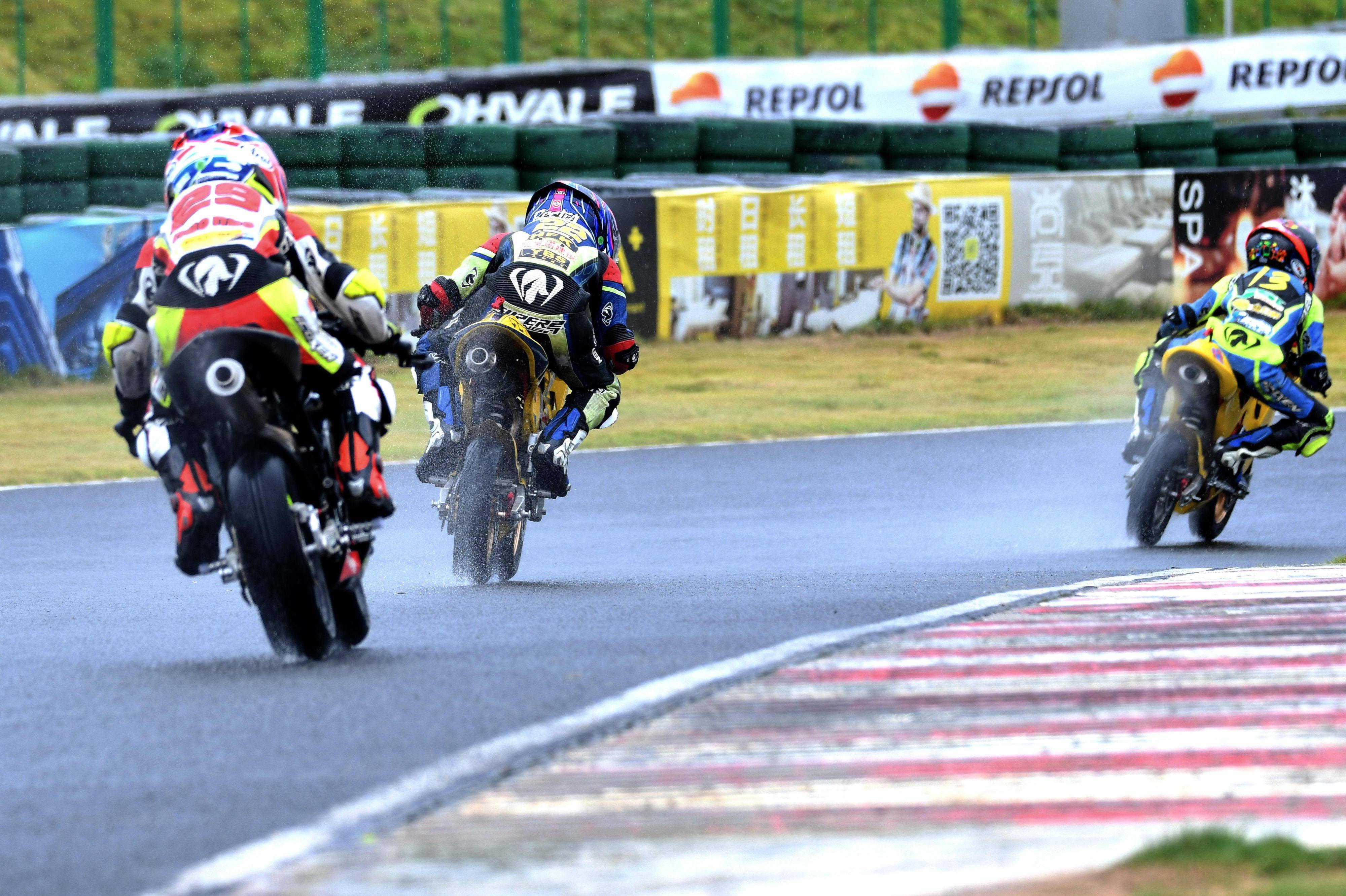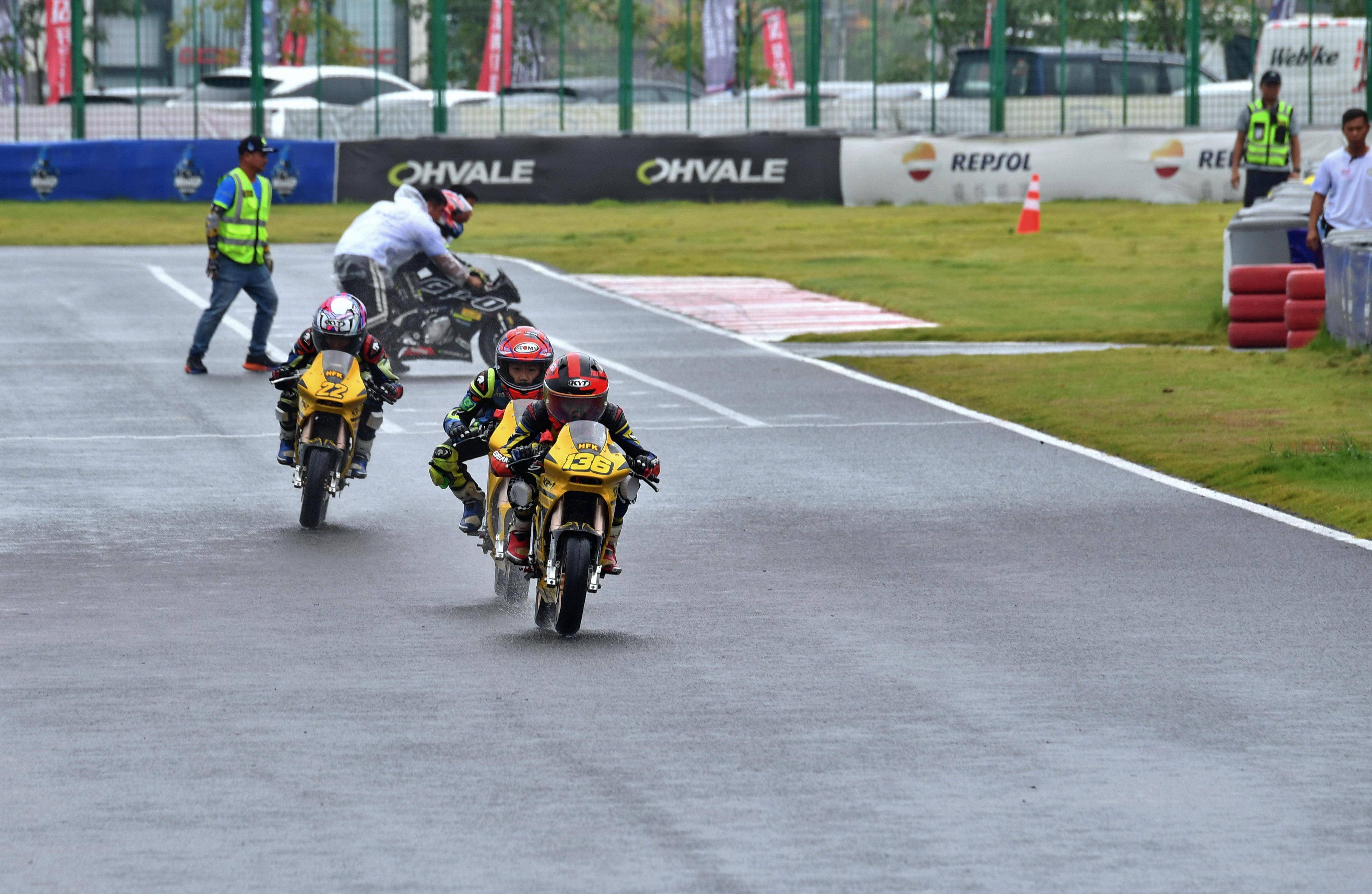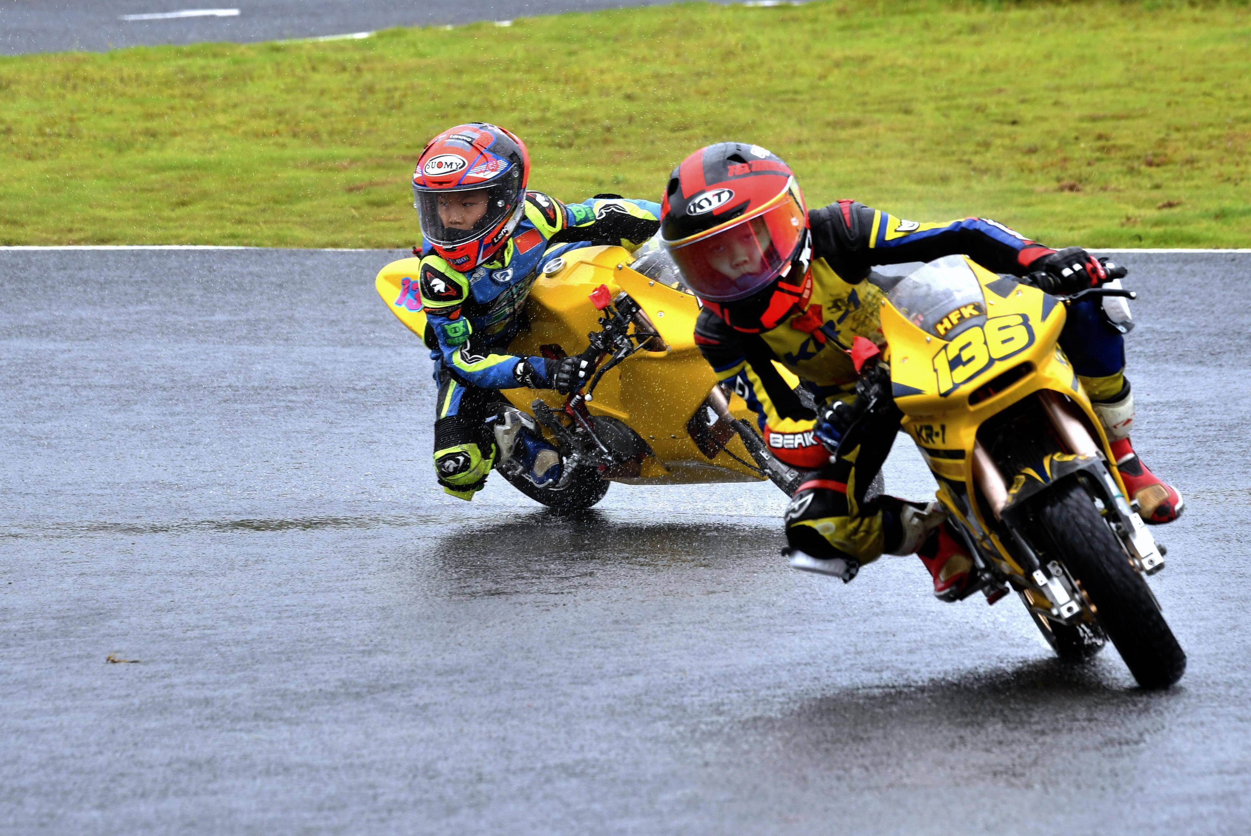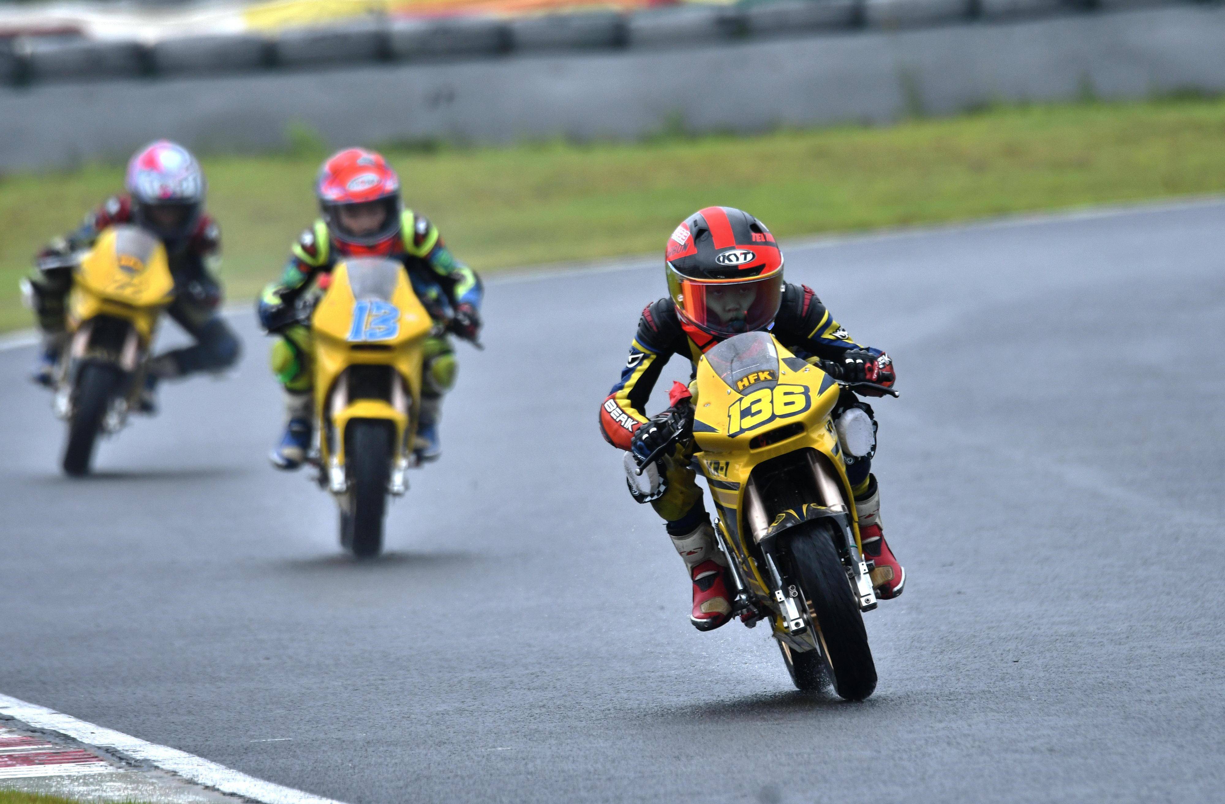 兩節(jié)比賽都在雨中展開。周末(八月 17 日)時候舉行的第一節(jié)比賽,從排頭位出發(fā)的黃霆諾、在第一個彎就取得了領先位置,并一路領跑;場內(nèi)年紀最小、欲與其他哥哥爭一席之地的寇文瑞,在第一圈就滑倒摔車、被迫退出了比賽;不久后,李宇恒也發(fā)生摔車而退賽。