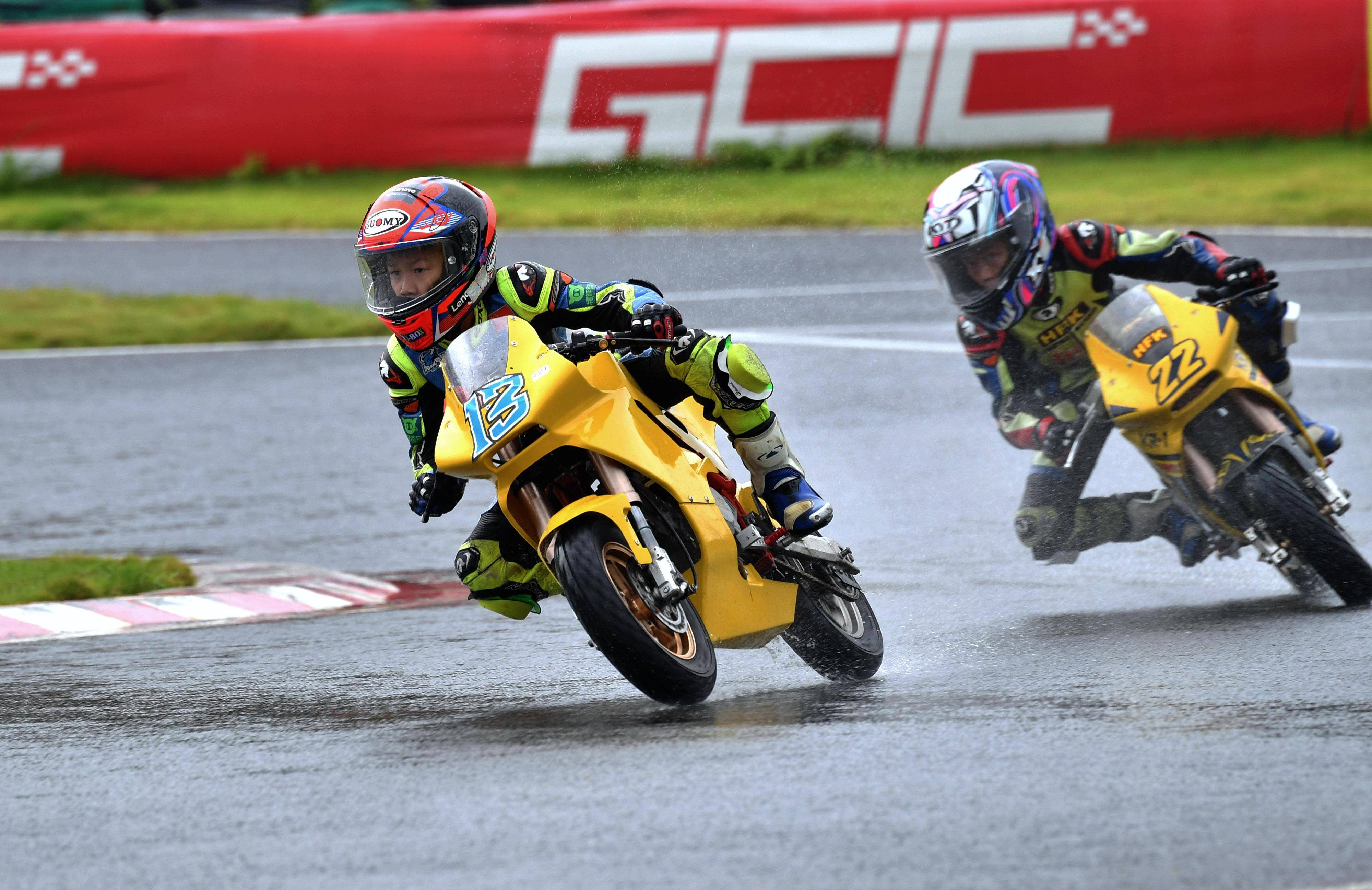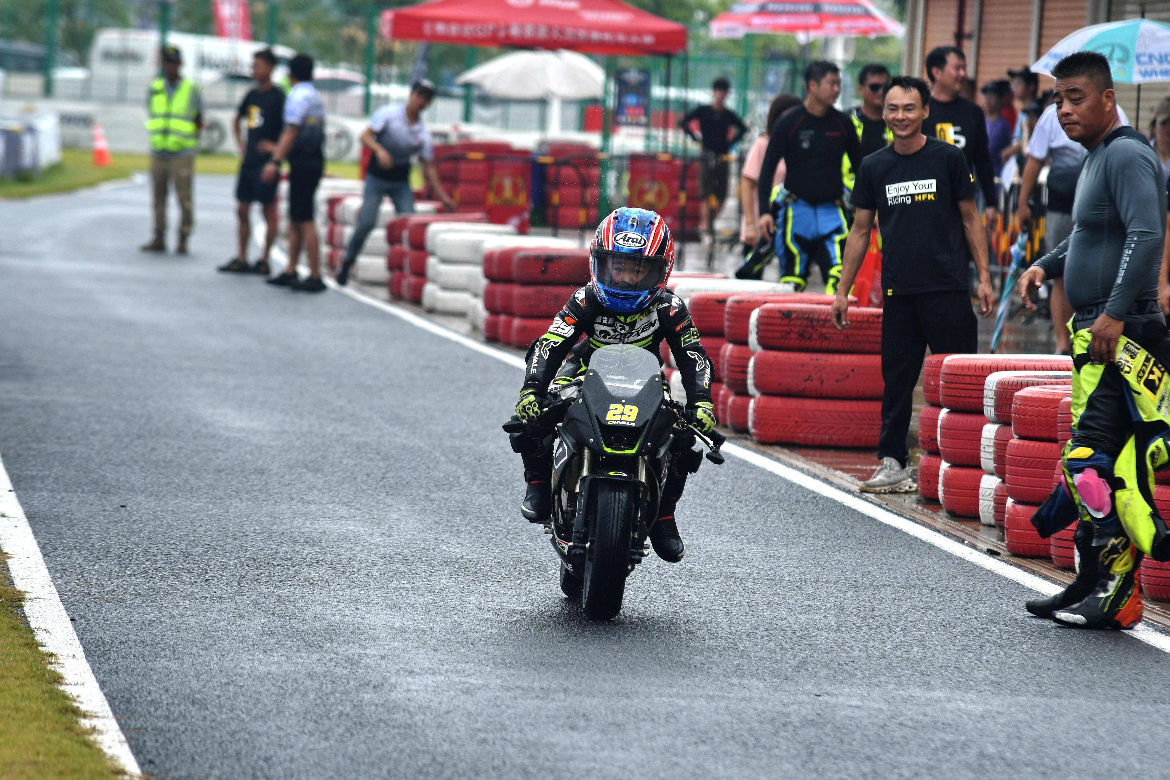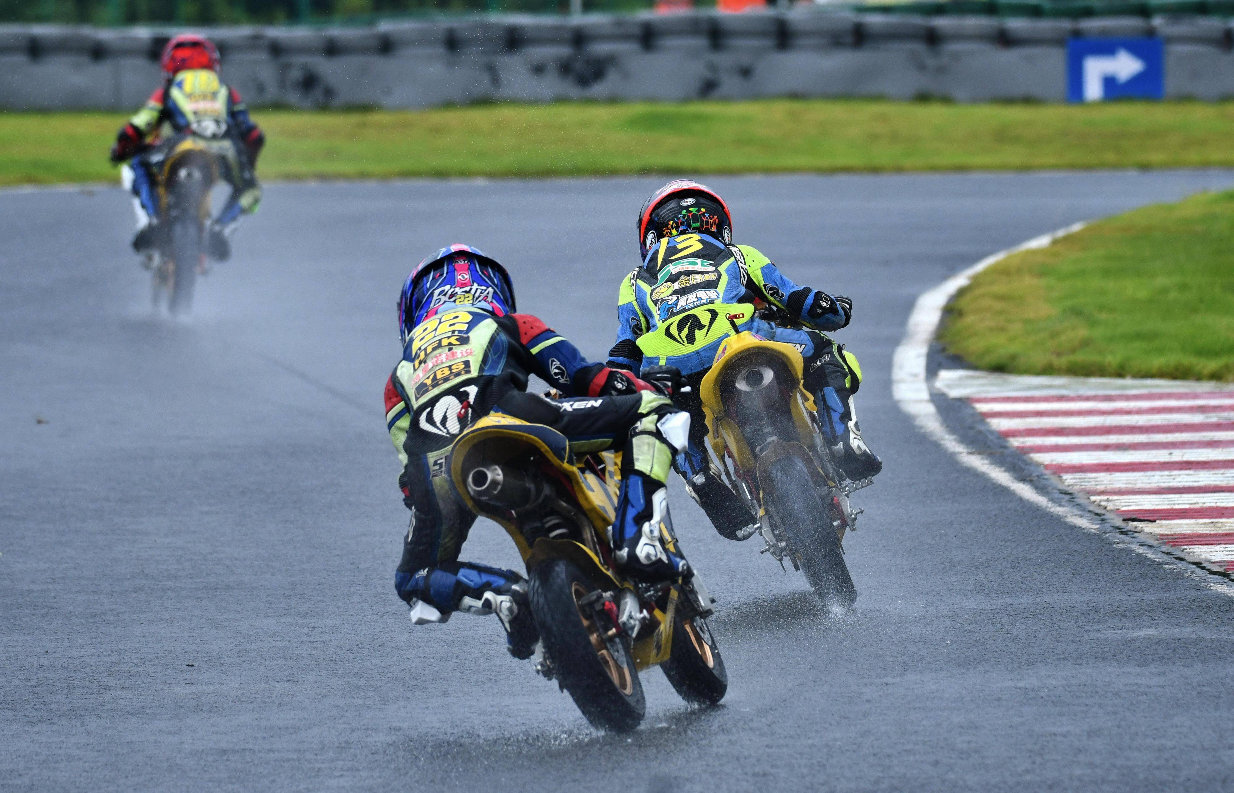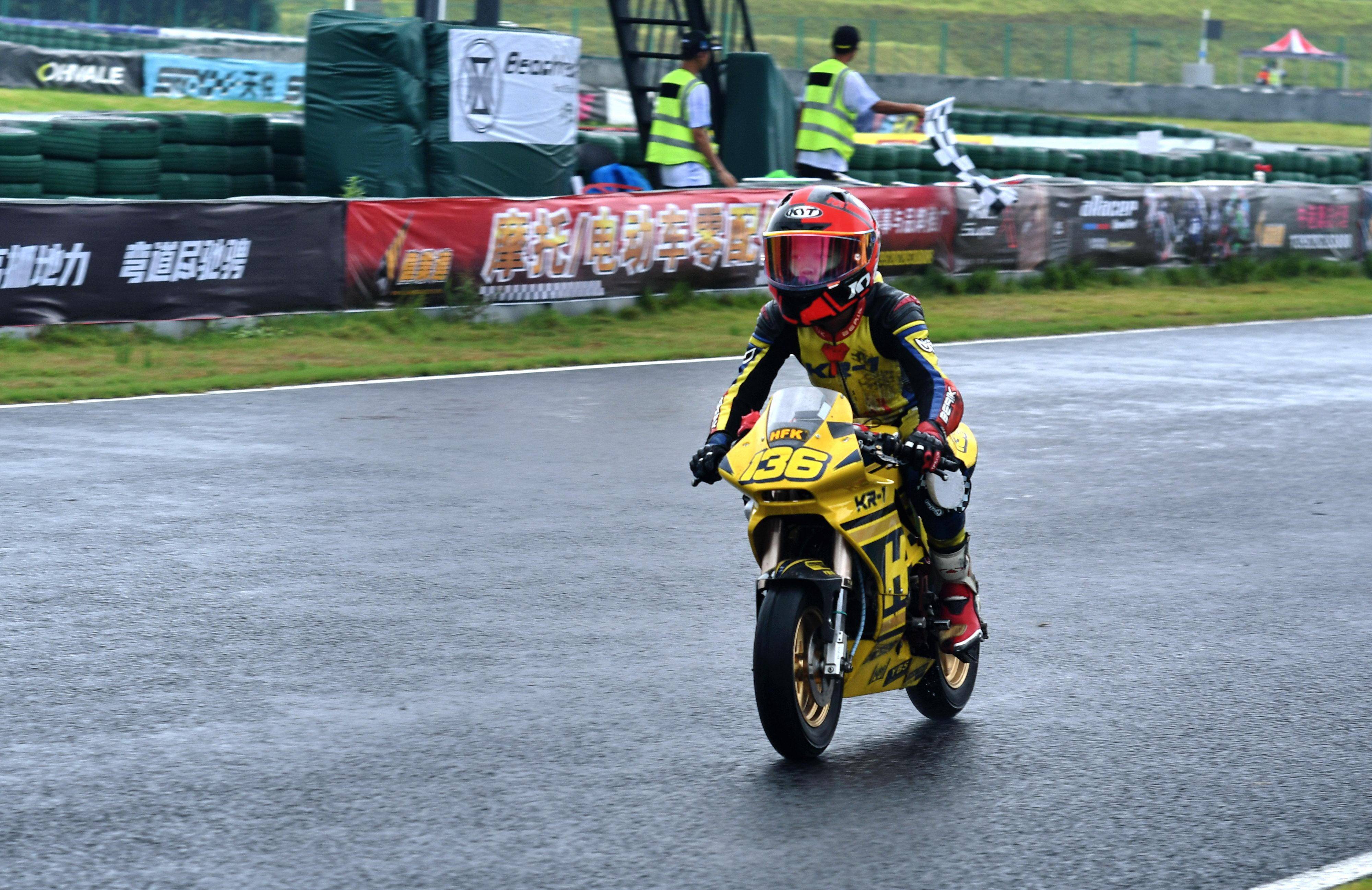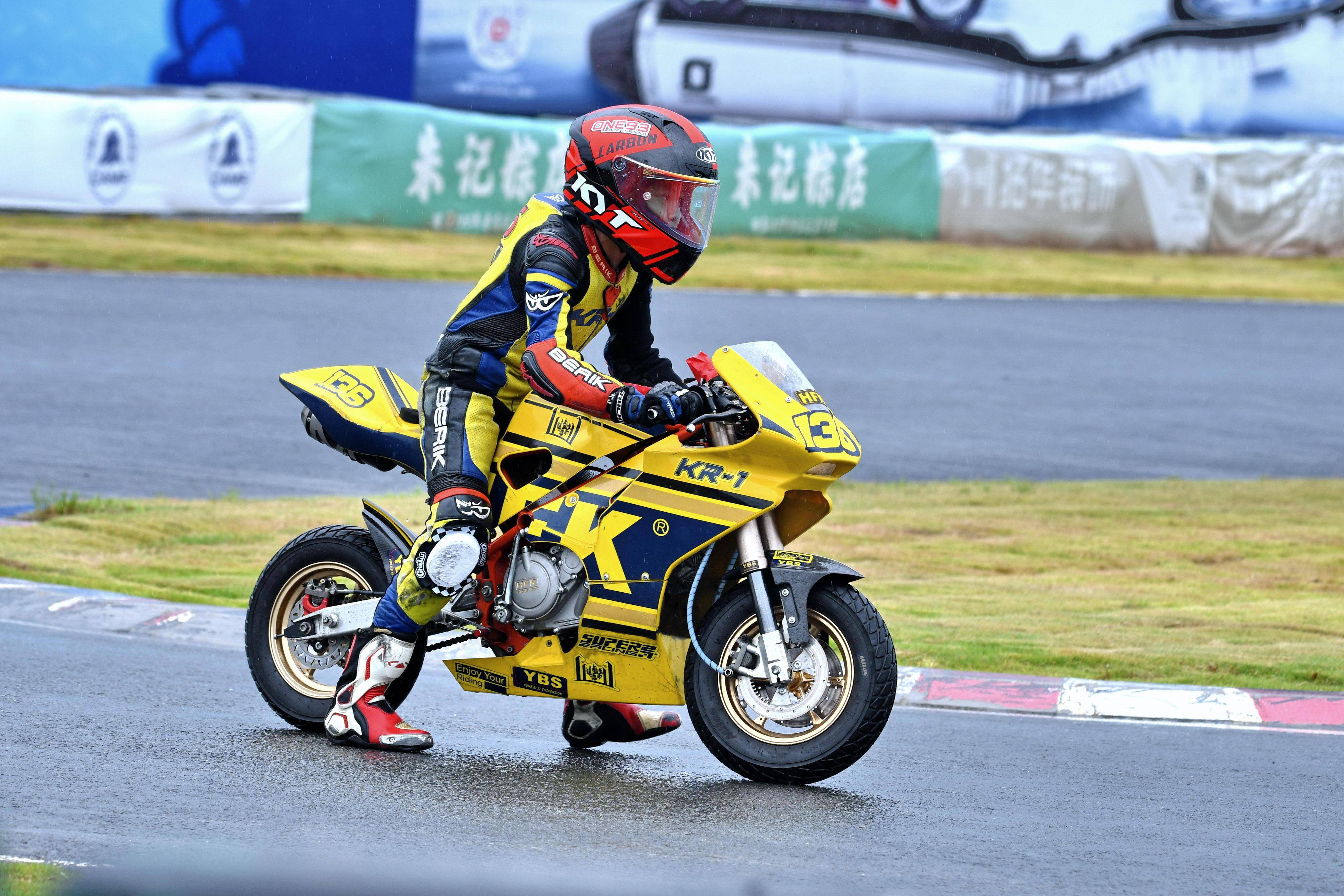 兩節(jié)比賽都在雨中展開。周末(八月 17 日)時候舉行的第一節(jié)比賽,從排頭位出發(fā)的黃霆諾、在第一個彎就取得了領先位置,并一路領跑;場內(nèi)年紀最小、欲與其他哥哥爭一席之地的寇文瑞,在第一圈就滑倒摔車、被迫退出了比賽;不久后,李宇恒也發(fā)生摔車而退賽。