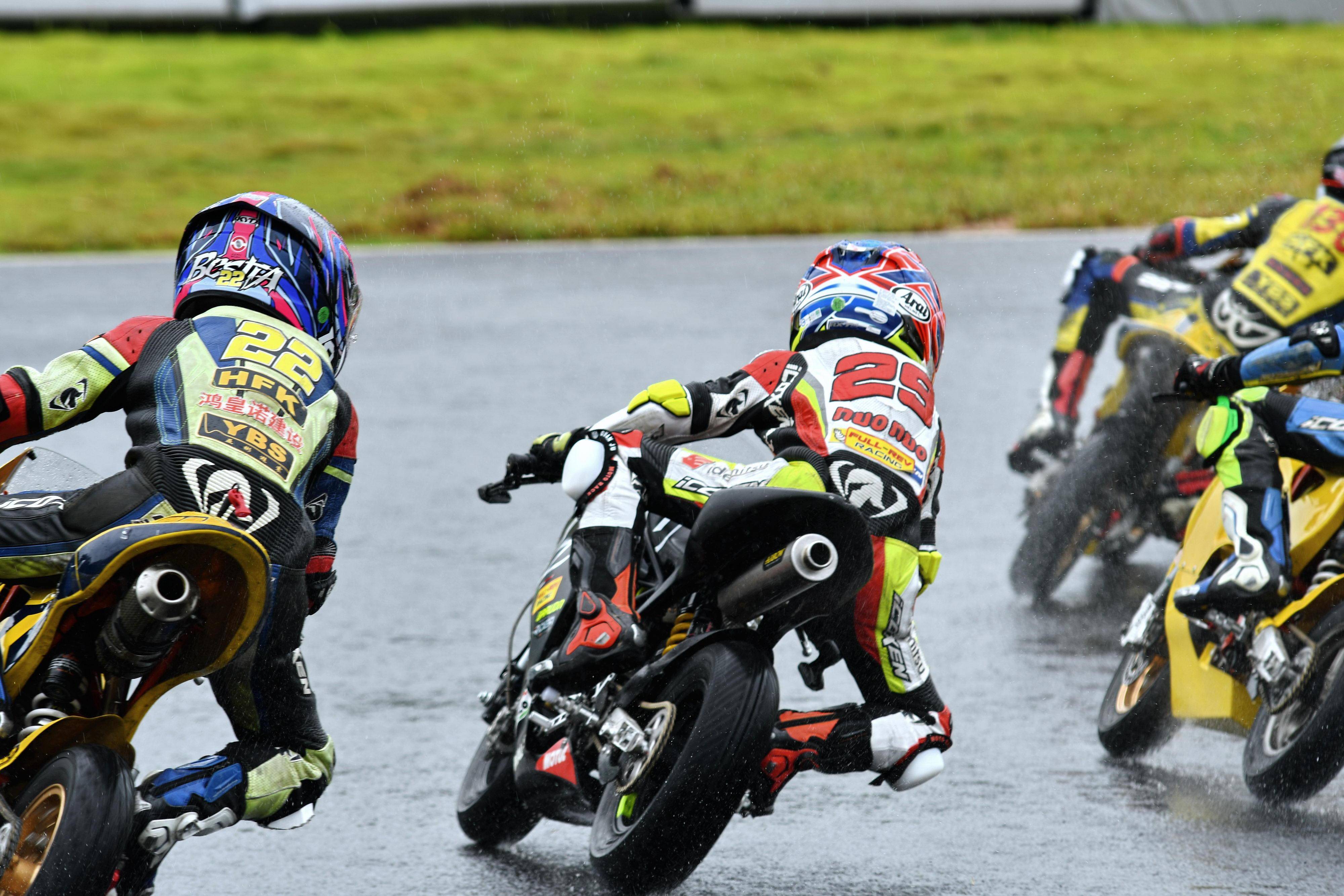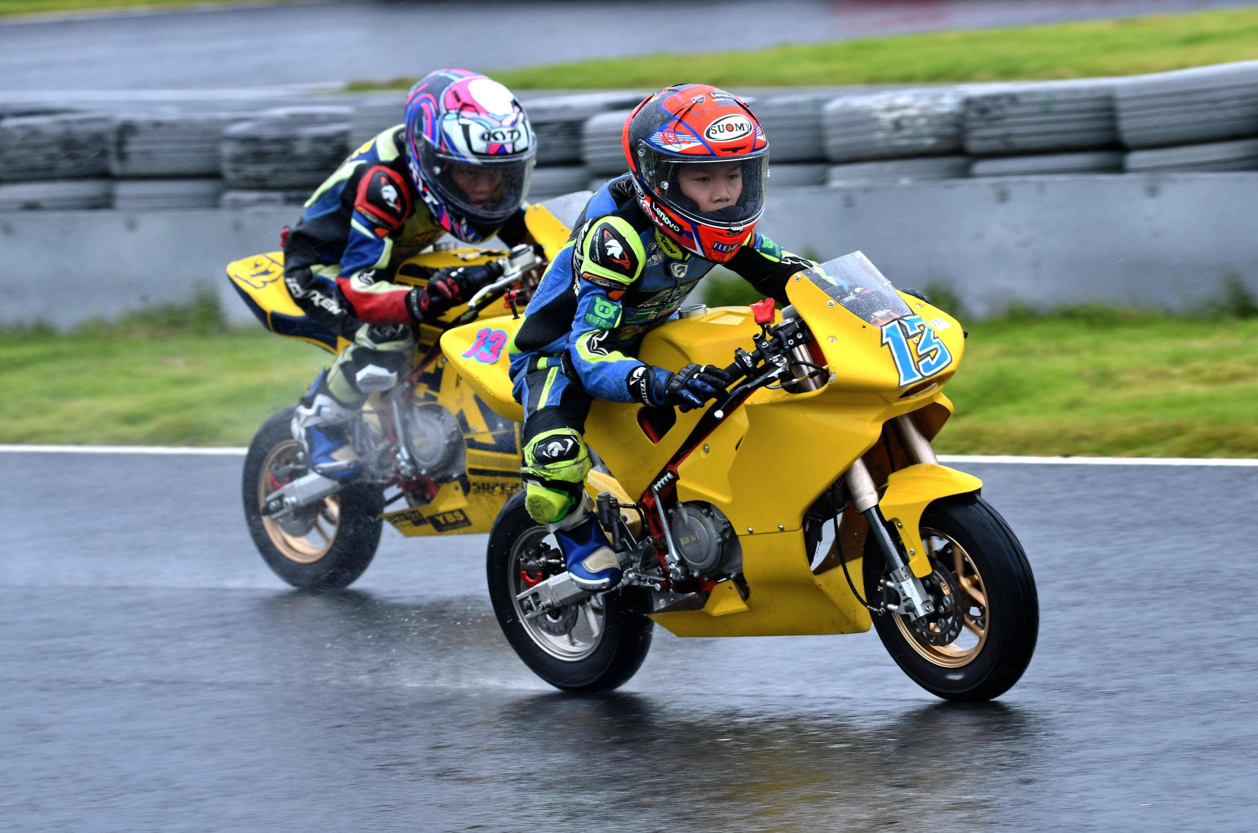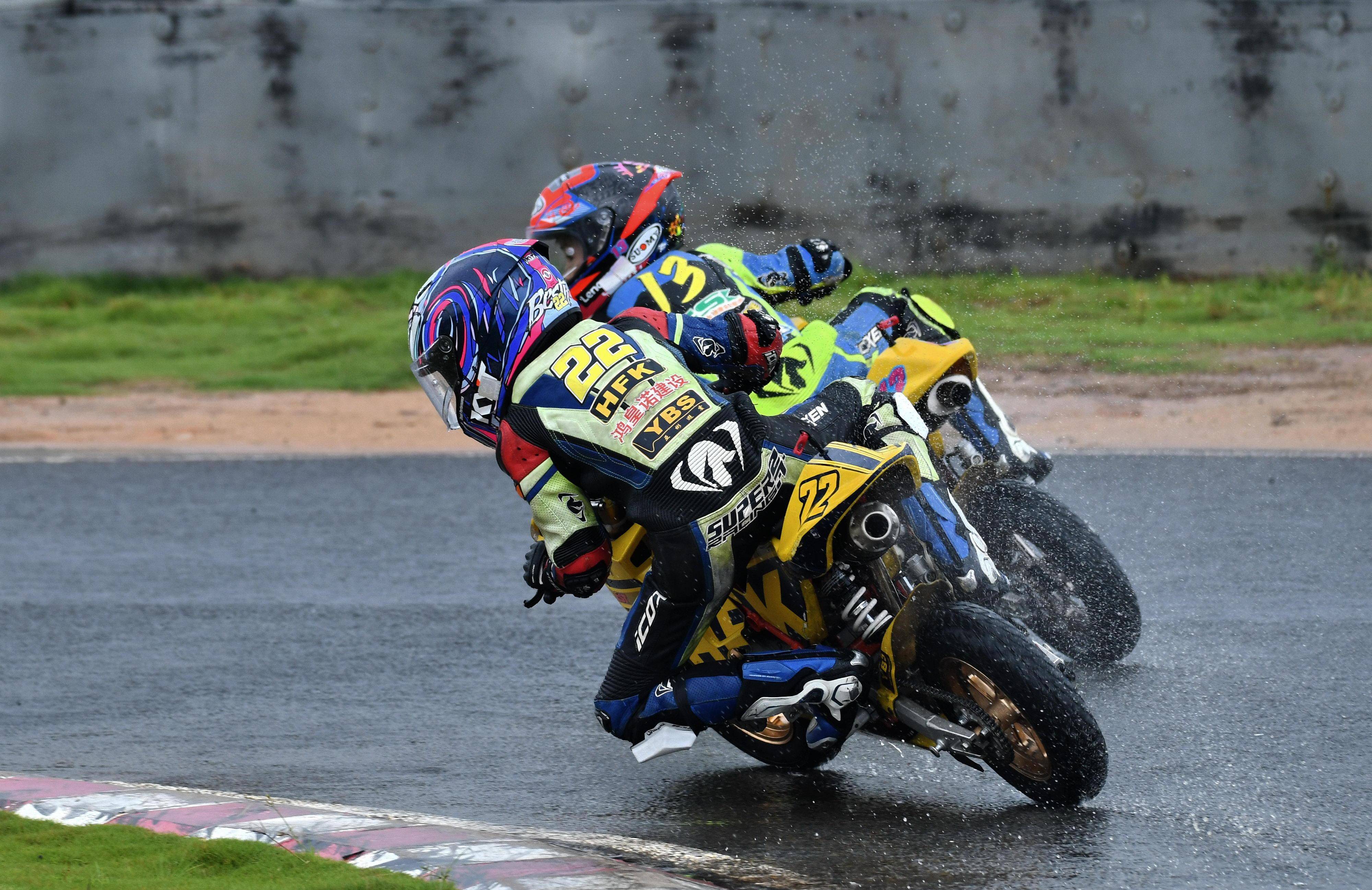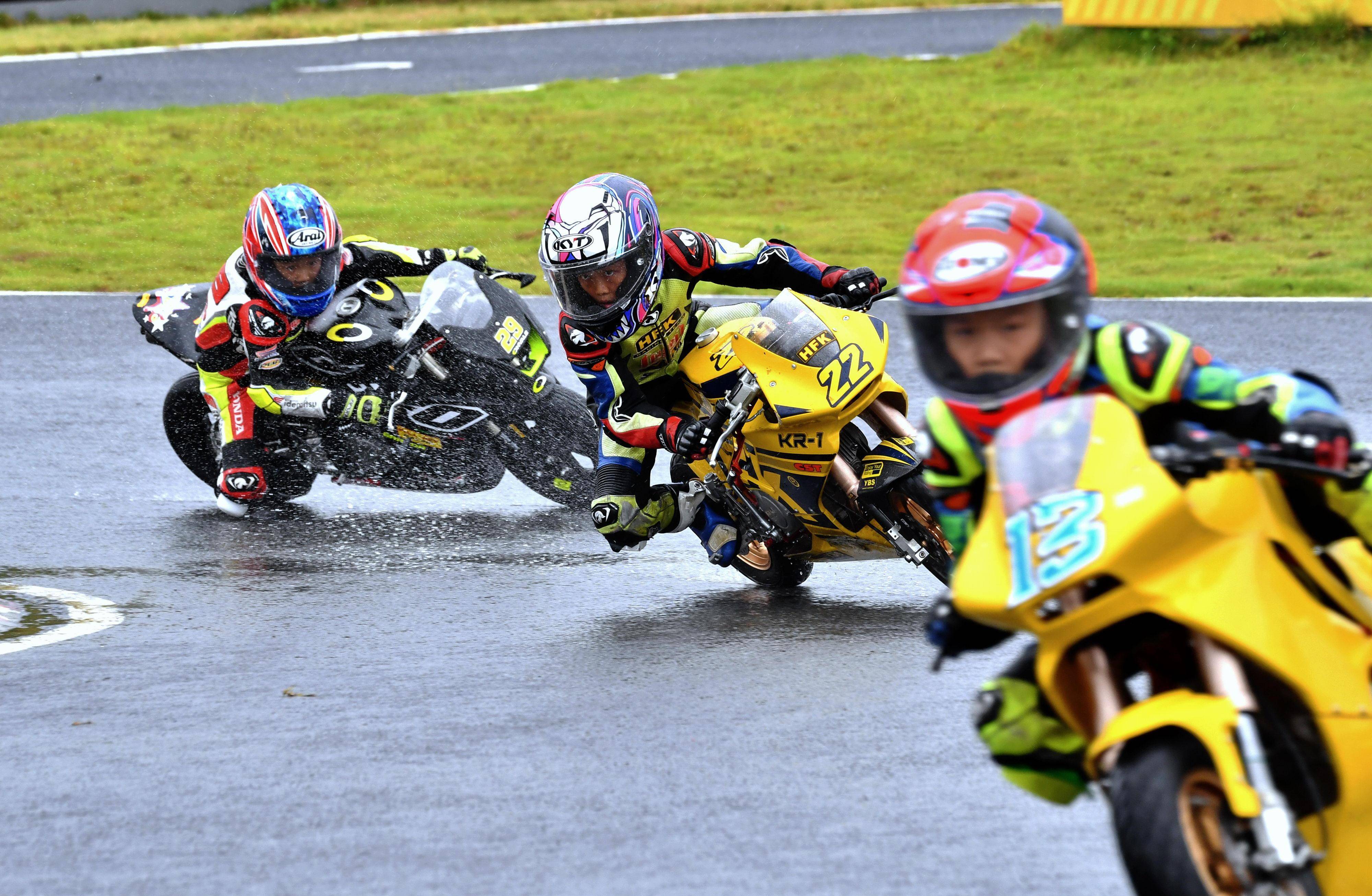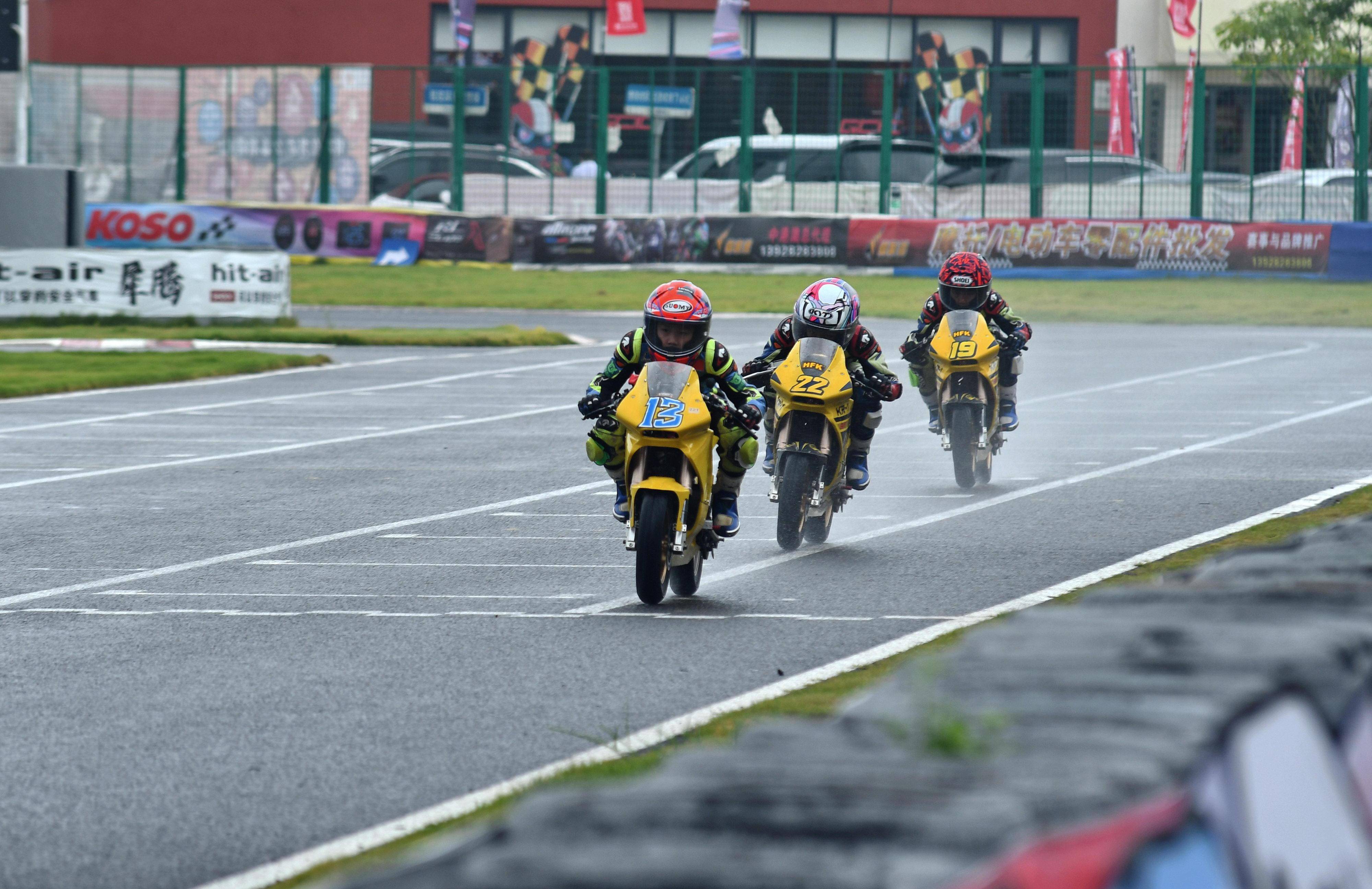 兩節(jié)比賽都在雨中展開。周末(八月 17 日)時候舉行的第一節(jié)比賽,從排頭位出發(fā)的黃霆諾、在第一個彎就取得了領先位置,并一路領跑;場內(nèi)年紀最小、欲與其他哥哥爭一席之地的寇文瑞,在第一圈就滑倒摔車、被迫退出了比賽;不久后,李宇恒也發(fā)生摔車而退賽。
