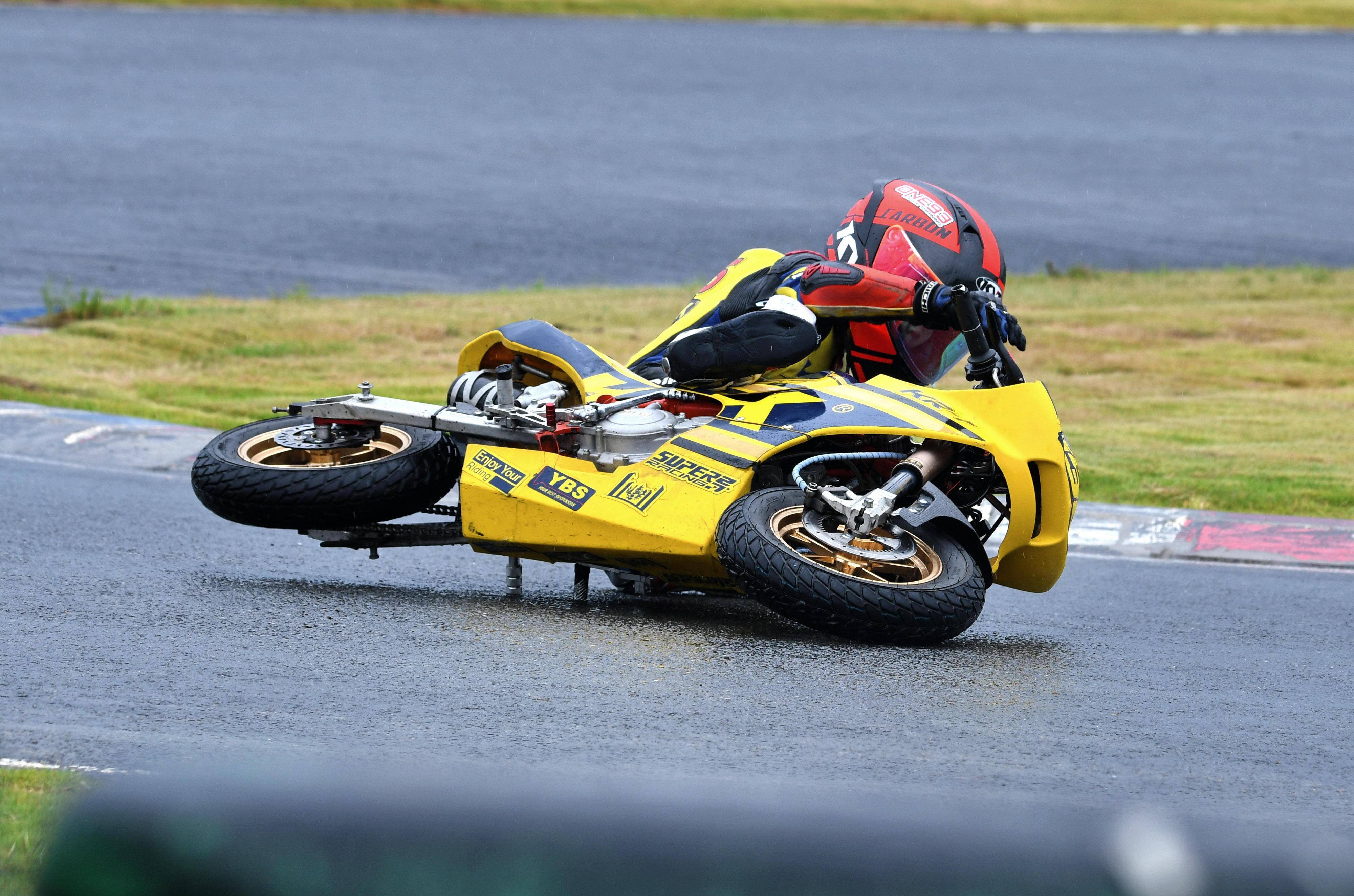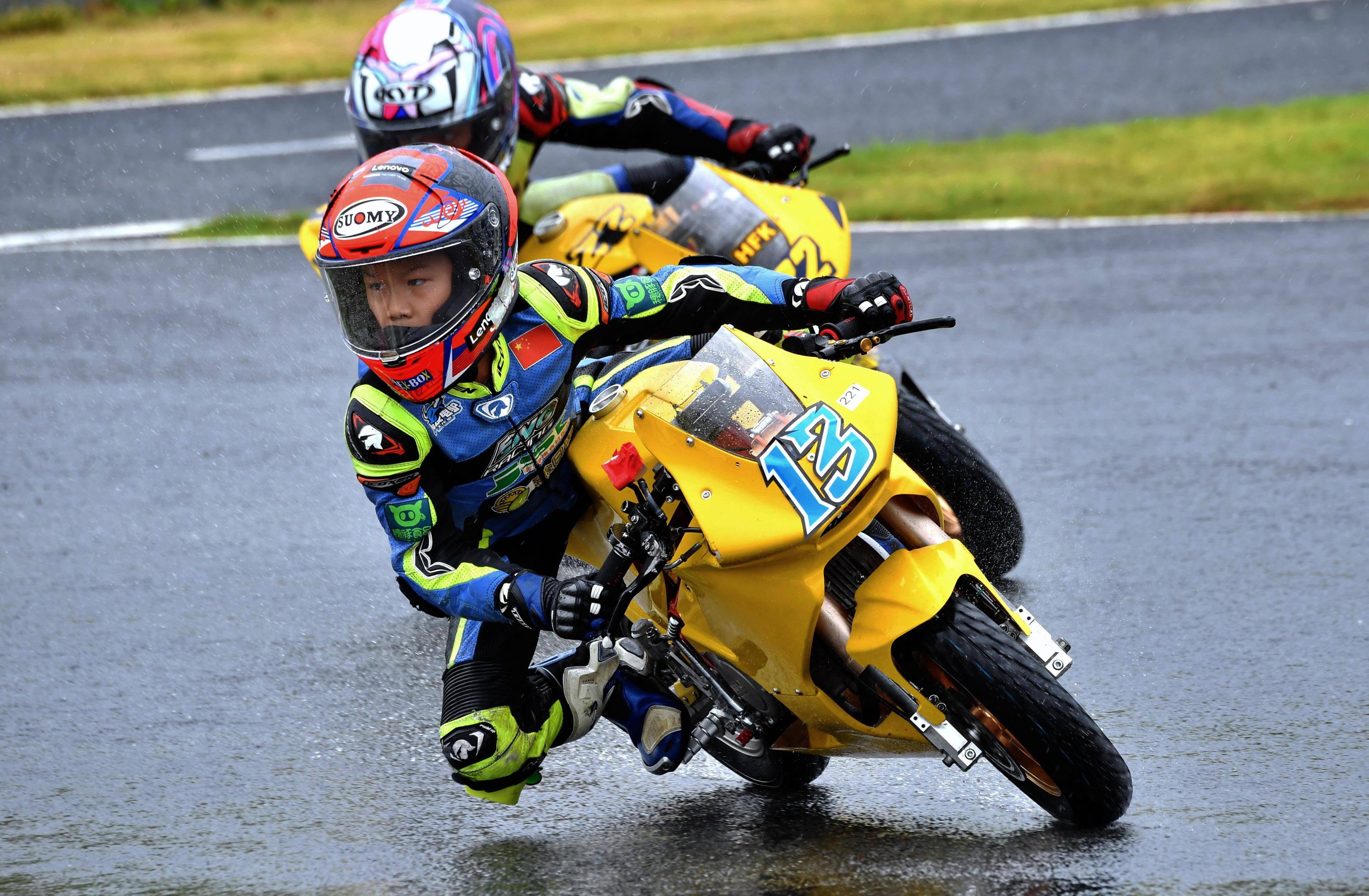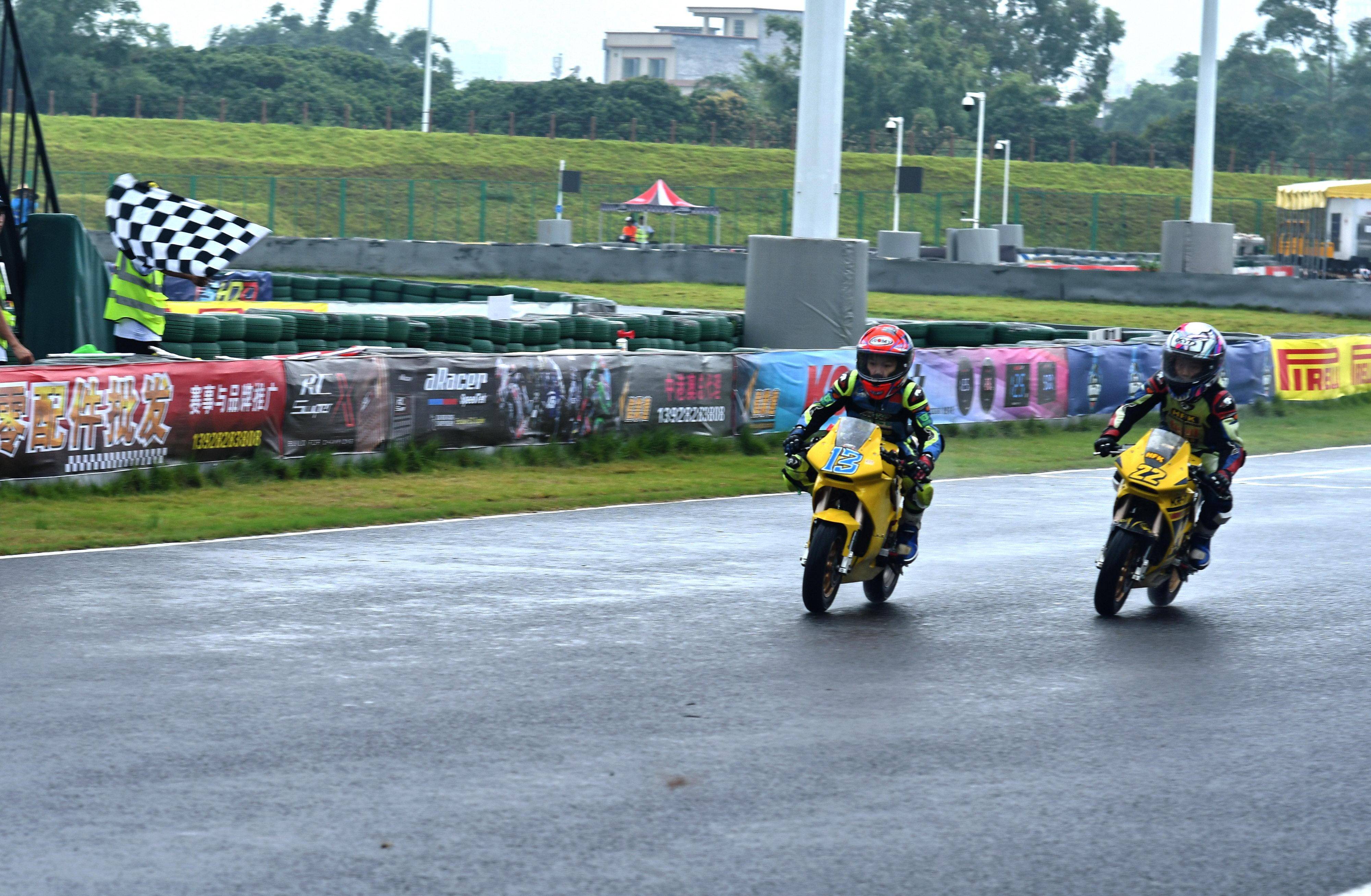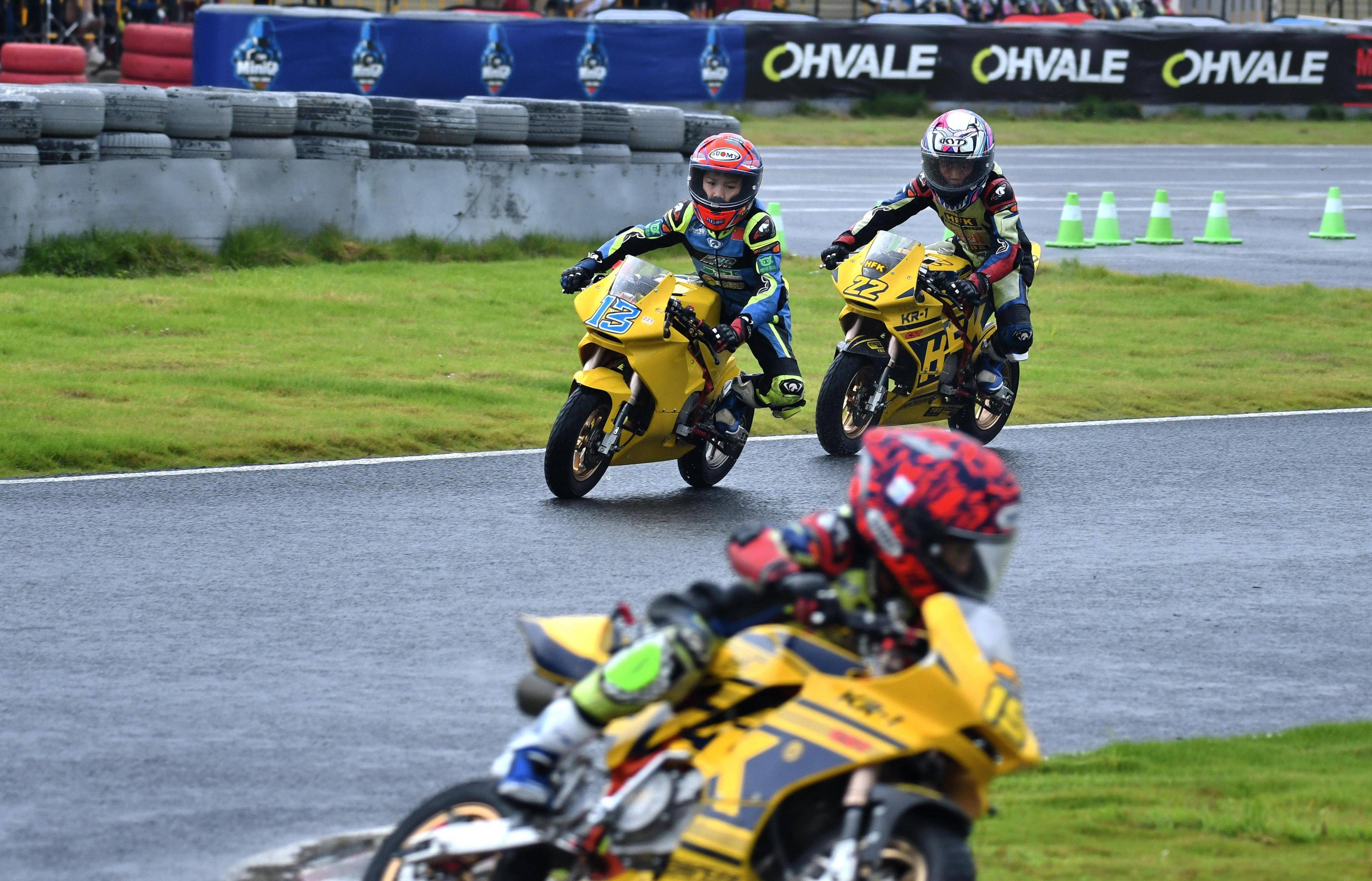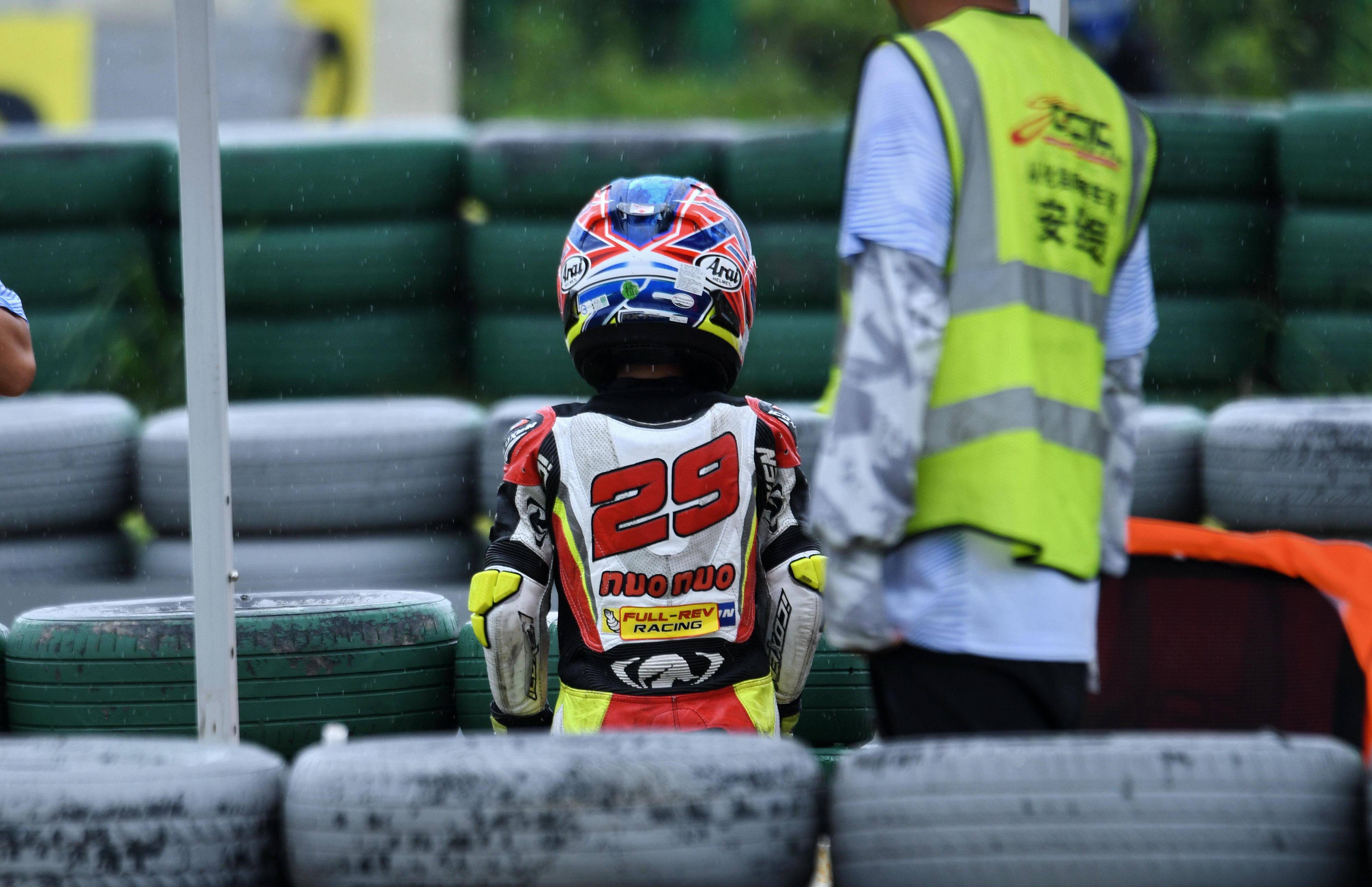 兩節(jié)比賽都在雨中展開。周末(八月 17 日)時候舉行的第一節(jié)比賽,從排頭位出發(fā)的黃霆諾、在第一個彎就取得了領先位置,并一路領跑;場內(nèi)年紀最小、欲與其他哥哥爭一席之地的寇文瑞,在第一圈就滑倒摔車、被迫退出了比賽;不久后,李宇恒也發(fā)生摔車而退賽。
