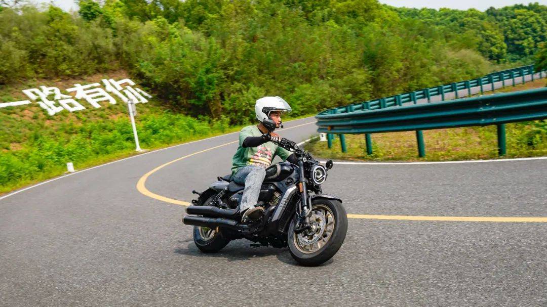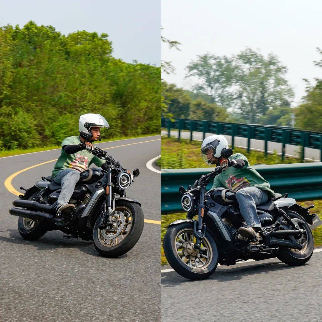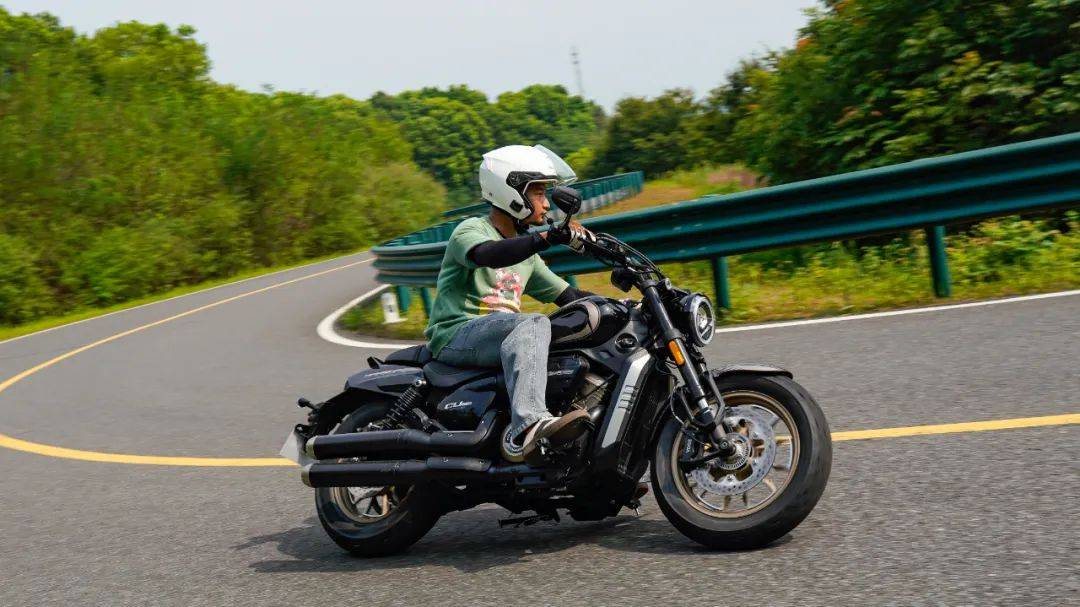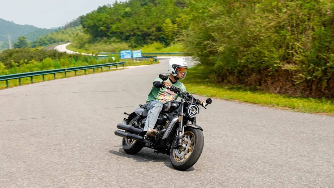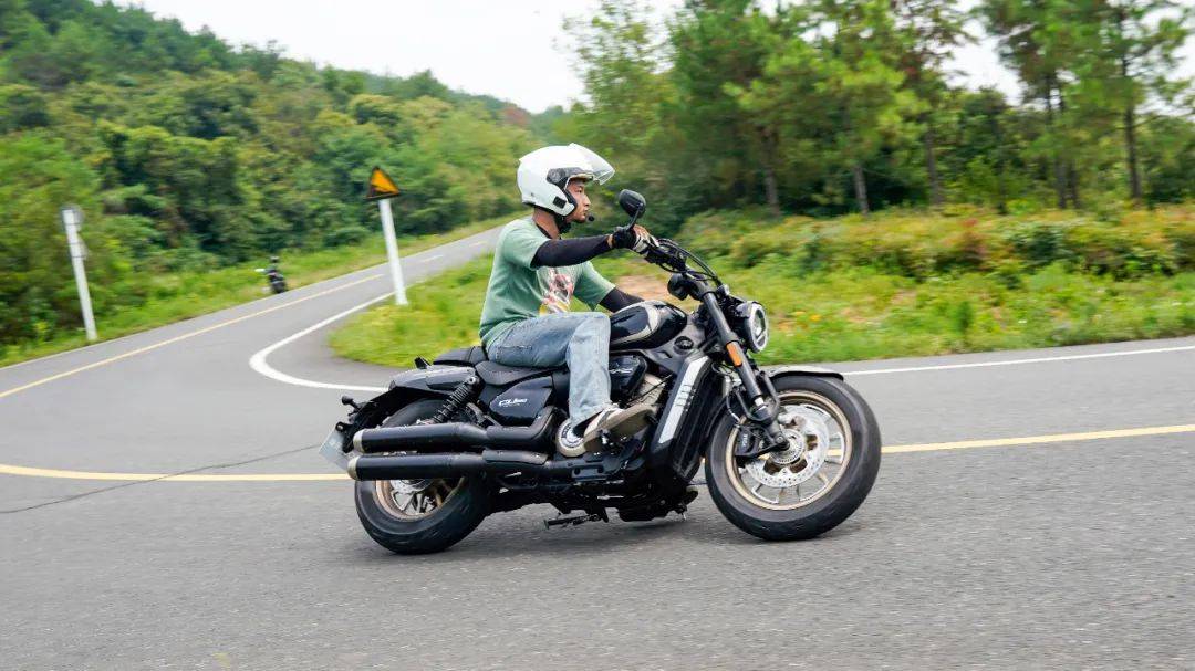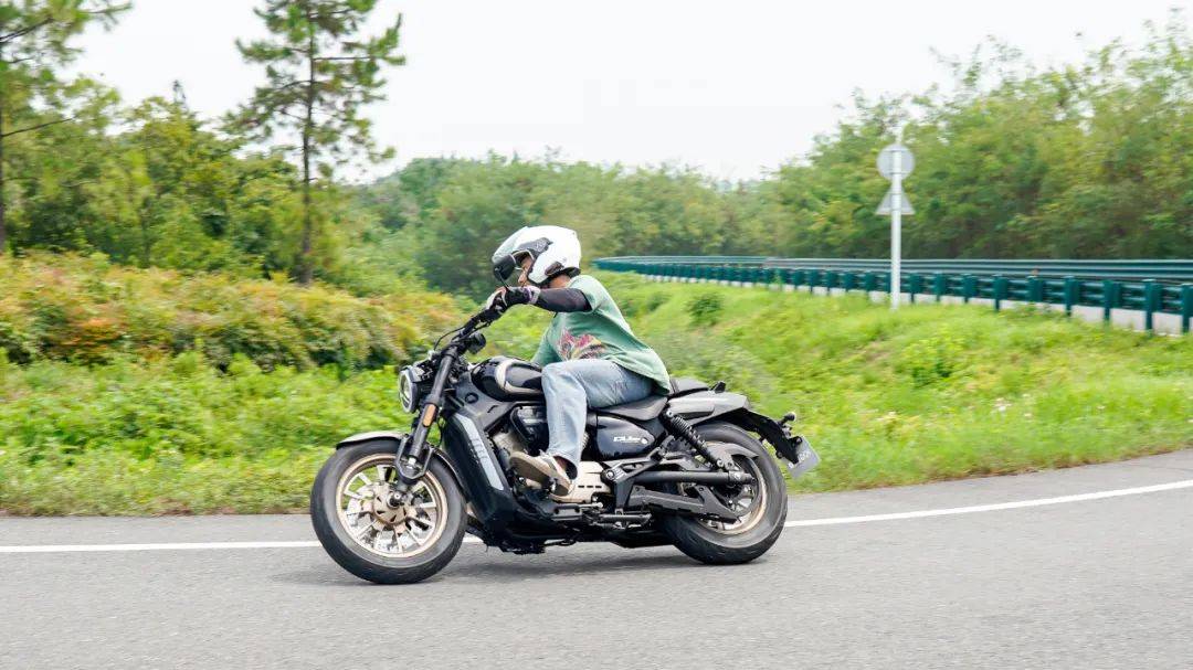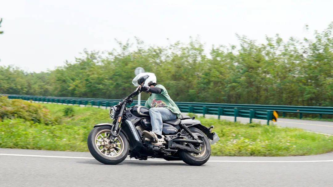 同樣是春風十里的場地,CU250的表現(xiàn)與我們測過的CU525相比其彎道極限會更低一些,這也是照顧到新手朋友的設(shè)定,防止新手朋友對車輛極限沒底,探傾角而導(dǎo)致危險。其余的各項表現(xiàn)上CU250的表現(xiàn)堪稱運動型巡航的典范,只有1460mm的軸距,加上前120/80-16和后150/80-15的輪胎尺寸,使得CU250在騎行時給人的第一感受如街車般的靈活。在入彎前連續(xù)降檔,滑動離合器的質(zhì)感輕盈,檔位清晰好用,在重剎減速時前避震器的下沉量也不大,避震器的支撐性良好,連續(xù)的左右翻身以及回頭彎,車身的響應(yīng)及時,這在一臺入門級別巡航車中是非常難得的表現(xiàn)。同時CU250上配裝的這套赫璐S06輪胎,不管是在緊急制動還是重剎,以及彎道中的表現(xiàn)都很OK,沒有絲毫抓地不足的感覺,在輪胎還有一指距離滿胎時,腳踏的探地釘已經(jīng)觸地,所以只有較為激烈的壓彎時,才會觸到腳踏極限,應(yīng)對日常的跑山完全足夠。通過連續(xù)的山路駕駛,可以看到CU250的性格也很明顯,就是一臺易于駕馭,好騎的入門級巡航車,同時超低的震動,如街車般靈活的操控性能,可以稱得上一臺好騎的巡航車,表現(xiàn)相當出色。