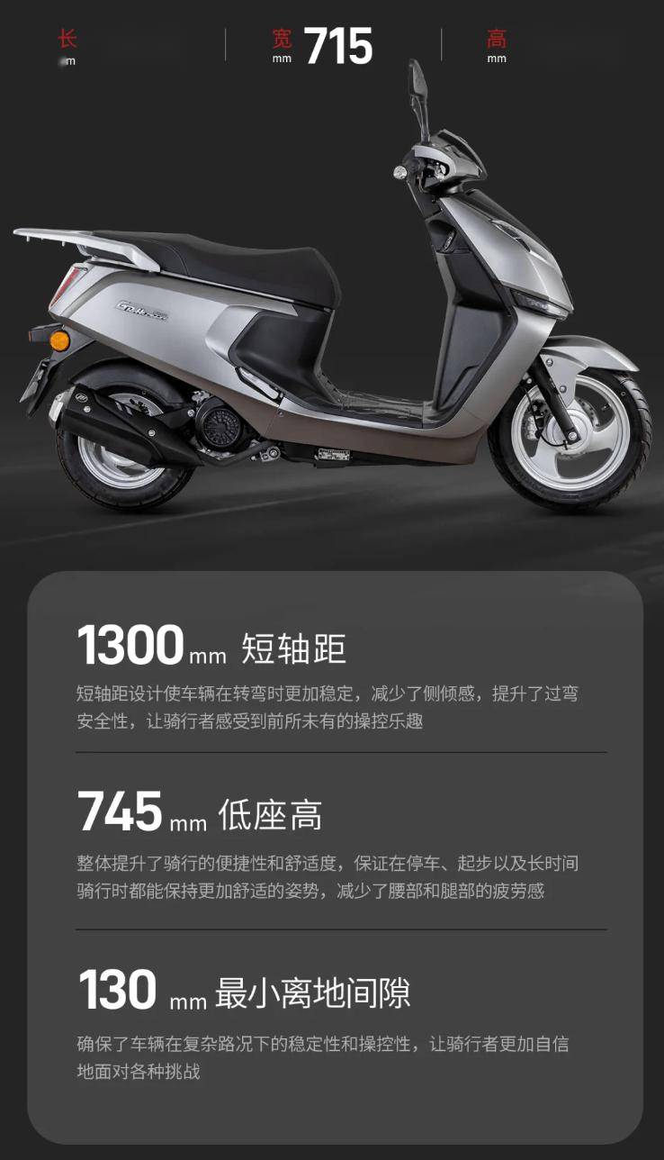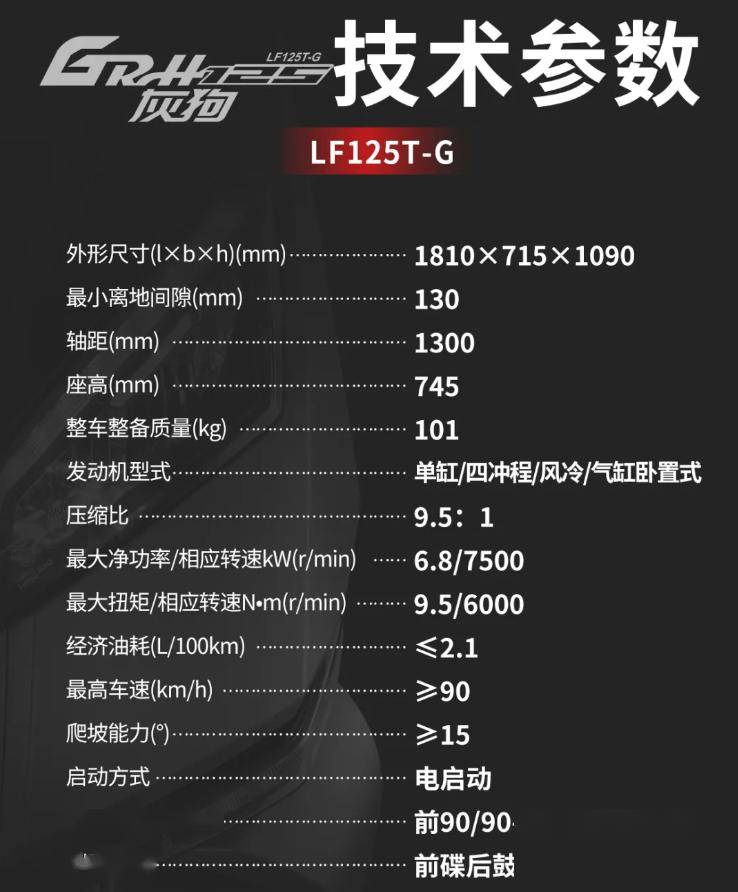 據(jù)介紹,力帆 GRH125 灰狗摩托車(chē)尺寸為 1810×715×1090mm,擁有 1300mm 短軸距和 745mm 低座高,最小離地間隙 130mm。