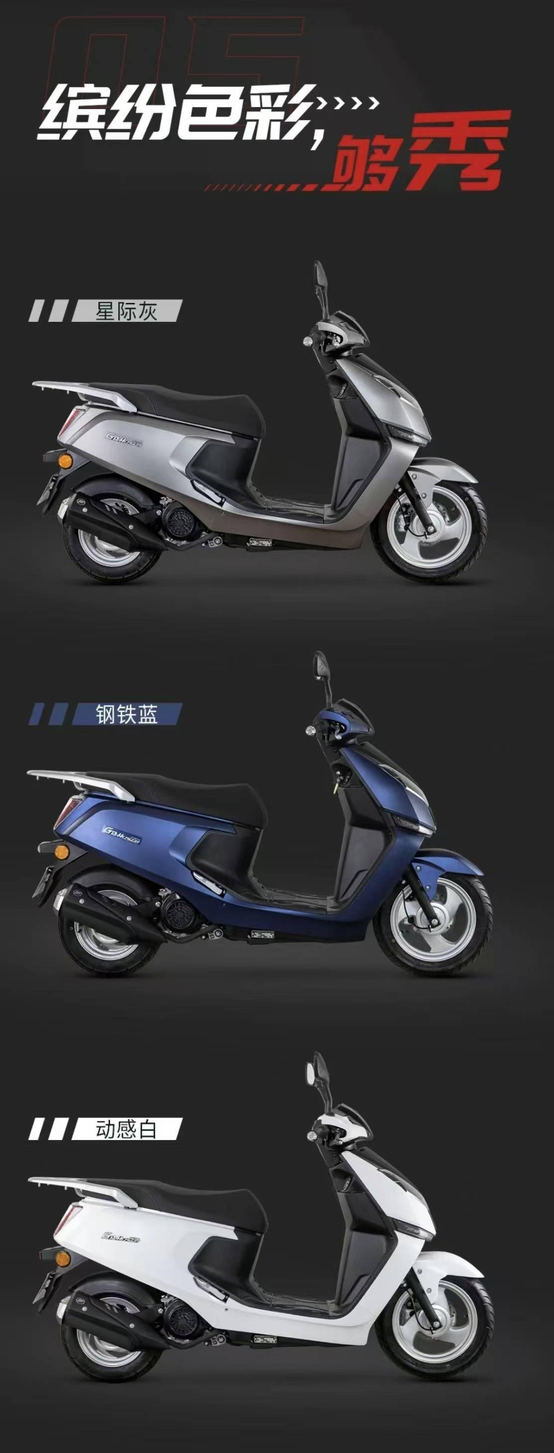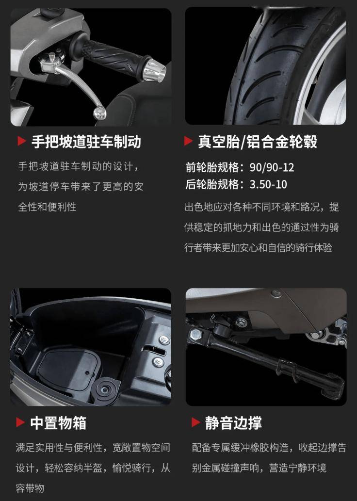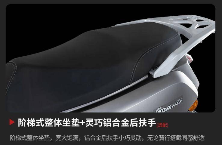力帆 GRH125 配備手把坡道駐車(chē)制動(dòng)、真空胎 / 鋁合金輪轂、中置物箱、靜音邊撐,以及階梯式整體坐墊 + 鋁合金后扶手;同時(shí)該車(chē)還搭載全系 LED 燈具、大屏負(fù)顯儀表、USB 充電接口、前置物箱等。