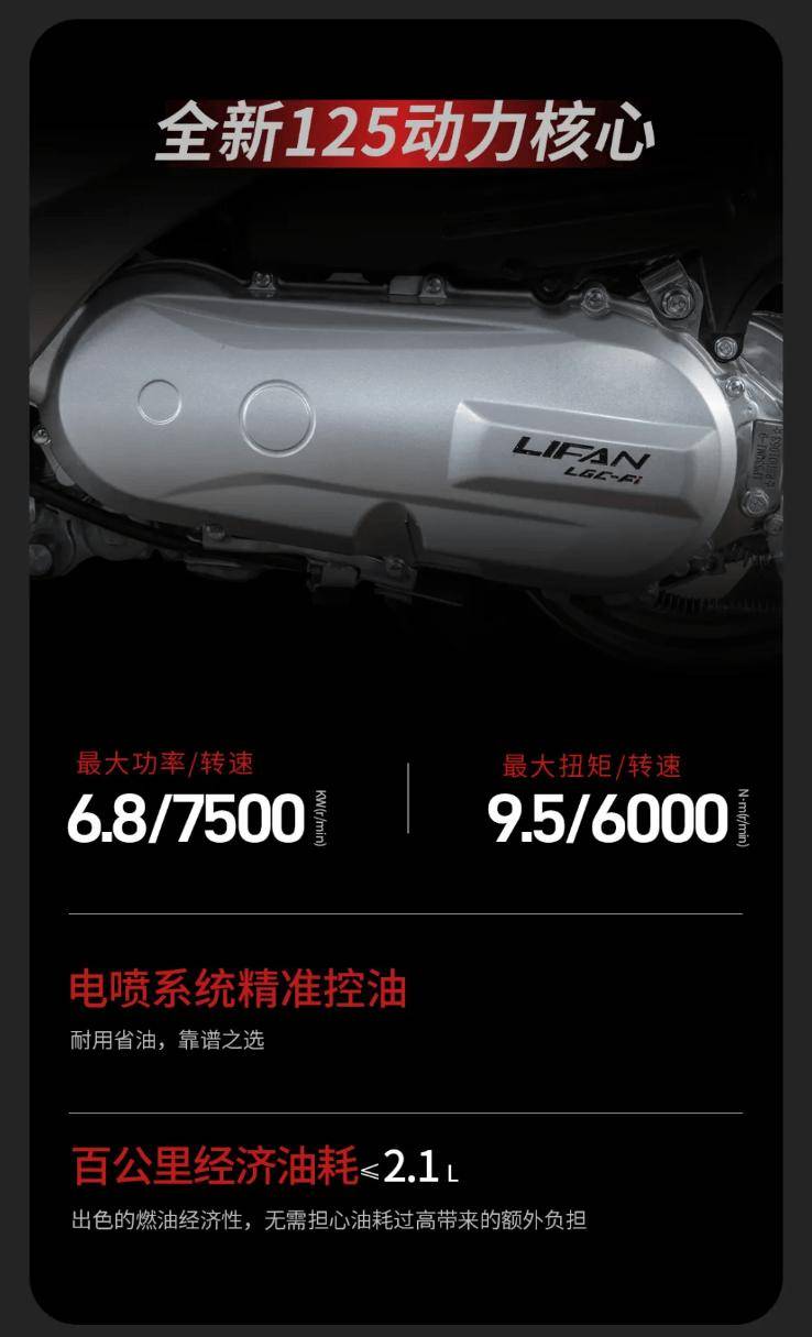 該摩托采用 125 動(dòng)力核心,最大凈功率 / 相應(yīng)轉(zhuǎn)速為 6.8 / 7500 kW(r/min),最大扭矩 / 相應(yīng)轉(zhuǎn)速為 9.5/6000 N?m(r / min)。該車(chē)采用電噴系統(tǒng)控油,百公里油耗≤2.1L。