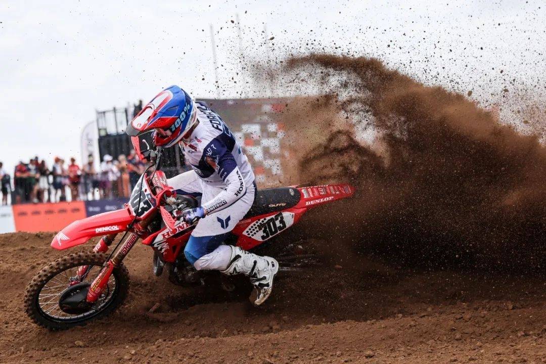 15日中午,備受期待的MXGP正賽正式打響。隨著一聲令下,MX2(250CC)組決賽率先開跑。車手們?nèi)珉x弦之箭,在泥濘的賽道上飛馳,引擎的轟鳴聲,觀眾的歡呼聲,此起彼伏,響徹全場。從高空俯瞰,賽道呈現(xiàn)出“賢”字的圖案,蜿蜒在廣闊的土地上,全長2000米的賽道上,16個坡道巧妙布局,最高點(diǎn)達(dá)到4.5米,最寬跨度達(dá)到60米,對車手們的技術(shù)和勇氣提出了極高的要求。他們憑借精湛的操控技巧和非凡的勇氣,駕駛摩托車在泥濘的賽道上騰空而起,劃出一道道優(yōu)美的弧線,穩(wěn)穩(wěn)落地后,迅速加速,繼續(xù)向前沖刺,展現(xiàn)出令人驚嘆的駕駛技術(shù)。觀眾們的熱情瞬間被點(diǎn)燃,車迷們揮舞旗幟,高聲吶喊,為支持的車手加油鼓勁。值得一提的是,越野摩托車愛好者任賢齊、李晨、明道等也來到現(xiàn)場觀賽。