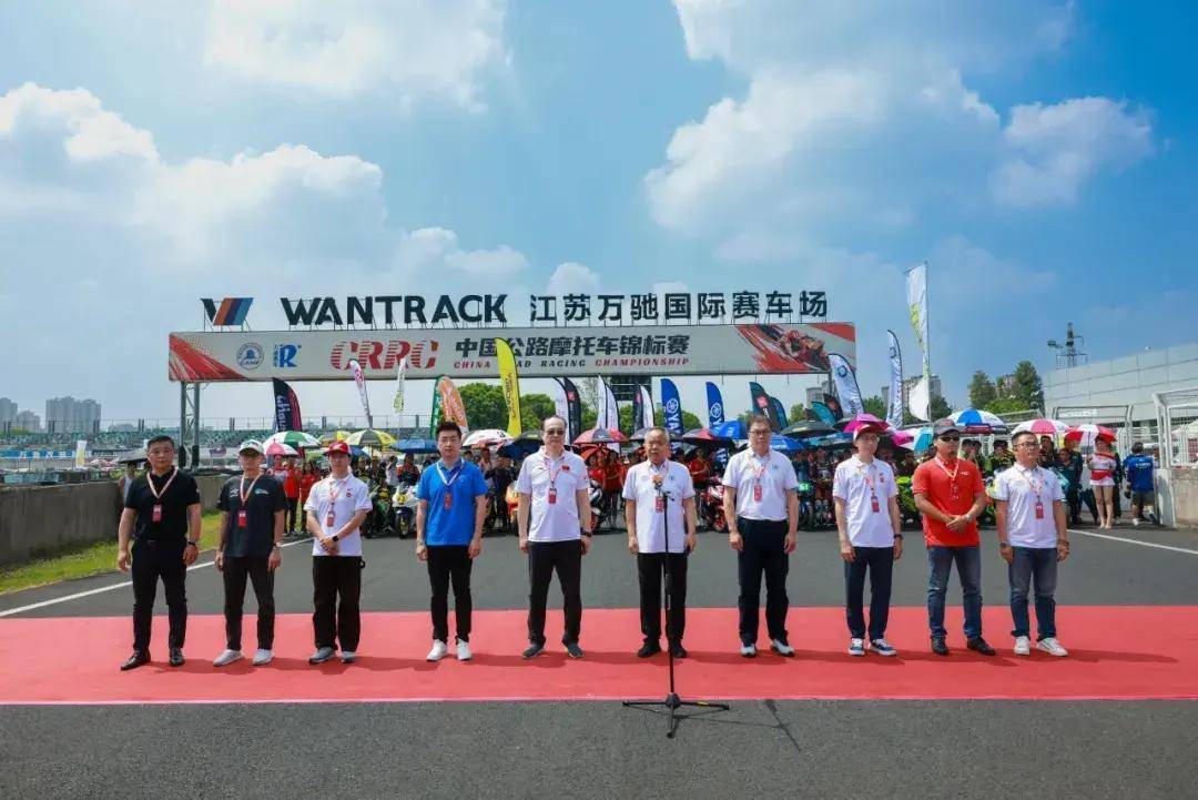 8日中午,賽事開幕儀式在發(fā)車區(qū)舉行。中國汽車摩托車運動聯(lián)合會專職副主席何建東、江蘇省汽車摩托車運動聯(lián)合會會長郝星辰、中國汽車摩托車運動聯(lián)合會公路摩托車專項委員會主任崔建軍、江蘇萬馳國際賽車場董事長劉振、新大洲本田區(qū)域銷售總經(jīng)理蔡路俊、新大洲本田品牌運營茍云飛、正新輪胎銷售總監(jiān)何俊偉、正新輪胎銷售經(jīng)理黃于修、萬威機油市場總監(jiān)陳耕園、江蘇萬馳國際賽車場總經(jīng)理竇崧、CRRC中國公路摩托車錦標(biāo)賽首席運營官/湖南株洲國際賽車場總經(jīng)理范子成,及車隊、車手代表出席了開幕式。