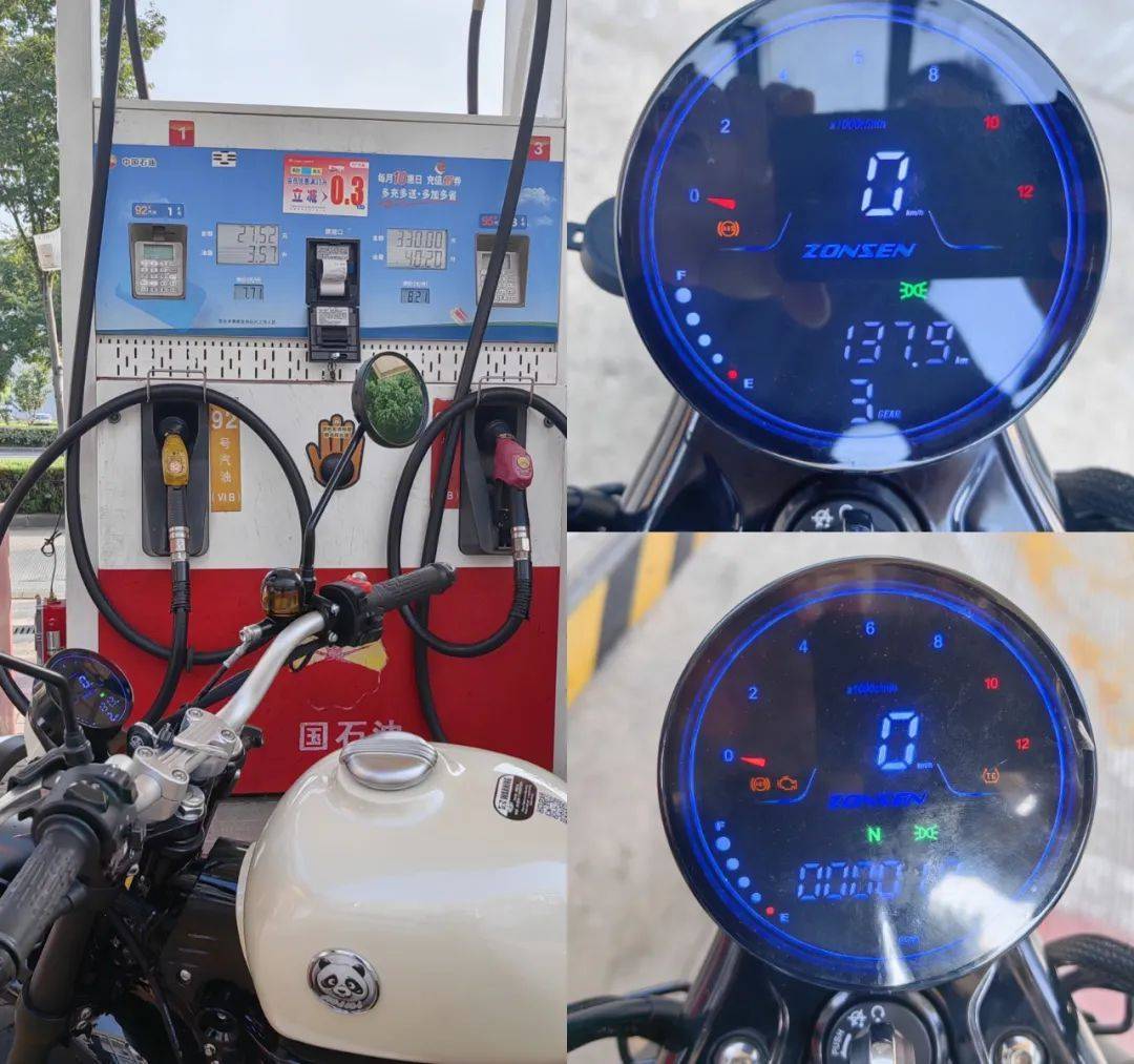 油耗表現(xiàn) 在我們經(jīng)過(guò)一天的暴力駕駛下來(lái),涵蓋了零百測(cè)試、極速體驗(yàn)、國(guó)道及市區(qū)擁堵路況,累計(jì)行駛里程為137.9km,重新加注滿燃油,消耗3.57L燃油,換算得出測(cè)評(píng)油耗為2.6 L/100km,要知道我們整體騎行還是很激烈的,道路狀態(tài)好的狀態(tài)下都是90km/h左右的速度騎行,日常使用下油耗應(yīng)該在2.2-2.5左右,結(jié)合墩墩11.5的大油箱,能滿足450km的最大續(xù)航,在mini車型領(lǐng)域絕對(duì)是超能跑的。