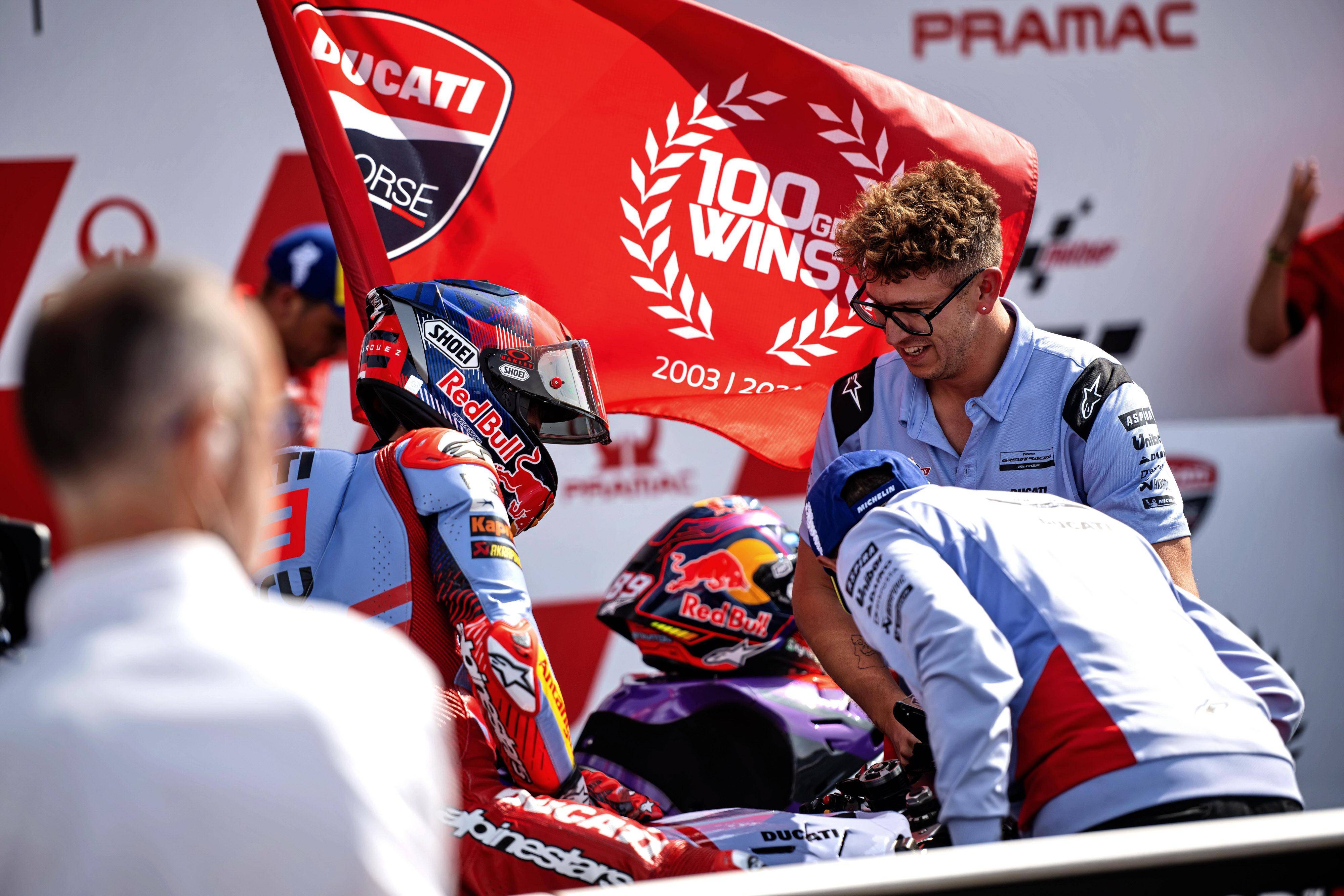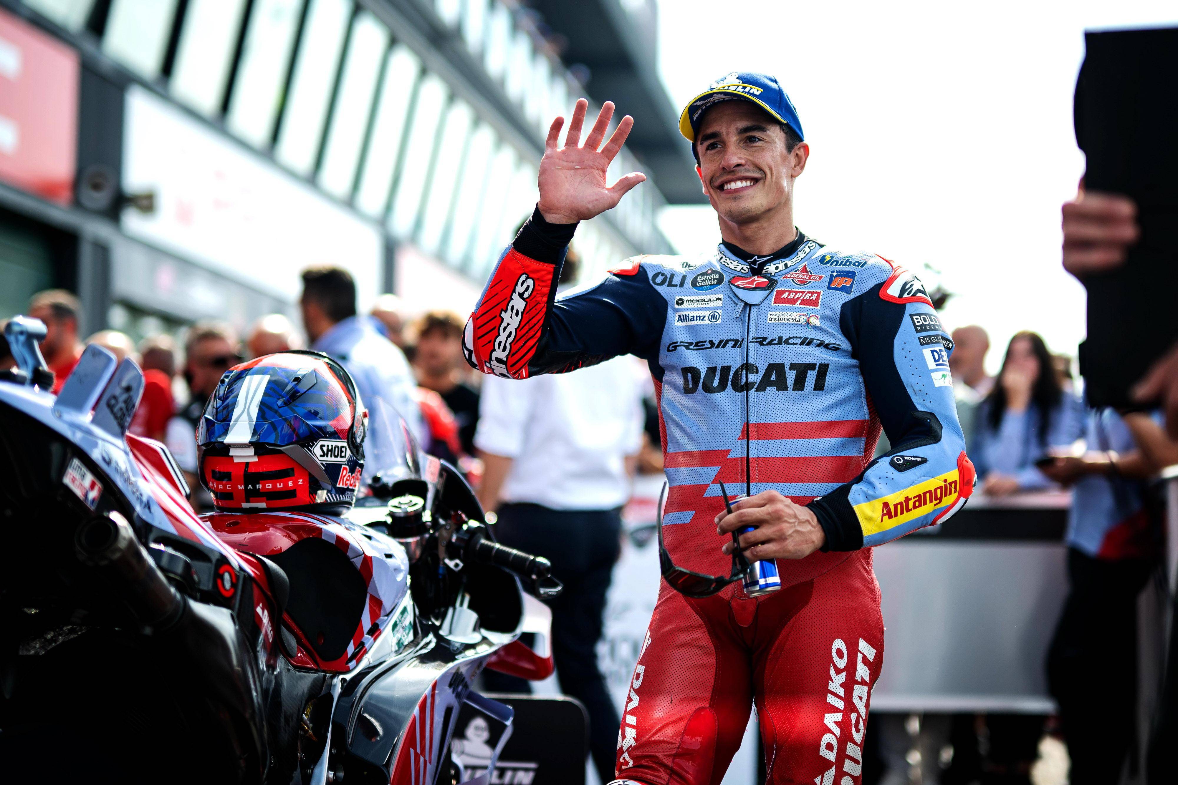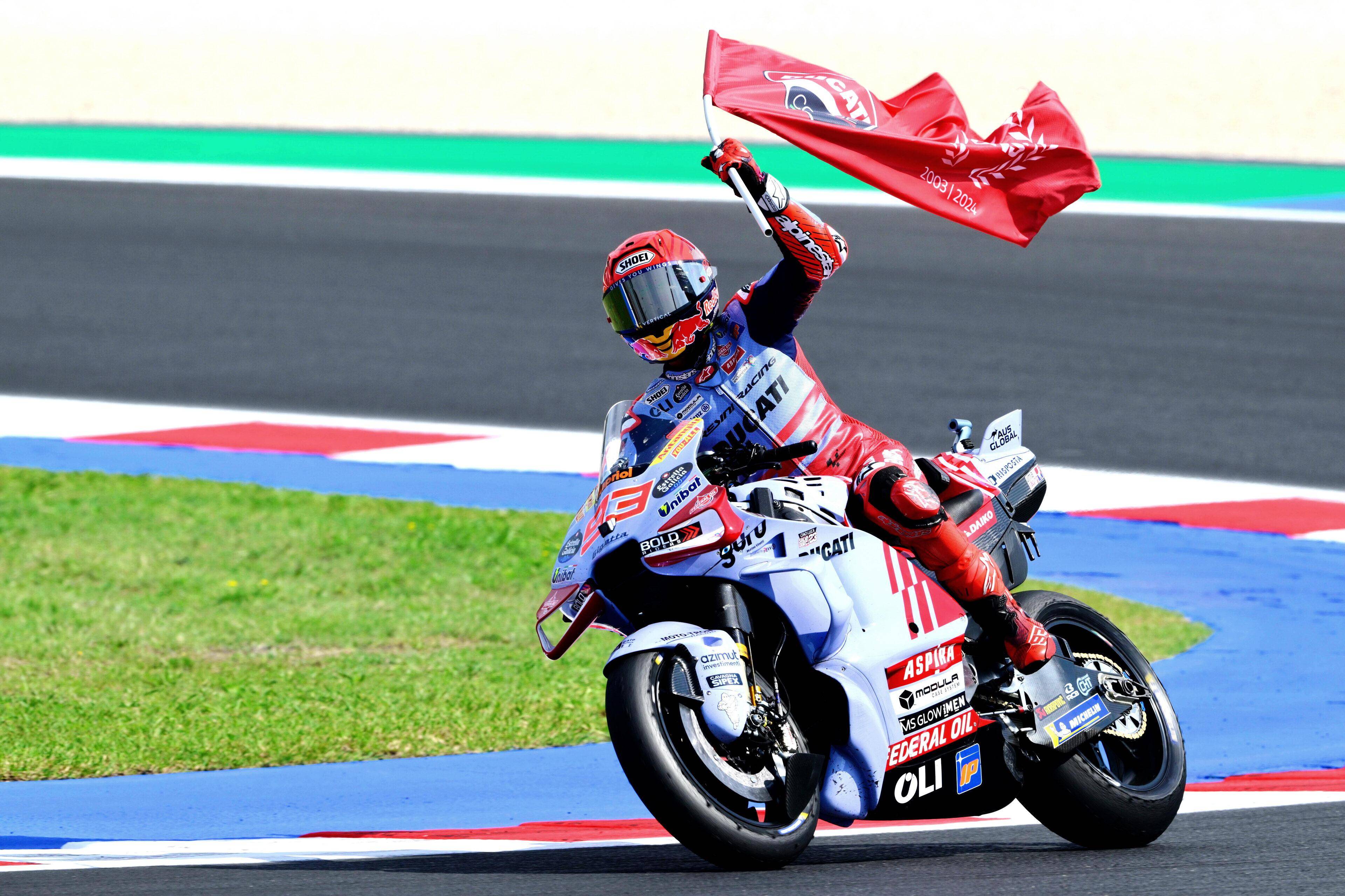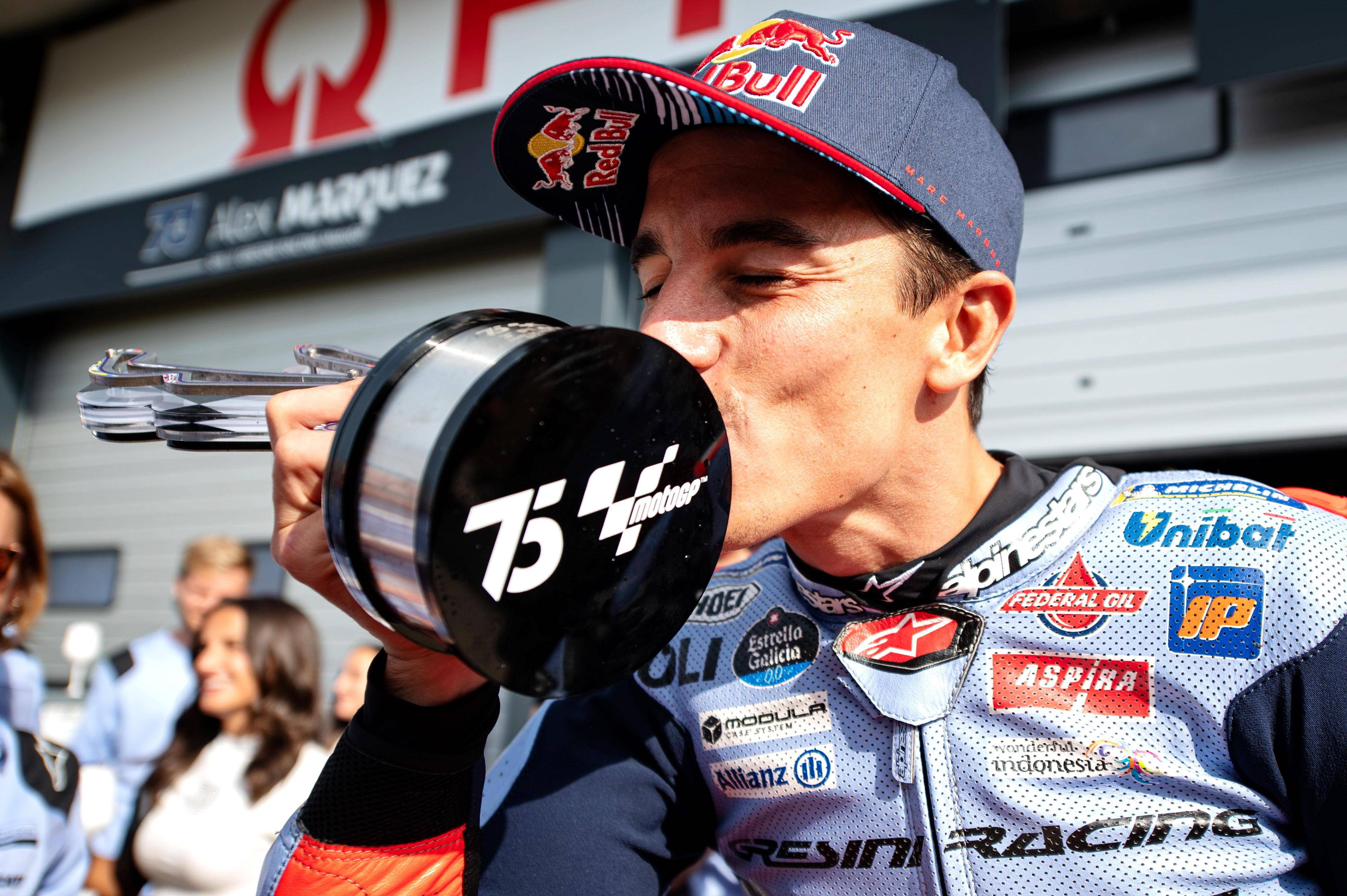 比賽結(jié)束后,馬昆斯表示,“ 讓我們享受這個(gè)領(lǐng)獎(jiǎng)臺(tái)吧、盡管我們的速度在今天應(yīng)該是第四名的。我本可以冒更多的風(fēng)險(xiǎn),然后以 3 秒的差距獲得第四,或者控制我的速度,以 8 秒的成績(jī)獲得第四,對(duì)手(指當(dāng)時(shí)跑在第三位、但在比賽后段摔車的巴納亞 Francesco Bagnaia)的失誤肯定對(duì)我們有幫助,讓我獲得了 16 分,(接下來(lái)我們)期待著下一站的印尼。”
