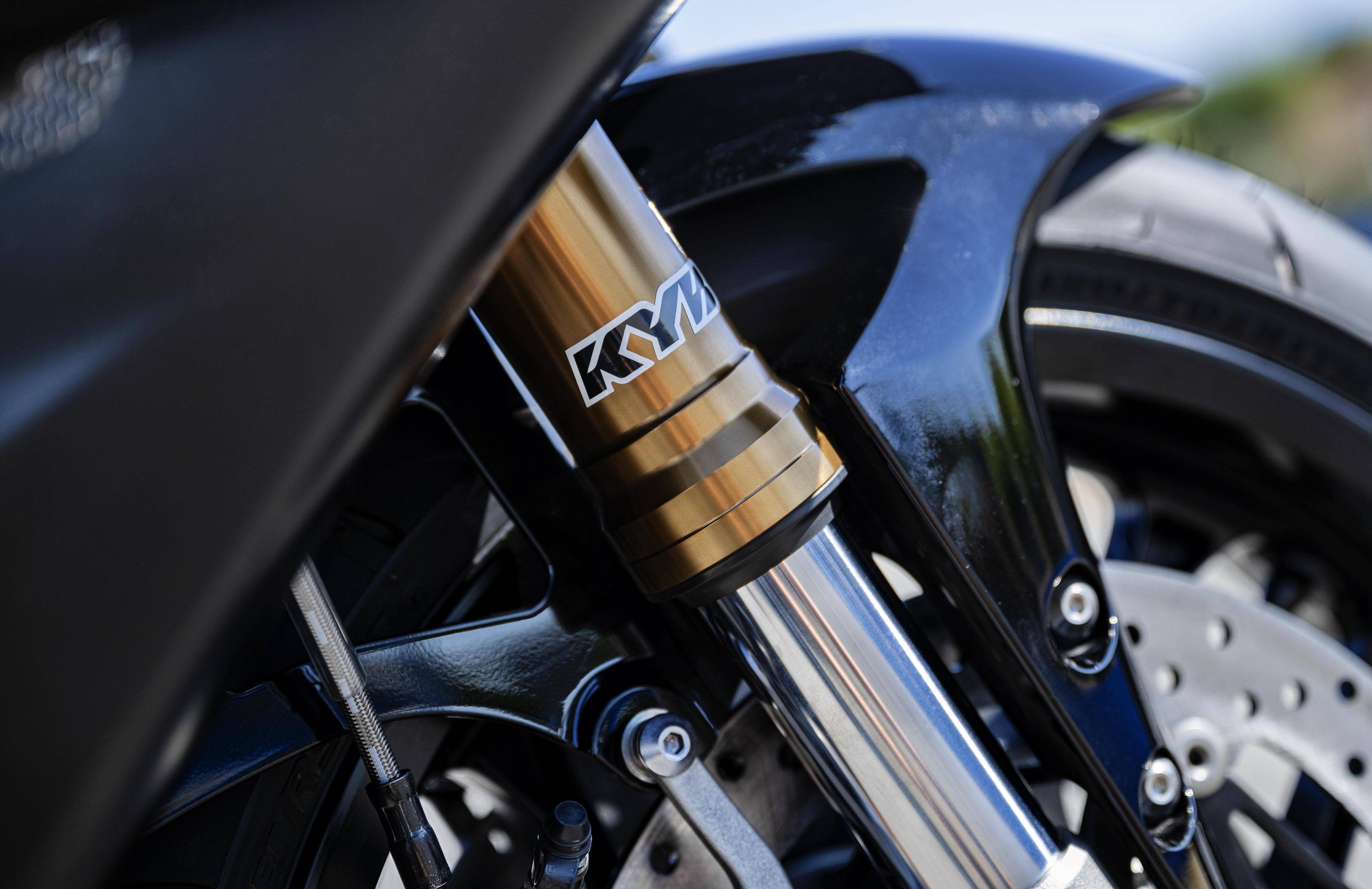 3、換裝了 KYB 配套的新一代全可調(diào)前叉。新前叉的叉芯采用了獨特的涂層,左、右叉配備了單獨的回彈和壓縮阻尼調(diào)節(jié)結(jié)構(gòu),每個都可以單獨調(diào)節(jié),右邊的前叉用于調(diào)?;貜椬枘幔筮叺那安嬗糜谡{(diào)節(jié)壓縮;