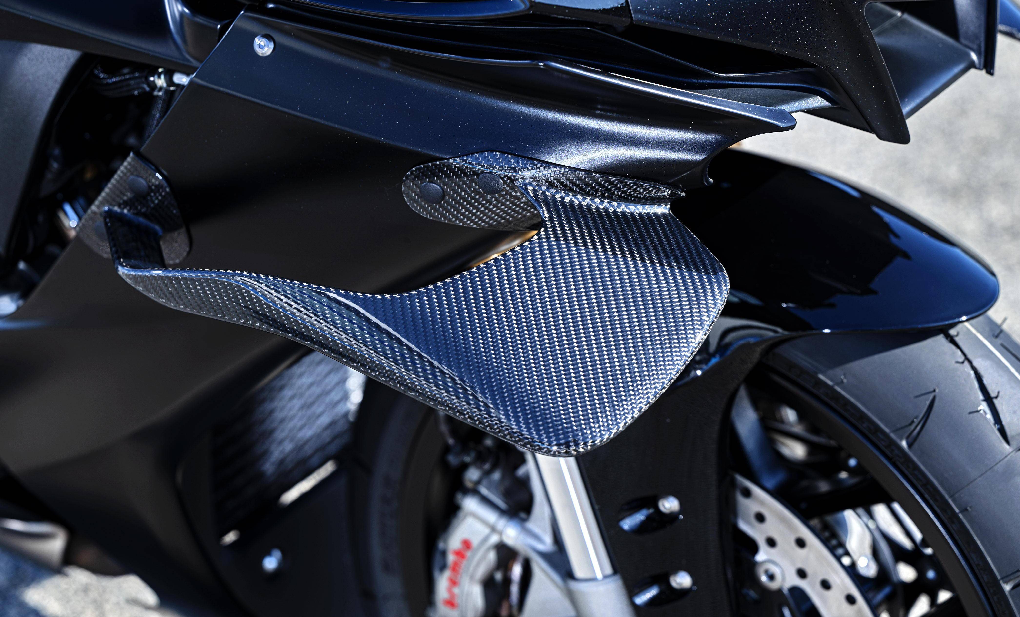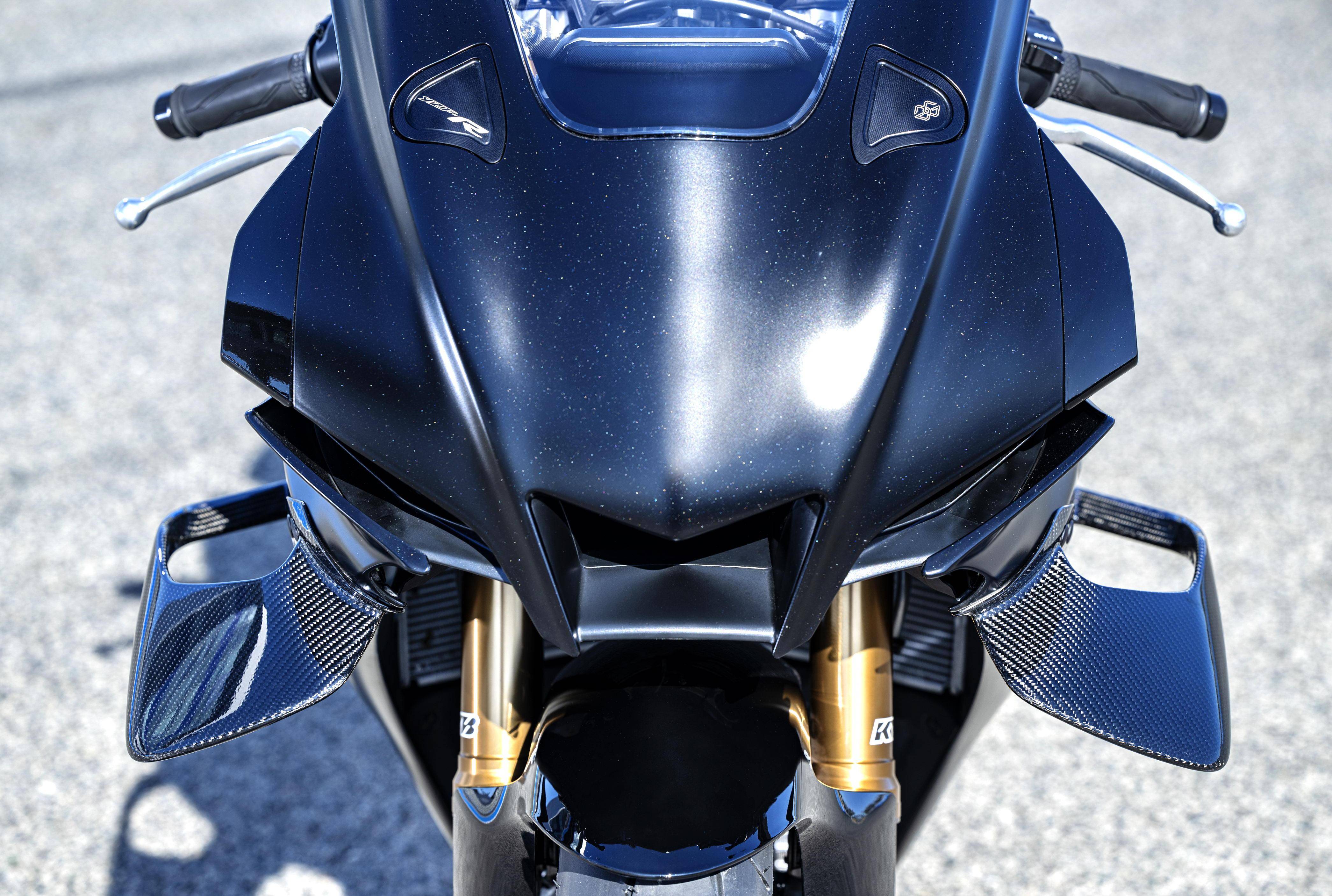 1、新車配備了全新設(shè)計的空氣動力組件。這套空氣動力組件根據(jù) MotoGP 工廠車隊的經(jīng)驗和技術(shù)反饋、設(shè)計和開發(fā)而成,能夠最大限度地發(fā)揮了 YZF-R1 對車輪控制的電子設(shè)計之效果,并改善了高速制動和轉(zhuǎn)彎時、車輛前端的感覺和反饋。而碳纖維制的定風(fēng)翼,在確保了足夠的強(qiáng)度和剛度的同時、并盡可能地降低重量。這一組件除了用于產(chǎn)生下壓力、提高車輛穩(wěn)定性之外,也使得 YZF-R1 的外觀更接近于現(xiàn)代 MotoGP 工廠賽車的風(fēng)格,同時也不影響其原本的流線型和令人回味的 YZF-R1 造型設(shè)計;