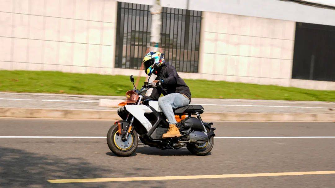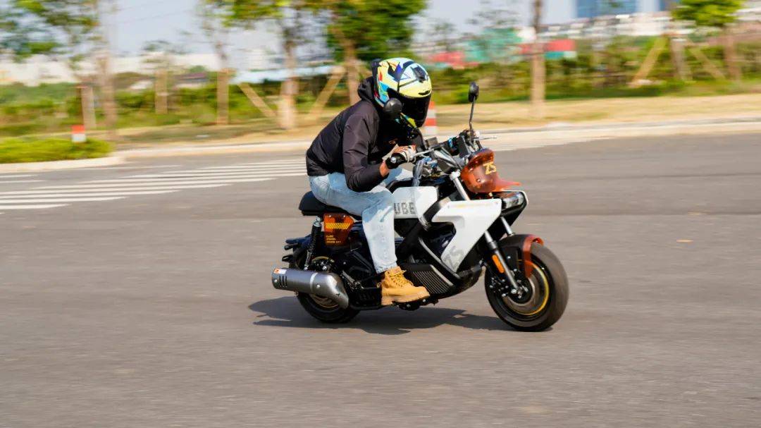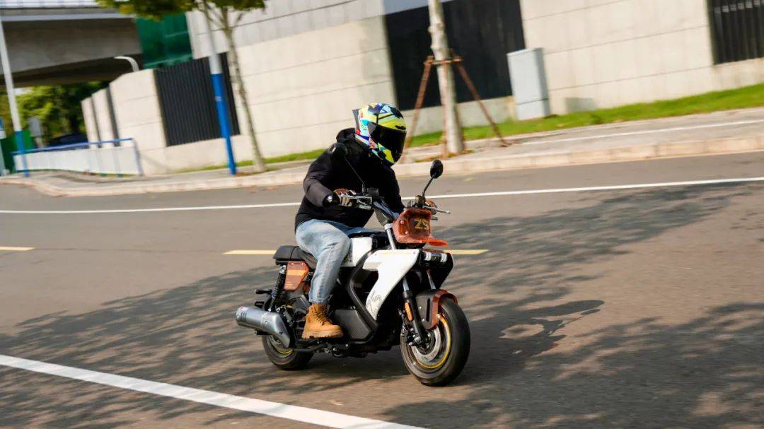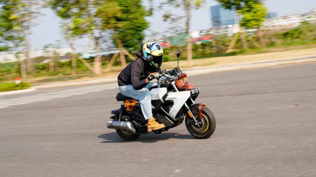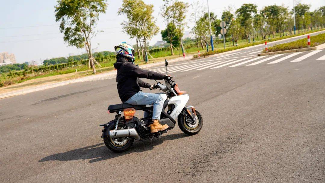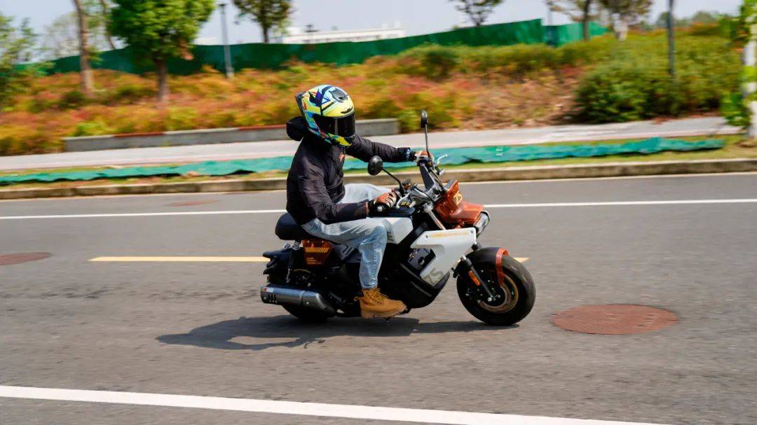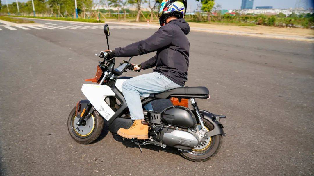 魔方的這套動力總成是CVT無極變速,水冷兩氣門的引擎,14.5N.m/6500rpm,11.5KW/8500rpm,合15.6匹的最大馬力堪稱mini車型中頂級水準,比一些150踏板要略大,只有120公斤的整備質(zhì)量,其加速性能值得期待。實測0-60最好成績?yōu)?.3s,0-80為10.8s,0-90為15.4s。這個加速成績超過了一些150踏板。在封閉道路較長距離加速,測得極速在106km/h,這樣的動力加速在mini車型中是非常強的, 比那種追求舒適休閑騎的150踏板要明顯快一些;同時CVT無級變速又讓這臺車擺脫了頻繁換擋的煩惱,沒有任何操作門檻。由于引擎以及傳動箱都設(shè)定的靠后,導(dǎo)致整車的重心也是集中在車輛后半部,在騎行中(關(guān)閉TC的狀態(tài))大油門就會翹頭,相當好玩。魔方的這套CVT傳動在2500轉(zhuǎn)左右開始起步,大開油門時起步的前沖感強烈,動力接入絲滑,沒什么抖動感。60之前的加速凌厲,80km/h速度下的加速感依然明顯,在時速90km/h之后的加速感大幅減弱,可以清晰的看出動力的輸出方向偏中低轉(zhuǎn)輸出,更符合這臺mini車的使用特性,低扭表現(xiàn)出色,是其顯著特點,更適合日常使用。當然不能避諱不足,由于魔方采用踏板CVT傳動的方式,使得整車的重心靠后,前輪的負載相較于傳統(tǒng)車型偏輕,在時速90以上出現(xiàn)一定的前輪不穩(wěn)定感,90以上高速行駛給人的安定感一般。結(jié)合使用場景來看,魔方的這個表現(xiàn)談不上缺點,畢竟一臺主打街道使用的mini車型,用來跑高速已經(jīng)是有點為難,日常也很少用到。因為車子輕,加上14.5牛米的扭矩也算強,這種20度出頭的水泥陡坡,坡底起步一把油門就能直接上。同樣表現(xiàn)出色的還有震動抑制方面,怠速時整車的震感細微,基本感知不到震動,即使在時速106km/h的極限狀態(tài)下,手把坐墊后視鏡也都沒有較大的震感,處于正常且可接受的范圍內(nèi),就震動抑制總體表現(xiàn)良好偏上。