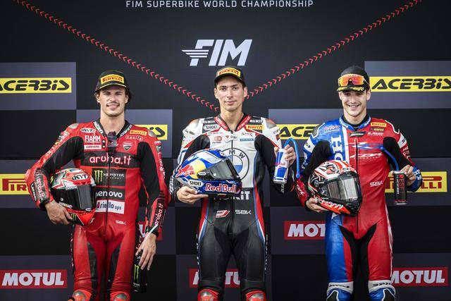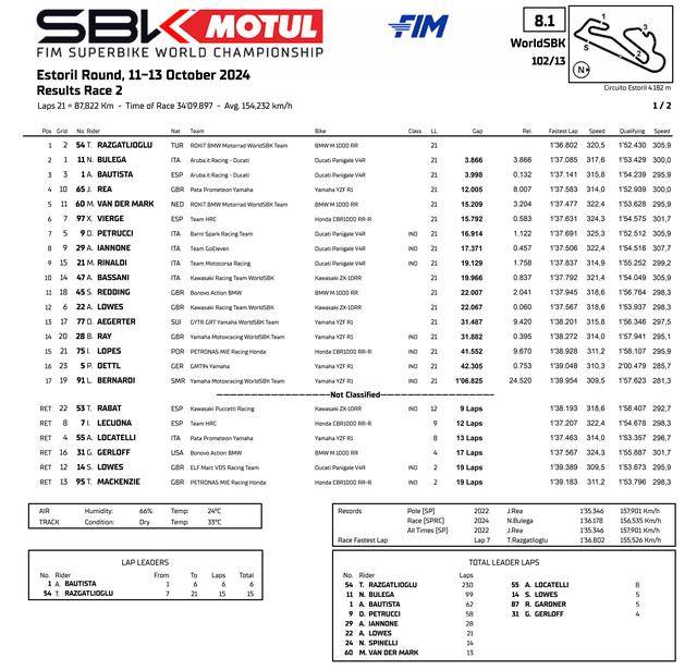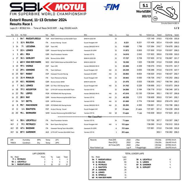 WSBK 級別的兩節(jié)正式比賽,賽程均為 21 圈、折合約 88 公里。從排頭位出發(fā)的拉格里奧盧、開局并不順利,完成第 1 圈比賽回來、他的位置處于第四;到了第 4 圈、他重新回到了領(lǐng)先的位置上,到第 9 圈時,拉格里奧盧已經(jīng)拉開了與后車超過 1 秒的距離。最終,拉格里奧盧以大幅的領(lǐng)先優(yōu)勢、順利奪得了第一節(jié)比賽的冠軍,落后 9 秒多、11 號車的布雷加(Nicolo Bulega)拿到第二,駕駛 7 號車的西班牙車手萊庫納(Iker Lecuona)獲得了第三。