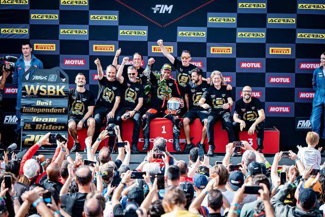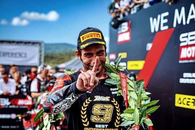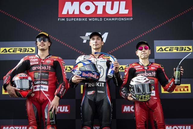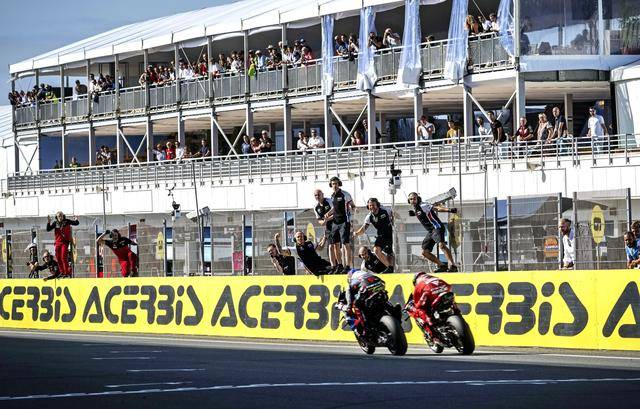賽程為 10 圈的 Super Pole Race 超級排位賽正賽,冠軍的爭奪是激烈的肉搏戰(zhàn),兩位今年世界冠軍的爭奪者,拉格里奧盧與布雷加,從起步一直拼到最后沖線。最終,布雷加以 0.003 秒之差奪得了勝利,幾乎貼著一起沖線的拉格里奧盧拿到第二,1 號車的捌弟(Alvaro Bautista,巴迪斯塔)拿到了第三。