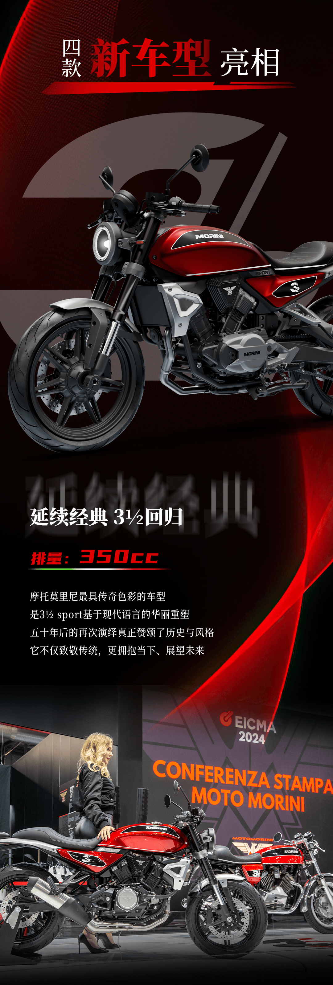 核心提示:十一月 5 日揭幕的 EICMA 2024 米蘭車(chē)展,Moto Morini 摩托莫里尼發(fā)布了四個(gè)新車(chē)型:搭載 V 型兩氣缸、排氣量 350 cc 級(jí)別發(fā)動(dòng)機(jī)