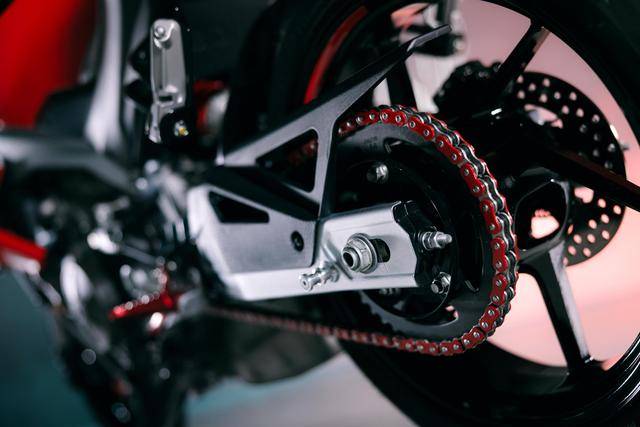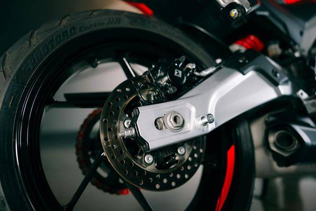 4、懸掛和制動系統(tǒng),與 RS 457 同規(guī)格:懸掛系統(tǒng),前面是叉芯口徑為 41 mm 的倒立式前叉、行程為 120 mm,單筒式后減震的行程為 130 mm;Brembo 布雷博在印度的子公司 ByBre 配套的剎車卡鉗,直徑為 320 mm 的前剎車碟、220 mm 的后剎車碟,并搭載了雙通道的 ABS;