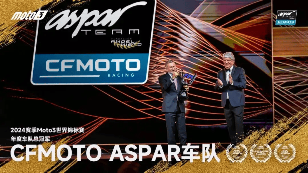 本場(chǎng)收官戰(zhàn)過(guò)后,MotoGP的頒獎(jiǎng)儀式上,CFMOTO也如愿從FIM主席Jorge Viegas手中,接過(guò)了象征榮耀的Moto3年度制造商冠軍的獎(jiǎng)杯。CFMOTO ASPAR車隊(duì)也成為了今年MotoGP三個(gè)組別當(dāng)中,唯一包攬車手、車隊(duì)、制造商總冠軍的車隊(duì)。