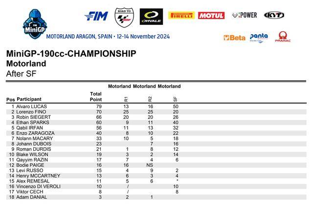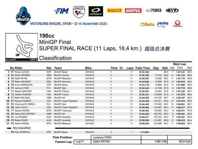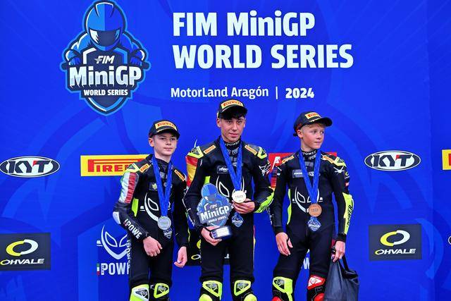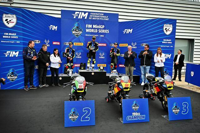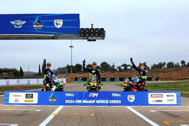 憑借著在超級(jí)總決賽奪冠的雙倍積分,以及兩節(jié)正式比賽里、相對(duì)穩(wěn)定的表現(xiàn)(第四和第三名),駕駛 87 號(hào)車、來自西班牙的應(yīng)屆冠軍盧卡斯(Alvaro Lucas),以 79 分奪得了 FIM MiniGP 2024 全球總決賽 190 組的冠軍,這是他連續(xù)第二年獲得這項(xiàng)大賽的冠軍;81 號(hào)車的意大利車手菲諾(Lorenzo Fino)以 70 分拿到了亞軍,75 號(hào)車、來自德國的斯格特(Robin Siegert)以 66 分獲得了季軍。