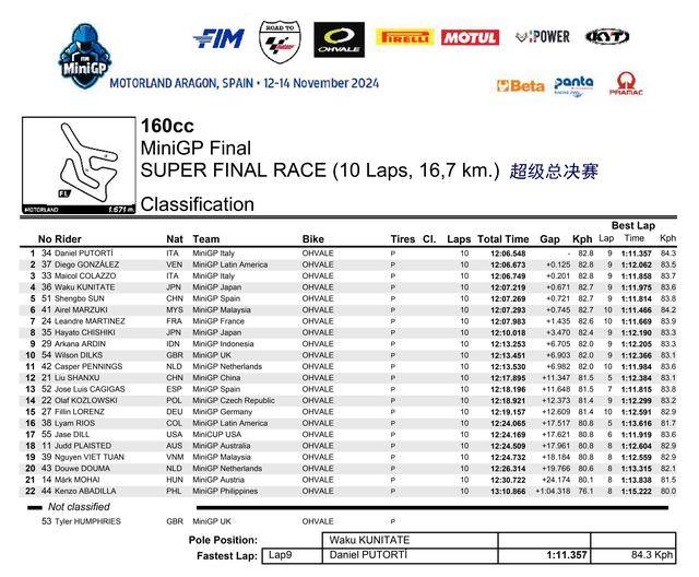 盡管在雙倍計(jì)算積分的超級(jí)總決賽中、只拿到了第三名,但在兩節(jié)正式比賽里都奪得了冠軍、駕駛 36 號(hào)車的日本車手國立和玖(Waku Kunitate),最終以 76 分、奪得了 FIM MiniGP 2024 全球總決賽 160 組的冠軍,成為第一位在這項(xiàng)賽事中奪冠的日本車手;駕駛 34 號(hào)車的意大利車手普托蒂(Daniel Putorti)奪得了超級(jí)總決賽的勝利,最終以 70 分獲得了亞軍;37 號(hào)車、來自委內(nèi)瑞拉的岡薩雷斯(Diego Gonzalez)以 64 分獲得了季軍。