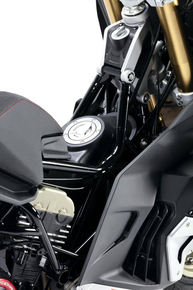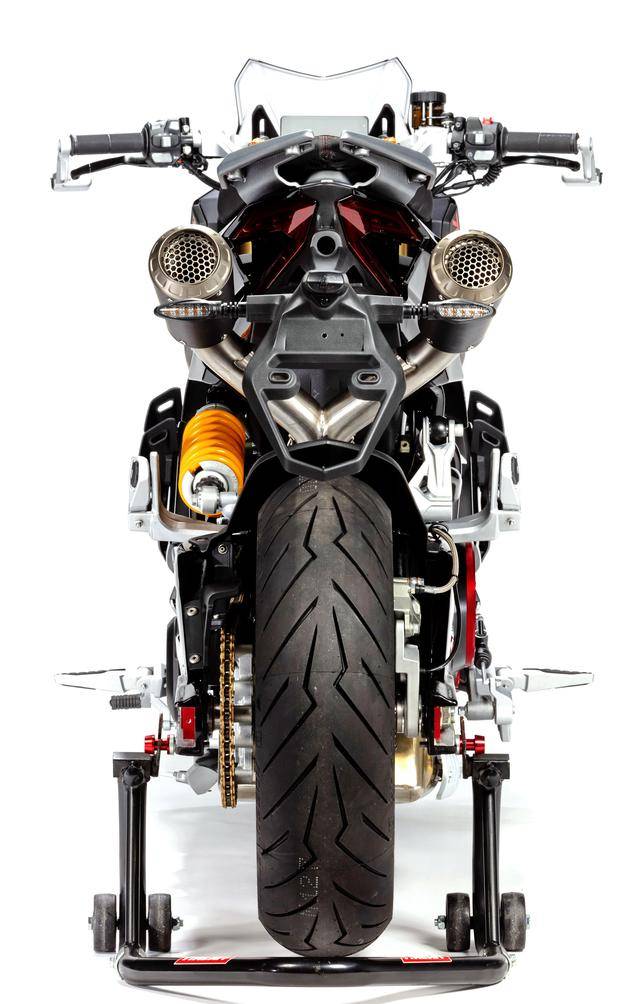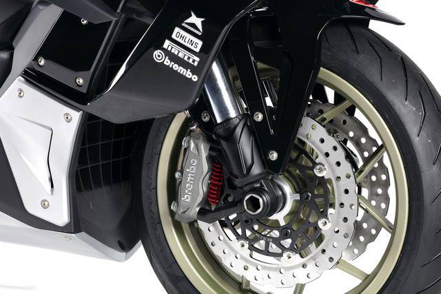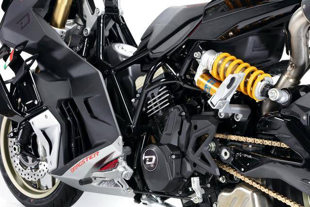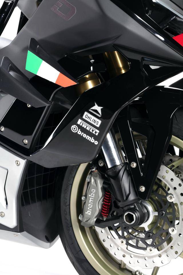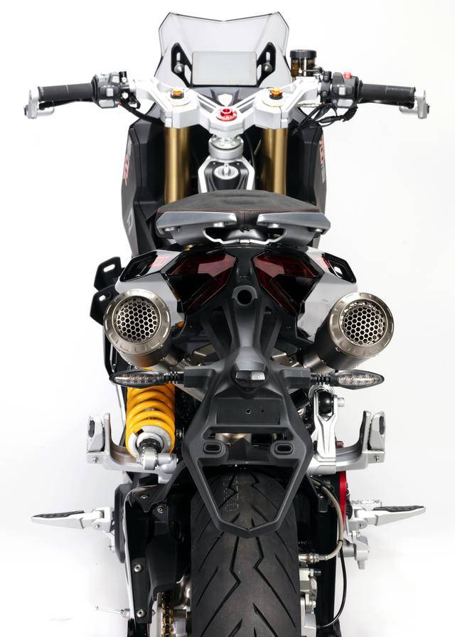 車體方面,采用全外露設計的鋼管式車架,有著高辨識度的外觀造型、與 MotoGP工廠賽車相比也毫不遜色的空氣動力組件;Marzocchi 配套的倒立式前叉,Ohlins 奧林斯配套的后減震(左側偏置式安裝的設計)和轉向阻尼器;前 270 mm 雙碟、后 230 mm 單碟的制動系統(tǒng),Brembo布雷博配套的剎車卡鉗、標配了 ABS;直徑為 15 英寸的前后輪框,全 LED 光源的燈光系統(tǒng),數(shù)字式的儀表板等。