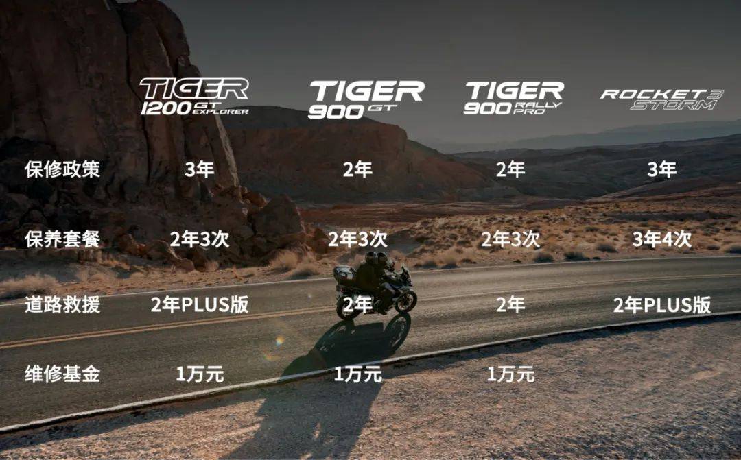 凱旋還同步推出了專為探險騎士量身打造的全方位配套服務體系,購買凱旋Tiger系列車型,即可享受最高三年質(zhì)保、一萬元維修基金、兩年三次保養(yǎng)套餐及兩年道路救援服務,為探險騎士提供全方位保障。凱旋通過這一專屬服務體系,致力于為車主打造無憂的騎行體驗,讓每一位騎士不僅享受車輛卓越性能與可靠性,更感受到品牌的貼心關懷與全程守護。