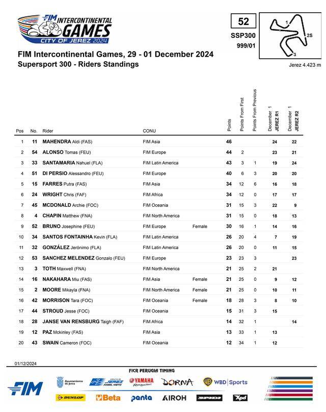 最終,綜合八位車手的成績,有著較高綜合水平的歐洲摩聯(lián)、奪得了首屆 ICG 的總冠軍;亞洲摩聯(lián)奪得了亞軍,其中應(yīng)屆的 WorldSSP300 世界冠軍馬亨德拉(Aldi Mahendra)拿到了 Supersport 300 組總分第一,另外兩位東南亞車手在 Supersport 組也分別獲得了總分第四、第五,助力亞摩聯(lián)拿下了佳績。而季軍則由大洋洲摩聯(lián)獲得。