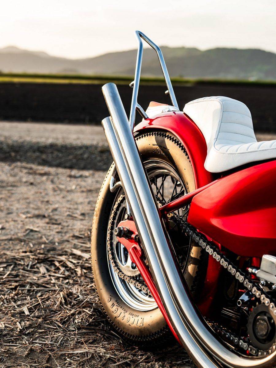 前后輪均采用鋼絲輻條輪框,配上Firestone輪胎,展現(xiàn)濃厚的復(fù)古韻味。 制動(dòng)系統(tǒng)則經(jīng)過升級,確保強(qiáng)大的剎車性能。 整輛摩托車被涂上耀眼的紅色車漆,車架與車身的色彩協(xié)調(diào)一致,讓人一見難忘。 此外,車輛其他部分的鍍鉻與拋光金屬處理,進(jìn)一步提升了整體視覺沖擊力。