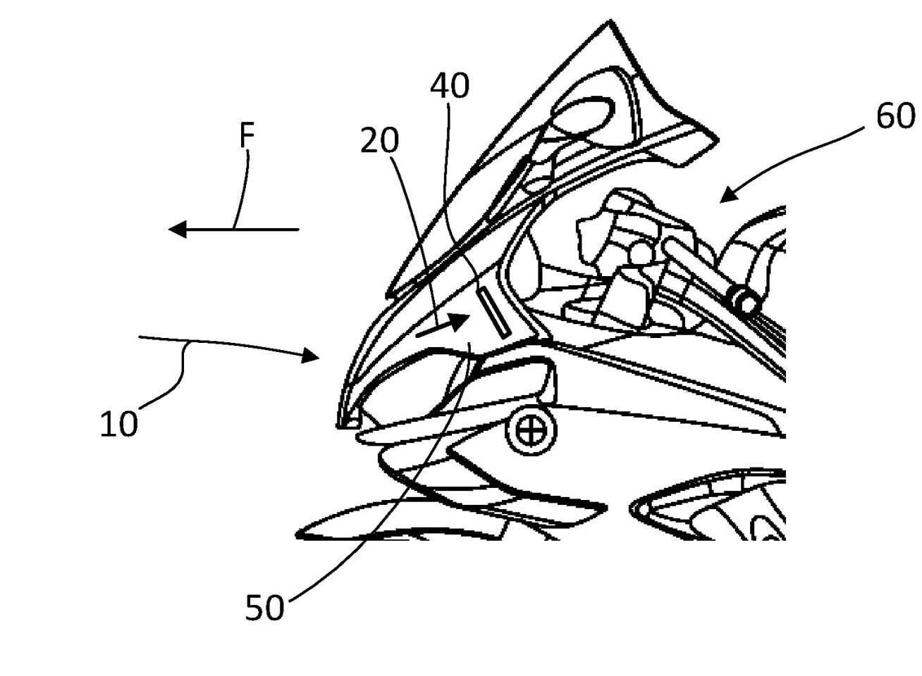 寶馬摩托的專利表明,從車頭進氣口將氣流導入,并且在握把附近形成90度的氣流排氣,可以達到類似Gurney Flap鴨尾的效果