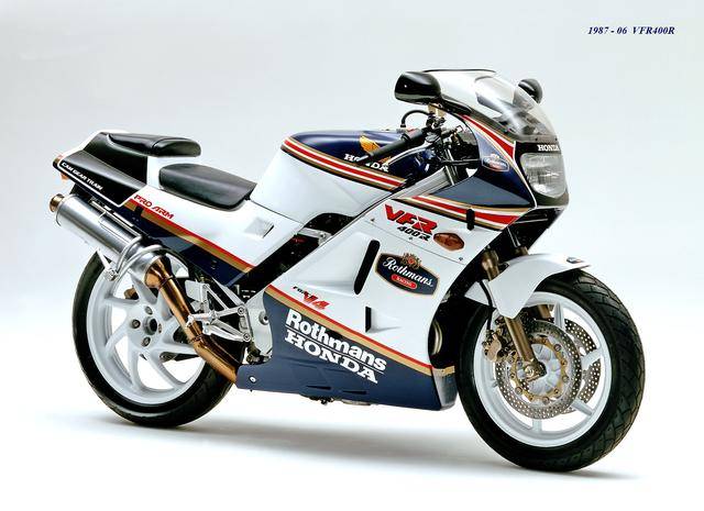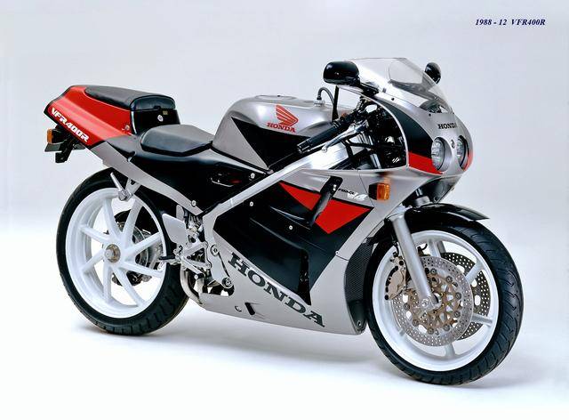 3、第一代的 VFR400R、VFR400Z 僅僅維持了一年,隨即被新一代的 1987 VFR400R(工廠編號 NC24)所代替。這一新的 VFR400R 有一個重要的標志性變化:換裝了他們在 1984 - 1986 WEC 世界耐力錦標賽里獲勝之工廠機器 RVF750 相同技術(shù)理念的、可實現(xiàn)快速更換后輪的最新裝備 —— 后單搖臂。這是 VFR400R 首次配備了后單搖臂,此外還有首次成為標準配置的浮動式雙前剎車碟。而沿用的 NC13E 發(fā)動機經(jīng)過重新調(diào)校,廠方將其稱之為 “ 與在 MFJ 全日本公路賽錦標賽 TT-F3 里面、取得壓倒性優(yōu)勢的工廠賽車 RVF400 同型的量產(chǎn)規(guī)格機器 ”,并換裝了 32 mm 的化油器,“ 由此,從低轉(zhuǎn)速到高轉(zhuǎn)速區(qū)域都發(fā)揮出敏捷、響應(yīng)性優(yōu)異且強而有力的輸出特性 ”;