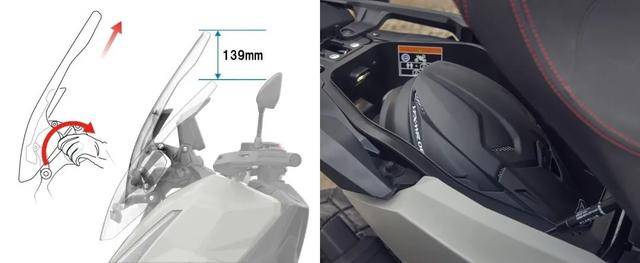 新款X-ADV坐墊下的收納空間達(dá)到了大容量的22L,收納空間內(nèi)配置了高亮度照明燈與USB接口。同時(shí)單手就能調(diào)節(jié)擋風(fēng)玻璃高度,風(fēng)擋最低位到最高位139mm可調(diào),輕松實(shí)現(xiàn)舒適的騎行體驗(yàn)。