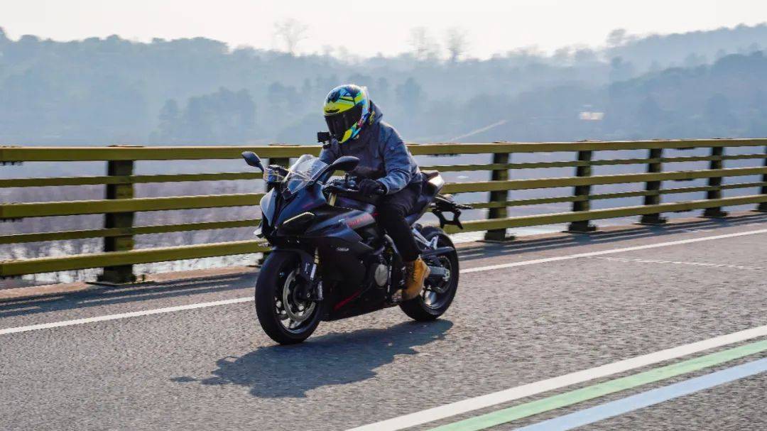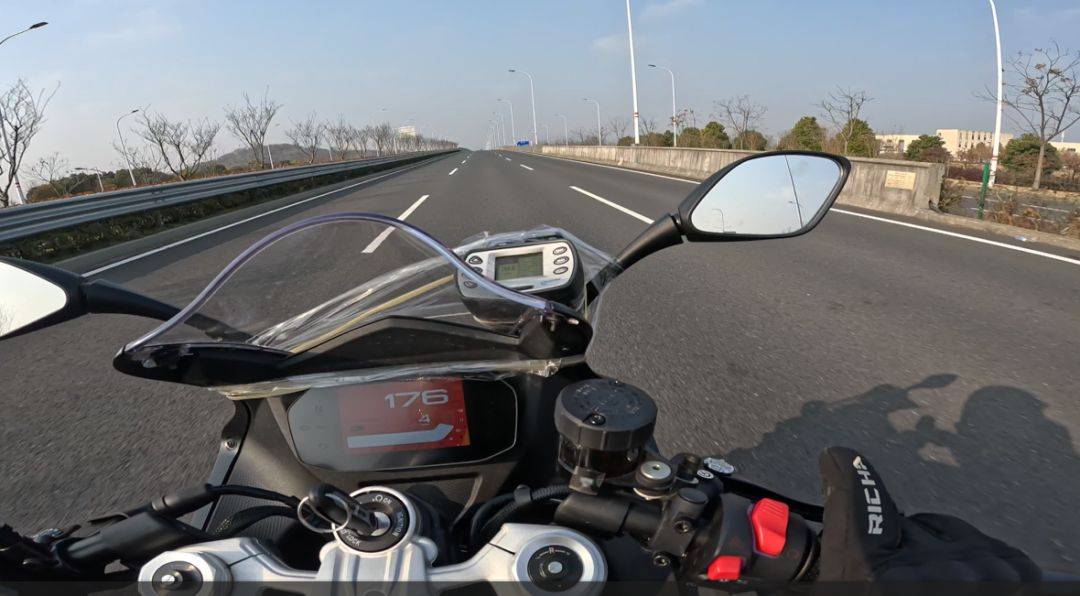 直列四缸680cc引擎,通過改變缸徑以及行程,使得最大馬力來到了101.3匹,最大功率74.5kw/11500rpm,最大扭矩68N.m/9000rpm,極限斷油轉(zhuǎn)速來到了12000rpm,帶來的加速感受也是截然不同于傳統(tǒng)四缸引擎,TC開啟的狀態(tài)下,大油門依舊可以做到動力翹頭,很好玩,駕駛樂趣足夠。在封閉場地下經(jīng)過不斷測試,標(biāo)準(zhǔn)模式下,600rs實測P-BOX的0到100km/h最好成績?yōu)?.8s,運動模式下,0到100km/h最好成績?yōu)?/span>3.6s,與網(wǎng)上博主測試的3.46秒略有一點差距,主要是出于安全和保護試駕車離合器,約9000轉(zhuǎn)起步,沒有憋到萬轉(zhuǎn)以上起步。標(biāo)準(zhǔn)和運動模式,能感受后者的油門響應(yīng)更為積極,更迅速,儀表的延遲更小,適合更為激進的駕駛狀態(tài)。對于3.6s這個加速成績大家心里有數(shù)就行,畢竟600級仿賽,大家都是在3秒出頭水準(zhǔn)。在常規(guī)道路上駕駛更多看中的還是車輛的再加速能力,以時速60km/h左右行駛,瞬間油門全開,600rs可以很輕松的來到120km/h,然后再次體驗120時的再加速能力,繼續(xù)油門全開,車輛依然能迅速提升到176km/h左右的高速,期間拖拽感十足,后段再加速依然強勁,基本能滿足到絕大部分摩友的動力需求,再加速能力非常強勁。值得一提的是600rs的動力特性,從低轉(zhuǎn)到高轉(zhuǎn)的延展性相當(dāng)出色,完全沒有低轉(zhuǎn)疲軟的感覺,和傳統(tǒng)四缸出力特性有很大差別。在1檔就可以做到110km/h左右的極限,此時P-BOX顯示101.3km/h,直接1檔破百,實力強悍,2檔的極速為142km/h,3檔的極速為175km/h,4檔的極速為211km/h,P-BOX實測193.6km/h,后續(xù)檔位的極速受制于路況限制,未能測得,參考友媒實測,表顯極速突破250是毫無疑問的,這個動力儲備足夠任何高速路況了。加速時輕松愜意,再加速能力強悍,稍不注意車速就已經(jīng)來到了130km/h,遇到車流時輕給油門,就能很輕松的超車,但在城市擁堵路況時走走停停,還是較為吃力的,好在較輕的離合器質(zhì)感,以及良好的擋位清晰度,兼顧舒適的坐姿,讓駕駛的疲累感不高。在超過150的時速,賽600rs的整車穩(wěn)定性表現(xiàn)出色,在高架橋上也沒有發(fā)飄感,值得稱贊,配合其極具拖拽感的動力輸出,駕駛起來激情滿分,但這套風(fēng)擋的風(fēng)阻保護效果一般,據(jù)悉工廠已經(jīng)在做優(yōu)化了。