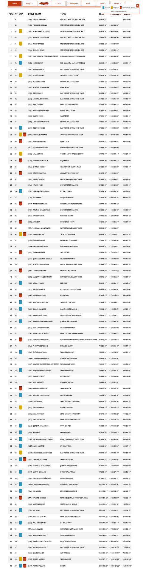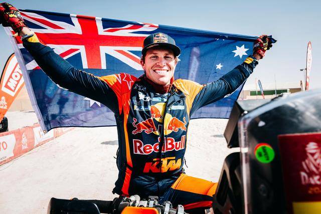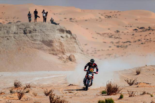 駕駛 4 號車的澳大利亞車手桑德斯(Daniel Sanders),在贏得了第一個特殊賽段的第一名之后,就一直在總時間榜上處于領(lǐng)先的位置上,并始終以快速的狂飆、力壓一眾的追趕者。最終,他在全程領(lǐng)先、并拿下五個特殊賽段第一名的出色表現(xiàn),以領(lǐng)先第二名接近 9 分鐘的優(yōu)勢、奪得個人的首次達喀爾冠軍。桑德斯的獲勝,讓 KTM在達喀爾拉力賽摩托車組的冠軍紀(jì)錄上升到第二十二次,且在 KTM 當(dāng)前境況下,這個冠軍顯得具有更加重要的意義。