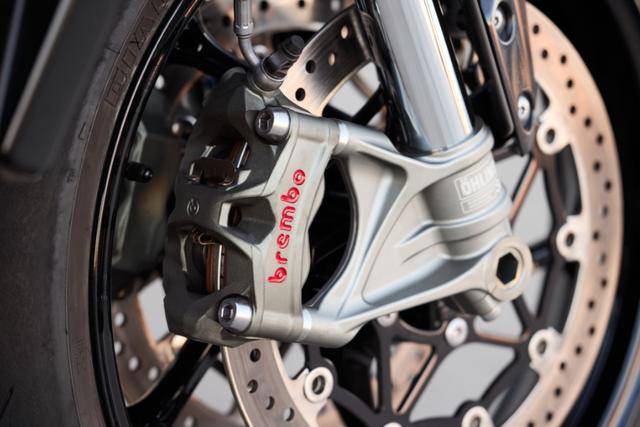 操控方面,2025款Speed Triple 1200 RS同樣表現出色。它采用了全新一代的Öhlins SmartEC3半主動懸掛系統(tǒng),前43mm倒立式前叉和后TTX36中置減震器均支持電子壓縮和回彈阻尼調節(jié),能夠根據實時騎行狀態(tài)自動調整阻尼,無論是直線加速、剎車還是激烈過彎,都能提供最佳支撐,提升整車穩(wěn)定性和舒適度。車主還可以通過Öhlins Objective based Tuning Interface(OBTi)進一步調整前后懸掛,以適應不同路況。此外,前剎系統(tǒng)采用了BremboStylema®卡鉗,配合MCS可調剎車杠桿,帶來了極致的剎車體驗,讓高速騎行更加安心。