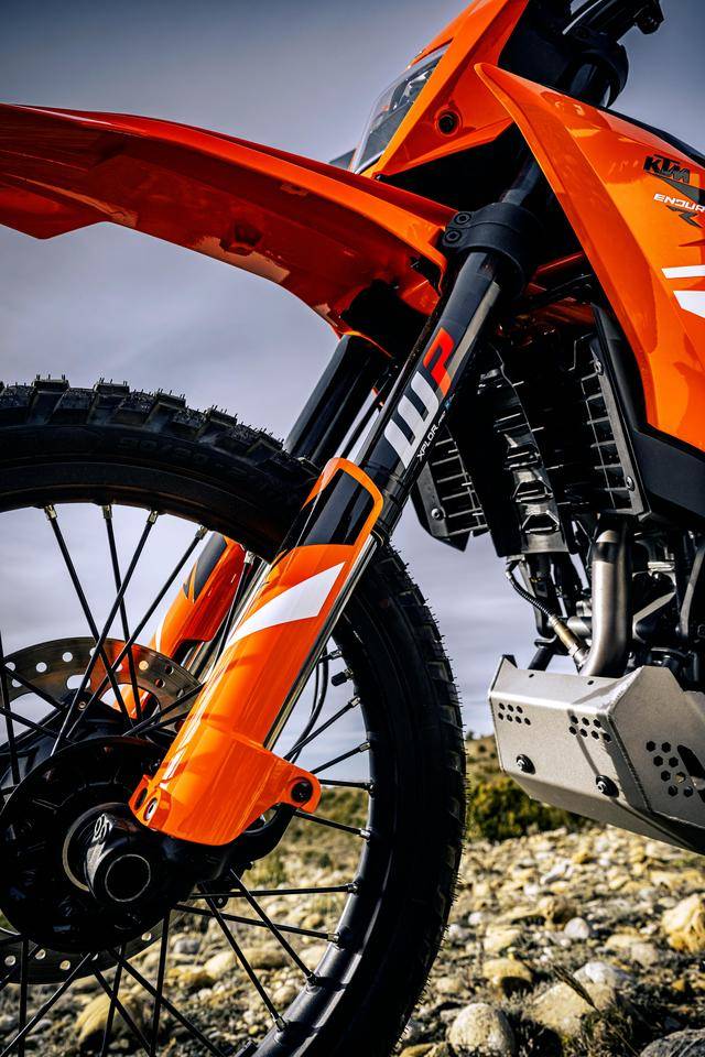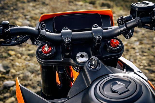 6、WP 配套的 APEX 前后懸掛系統(tǒng),前面是叉芯口徑為 43 mm 的倒立式前叉、后面是單筒式的后減震,前后懸掛的行程均為 230 mm(對(duì)應(yīng)同排量的街車版 Duke、前后懸掛行程為 150 mm);