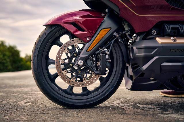 車身方面,采用一副鋁制的雙樑式車架,自 2018 年推出的新一代金翼換裝上的標(biāo)志性連桿式前叉、繼續(xù)成為 2025 版本的亮點(diǎn)之一,較低的 745 mm 鞍座高度,整備重量 373 公斤(基本型)、393 公斤(旅行版),容量為 21 公升的油箱,前 18、后 16 英寸直徑的車輪等。在基礎(chǔ)規(guī)格和配置上,新的 2025 金翼系列與現(xiàn)行款大致相同,主要的變化僅是添加了新的氧傳感器、經(jīng)過對應(yīng)更新的 ECU設(shè)置,讓新車符合歐五 + 排放標(biāo)準(zhǔn);升級了音頻/音響系統(tǒng)的連接,以及新的揚(yáng)聲器,新的車體圖案/貼花。