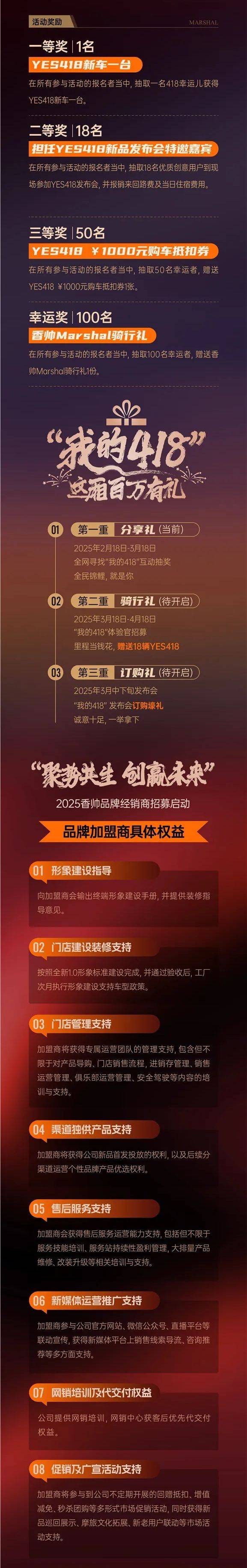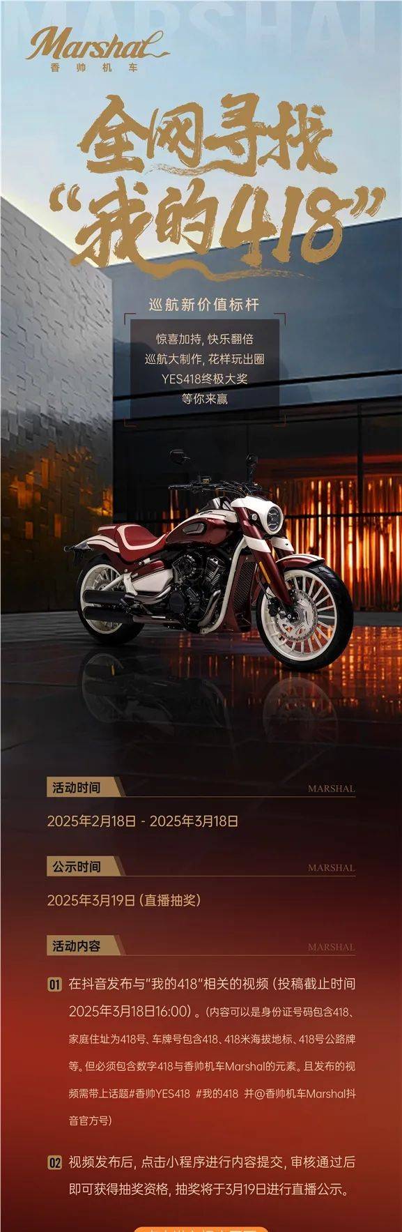 ·第一重·分享禮主題:全網(wǎng)尋找“我的418”(抖音活動(dòng))YES418即將上市活動(dòng)時(shí)間:2025年2月18日 - 2025年3月18日公示時(shí)間:2025年3月19日(直播抽獎(jiǎng))·參與方式:一、用戶在抖音發(fā)布與“我的418”相關(guān)的視頻(投稿截止時(shí)間2025年3月18日16:00)(內(nèi)容可以是身份證號(hào)碼包含418、家庭住址為418號(hào)、車(chē)牌號(hào)包含418、418米海拔地標(biāo)、418號(hào)公路牌等。但必須包含數(shù)字418與香帥機(jī)車(chē)Marshal的元素。且發(fā)布的視頻需帶上話題#香帥YES418 #我的418 并@香帥機(jī)車(chē)Marshal抖音官方號(hào))二、完成視頻發(fā)布,添加小帥微信報(bào)名審核,審核通過(guò)后獲得抽獎(jiǎng)資格,抽獎(jiǎng)結(jié)果將于3.19直播公示注:在此階段,聯(lián)合抖音機(jī)車(chē)垂類達(dá)人發(fā)布示范視頻(2月18~20日)(如“如何花式秀418”)·活動(dòng)獎(jiǎng)勵(lì):一等獎(jiǎng)(1名):YES418新車(chē)一臺(tái)(在所有參與活動(dòng)的報(bào)名者當(dāng)中,抽取一名418幸運(yùn)兒獲得YES418新車(chē)一臺(tái))二等獎(jiǎng)(18名):抽18名優(yōu)質(zhì)創(chuàng)意用戶到現(xiàn)場(chǎng)參加YES418發(fā)布會(huì)(在所有參與活動(dòng)的報(bào)名者當(dāng)中,抽18名優(yōu)質(zhì)創(chuàng)意用戶到現(xiàn)場(chǎng)參加YES418發(fā)布會(huì),包來(lái)回路費(fèi)及當(dāng)日住宿費(fèi)用)三等獎(jiǎng)(50名):YES418千元購(gòu)車(chē)抵扣券一張(在所有參與活動(dòng)的報(bào)名者當(dāng)中,抽取50名幸運(yùn)兒獲得YES418千元購(gòu)車(chē)抵扣券一張)幸運(yùn)獎(jiǎng)(100名):香帥Marshal騎行禮 (在所有參與活動(dòng)的報(bào)名者當(dāng)中,抽取100名獲得香帥Marshal騎行禮一份)