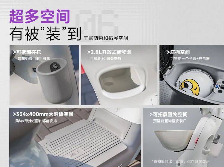 在實用性功能拓展方面的創(chuàng)新,是極核MO1的一大看點。車輛標配可拆卸杯托、2.8L開放式儲物盒、334*400mm大踏板空間以及座桶空間,同時還預留了前置物籃安裝螺孔,并支持用戶結(jié)合自身需求加裝帶娃、寵物出行、購物等套件,讓車輛實現(xiàn)“一車多用,自由切換”的獨特體驗,人人都能親手裝飾自己需要和喜愛的專屬MO1。
