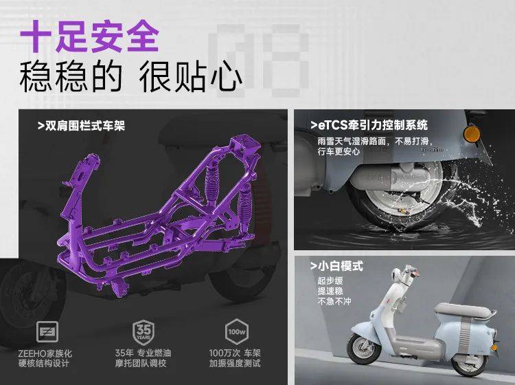 相對于同級產(chǎn)品,極核MO1針對女性出行需求進行定向調(diào)校,搭載小白模式,峰值功率達1400W,動力輸出更加強勁,但起步提速更加平順柔和,更加符合女性用戶操控習慣,同時搭載ETCS牽引力控制系統(tǒng),雨雪天氣濕滑路面不易打滑,而極核家族化的雙肩圍欄車架,也讓車輛更加牢靠耐用。