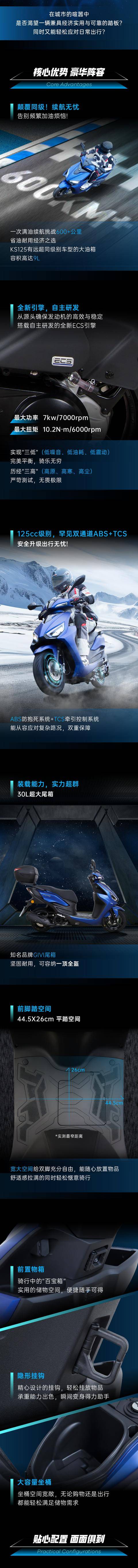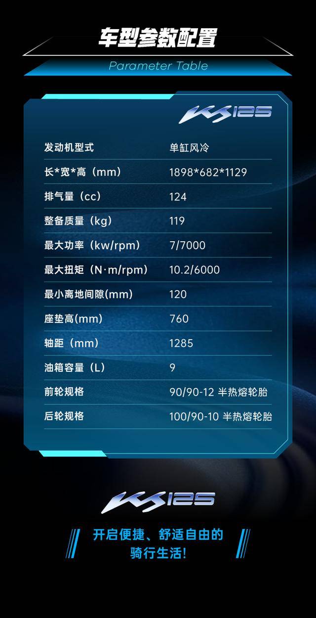 KS125在外觀設(shè)計上融入了運動元素,前臉犀利,車身線條流暢,整體造型動感十足。車身尺寸為車長1898mm、軸距1285mm,整備質(zhì)量僅為119kg,這使得車輛在操控和加速時更加輕盈。