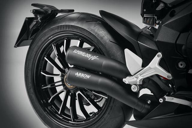 除了車輛本體之外,廠方同時推出了適用于 2025 Superveloce S Ottantesimo 限量版的專用套件,該套件包括能夠?qū)⒎逯祫恿敵鎏岣咧?153 匹馬力的 Arrow 排氣系統(tǒng),以及一個乘客鞍座外蓋。