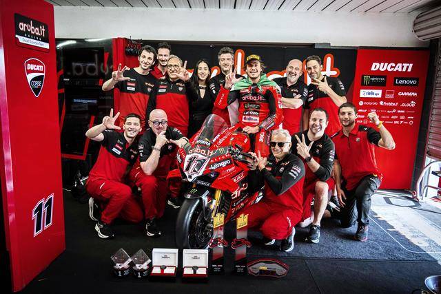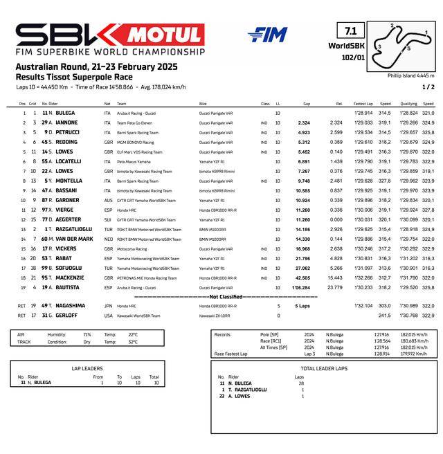 WSBK 級別,賽前的 Super Pole 超級排位賽,駕駛 11 號車的意大利車手布雷加(Nicolo Bulega)以 1 分 28.824 秒的個人最佳圈速(賽道當前的最快圈速紀錄,是布雷加去年跑出來的 1 分 27.916 秒),拿到了第一節(jié)正賽的排頭位出賽;應屆世界冠軍、駕駛 1 號車的土耳其車手拉格里奧盧(Toprak Razgatlioglu),19 號車的西班牙車手捌弟(Alvaro Bautista),分別排在第二、第三位發(fā)車。