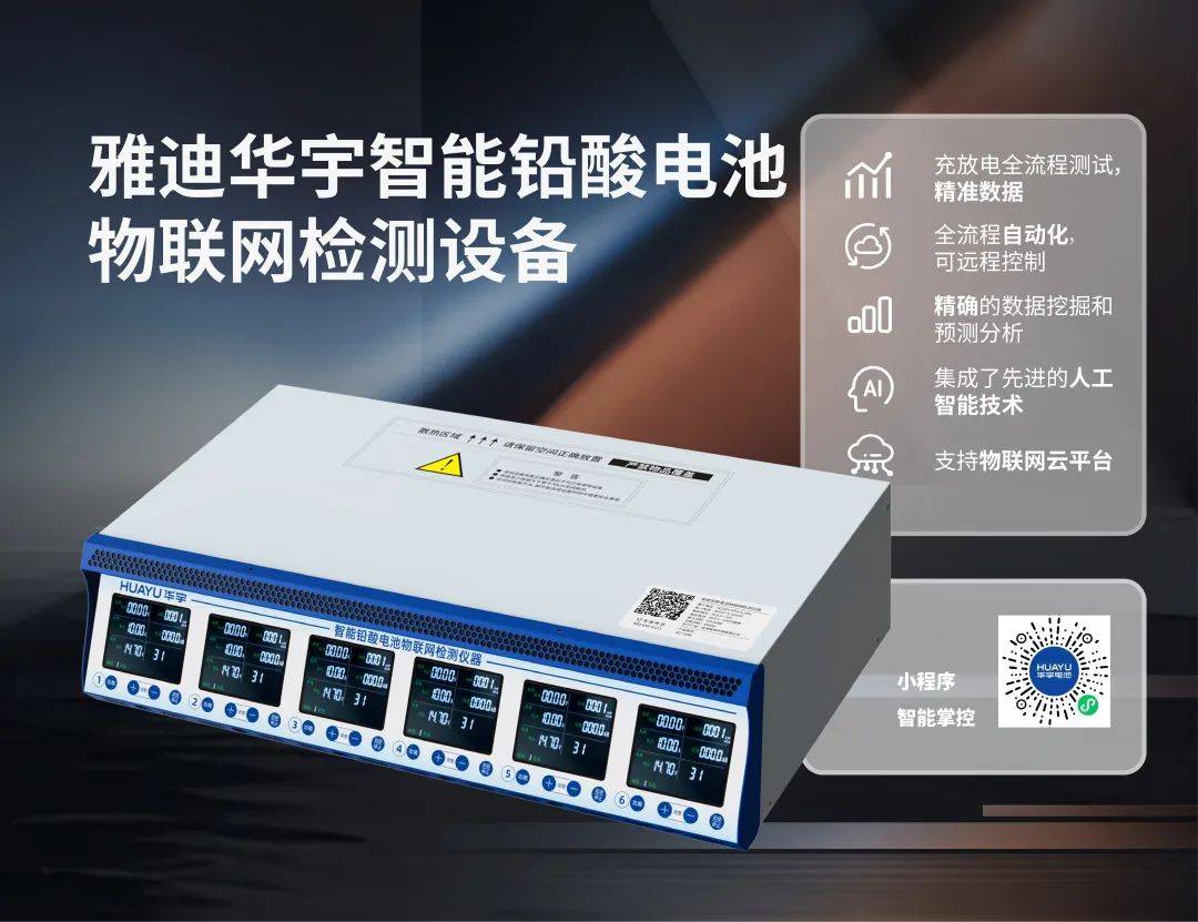 雅迪華宇電池推出“智能鉛酸電池物聯(lián)網(wǎng)檢測設(shè)備”,這是一款集獨立通道的充電、放電測試容量、回升電壓判斷、充放電自動測試、餓死電池激活、平衡性的維護(hù)等功能于一體的智能化測試設(shè)備。