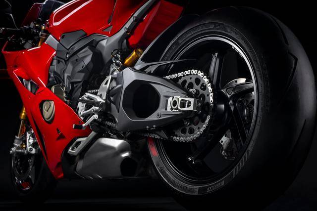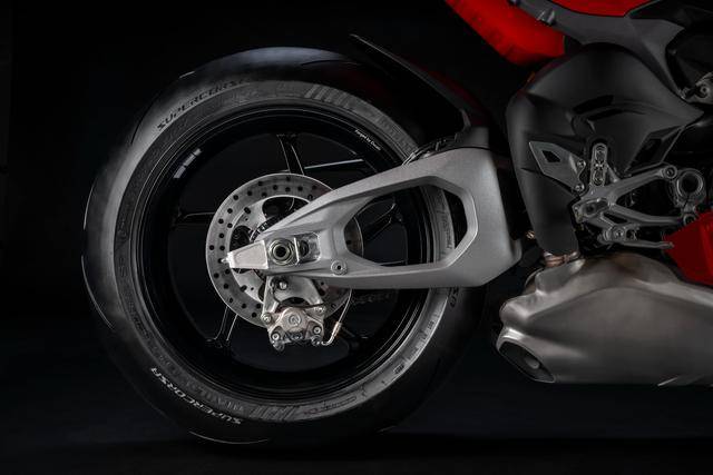 5、以全新設(shè)計的雙面式后搖臂、取代了上一代的后單搖臂:為了使新一代的 Panigale V4 更具競爭力,杜卡迪賽車部門(Ducati Corse)為車架和搖臂部分、提出了新的剛性目標,以便能夠充分利用 WorldSBK 中所使用的新型光頭輪胎的潛力。除修改了車架的橫向剛性之外,配套的新后搖臂也作出了對應(yīng)的最佳橫向剛性設(shè)置,以確保車輛即使在傾斜角度超過 60 度時、輪胎仍能保持著足夠的抓地力;同時保留了原本較高的縱向剛性,以便在車輛狂加速的過程中、可最大程度利用發(fā)動機的扭矩,而在制動時、又可以利用制動功率;