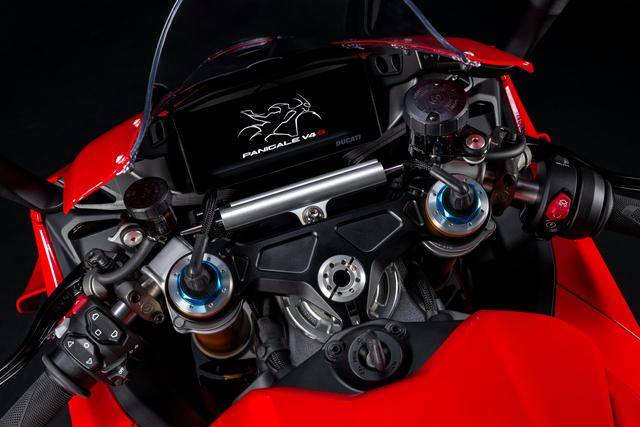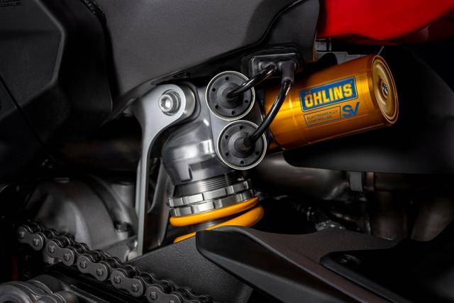 7、標準版的 2025 Panigale V4 采用了 Showa 的前叉(叉芯口徑為 43 mm、行程為 125 mm)、Sachs 的后減震(行程為 130 mm);而 S 版則采用了 Ohlins 配套的 NPX/TTX 第三代電子控制前后懸掛系統(tǒng);