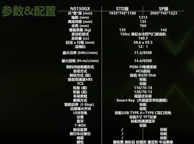 高配版本還有帶胎壓監(jiān)測、行車記錄儀還有50L快拆金屬尾箱加上自帶的超大座桶空間。此外NS150GX還配備5種花色可以選擇。