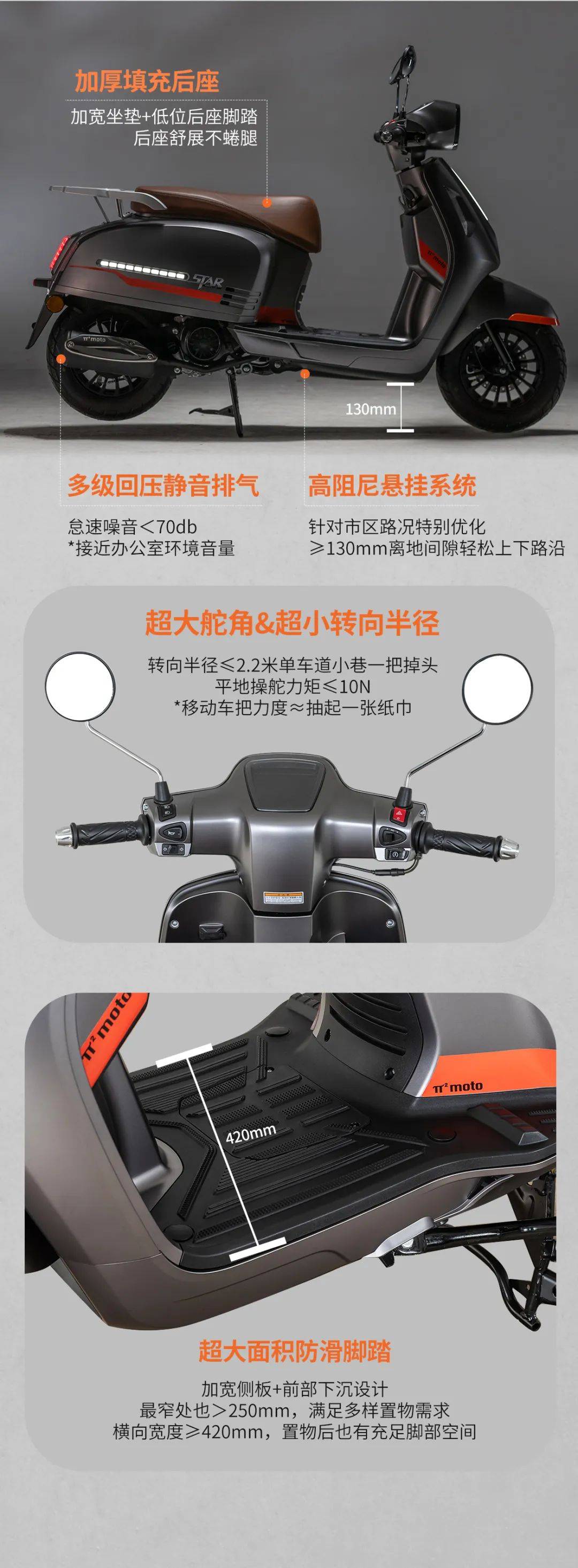 細(xì)節(jié)控狂喜的「通勤友好」設(shè)計(jì), 2.2米最小轉(zhuǎn)彎半徑窄巷輕松掉頭,420mm超寬防滑踏板,輕松置物解放雙腿,70分貝怠速噪音接近辦公室環(huán)境聲級。前碟后鼓剎車+3.50-10真空胎組合穩(wěn)控濕滑路面,高阻尼懸掛過濾80%路面顛簸。現(xiàn)在入手享2年不限里程質(zhì)保,APP/400熱線/全國聯(lián)保三重護(hù)航。6588元帶走科幻座駕,年輕,就要騎出星紀(jì)元!
