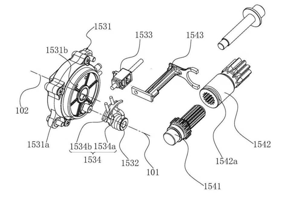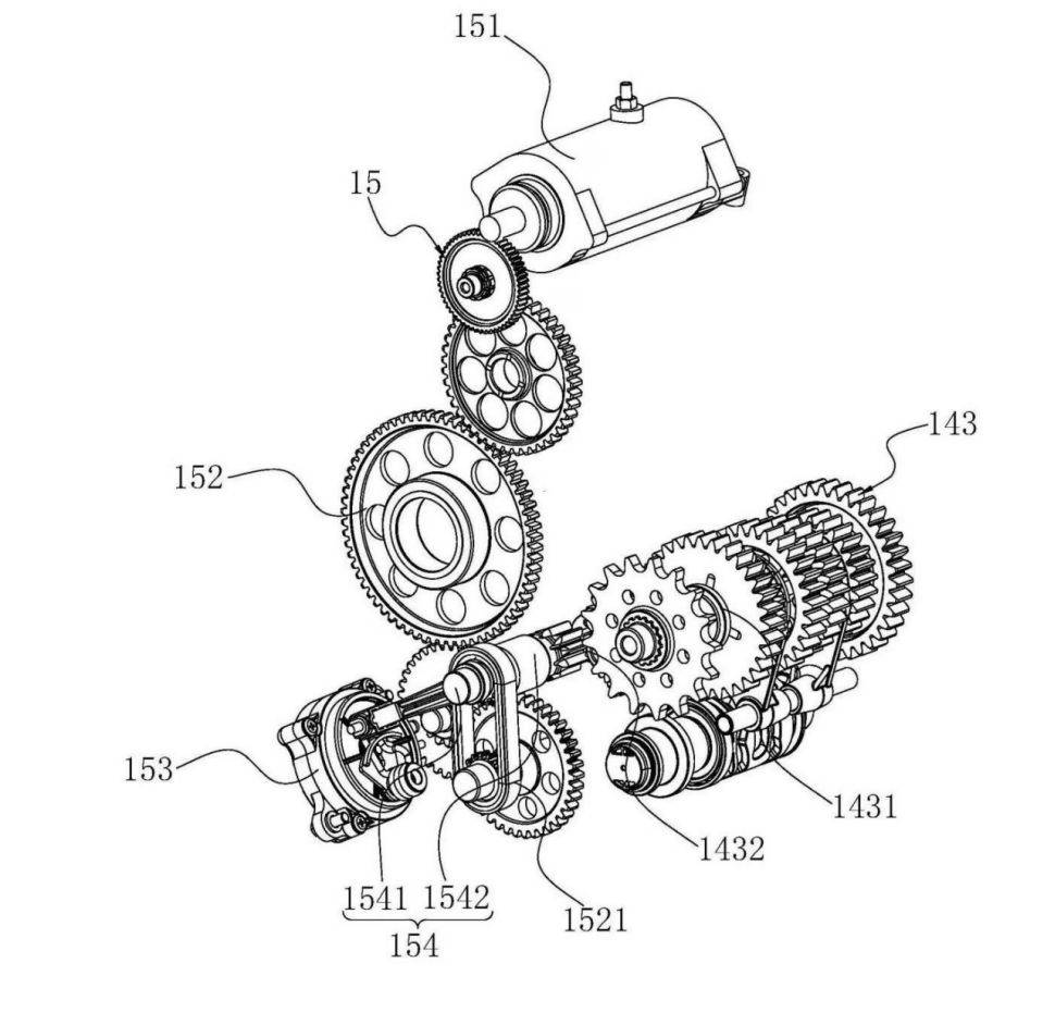 專利曝光:起動電機(jī)驅(qū)動倒車,結(jié)合電子控制系統(tǒng)根據(jù) 春風(fēng) 提交的專利,1250TR-G 的電動倒車系統(tǒng)是通過起動馬達(dá)驅(qū)動,與多數(shù)高端旅跑車型采用的機(jī)制相似。 起動馬達(dá)(151 號)位于 V 型引擎的夾角內(nèi),原本僅負(fù)責(zé)啟動引擎,如今透過額外齒輪機(jī)構(gòu)(152 號)與電子作動器,可以在特定條件下讓摩托車倒退。